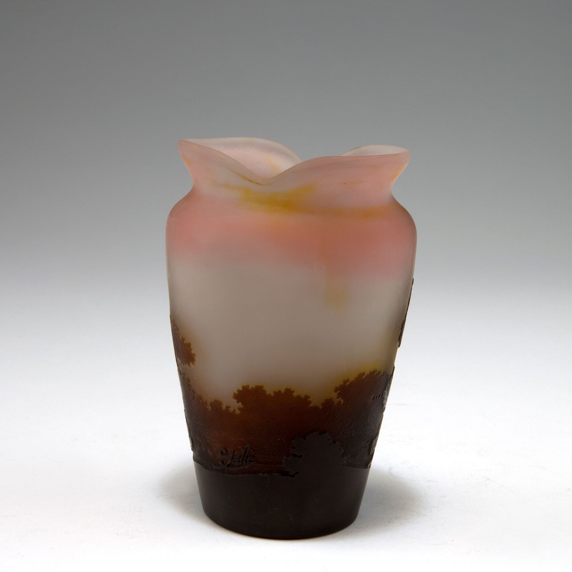 Emile Gallé, Nancy. 'Paysage de verre' vase, 1906-14. H. 13.1 cm. Cased glass, clear, pink, pale amber and brown. Multiply etched pattern with landscape at sunset. Signed: Gallé.
