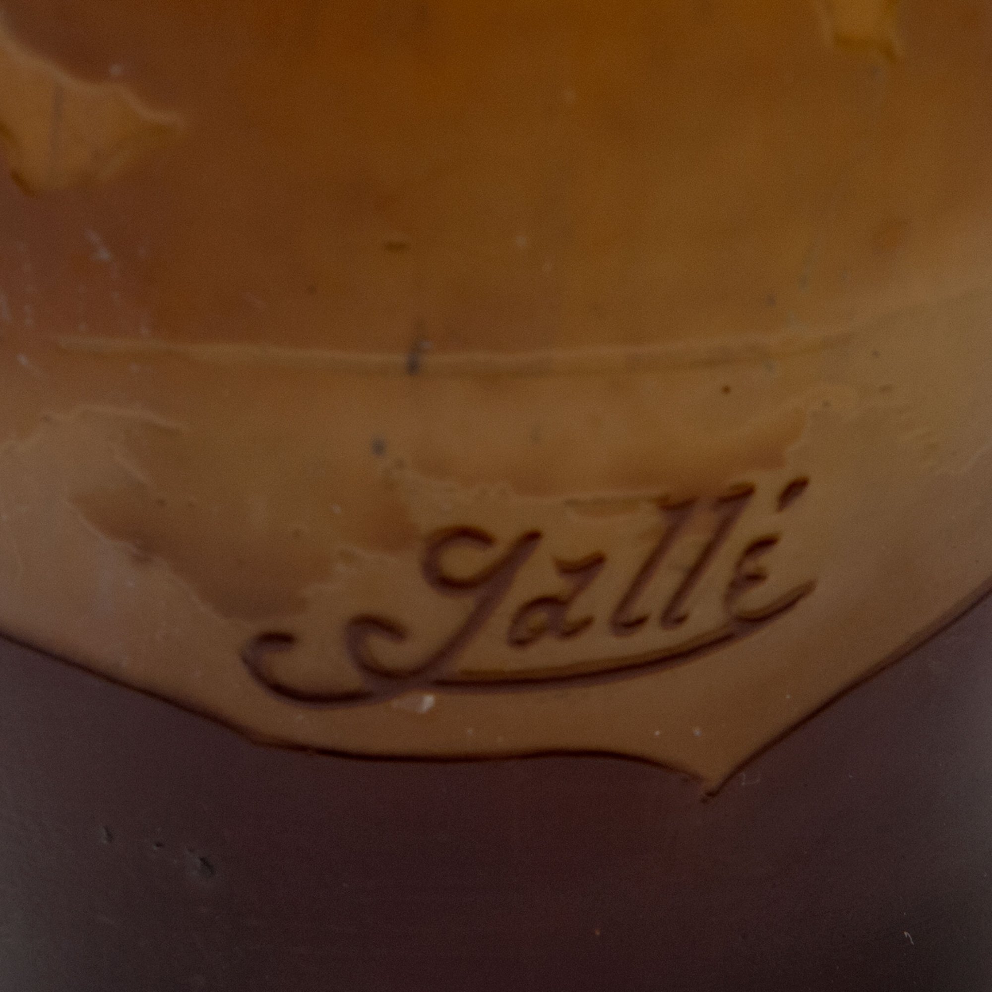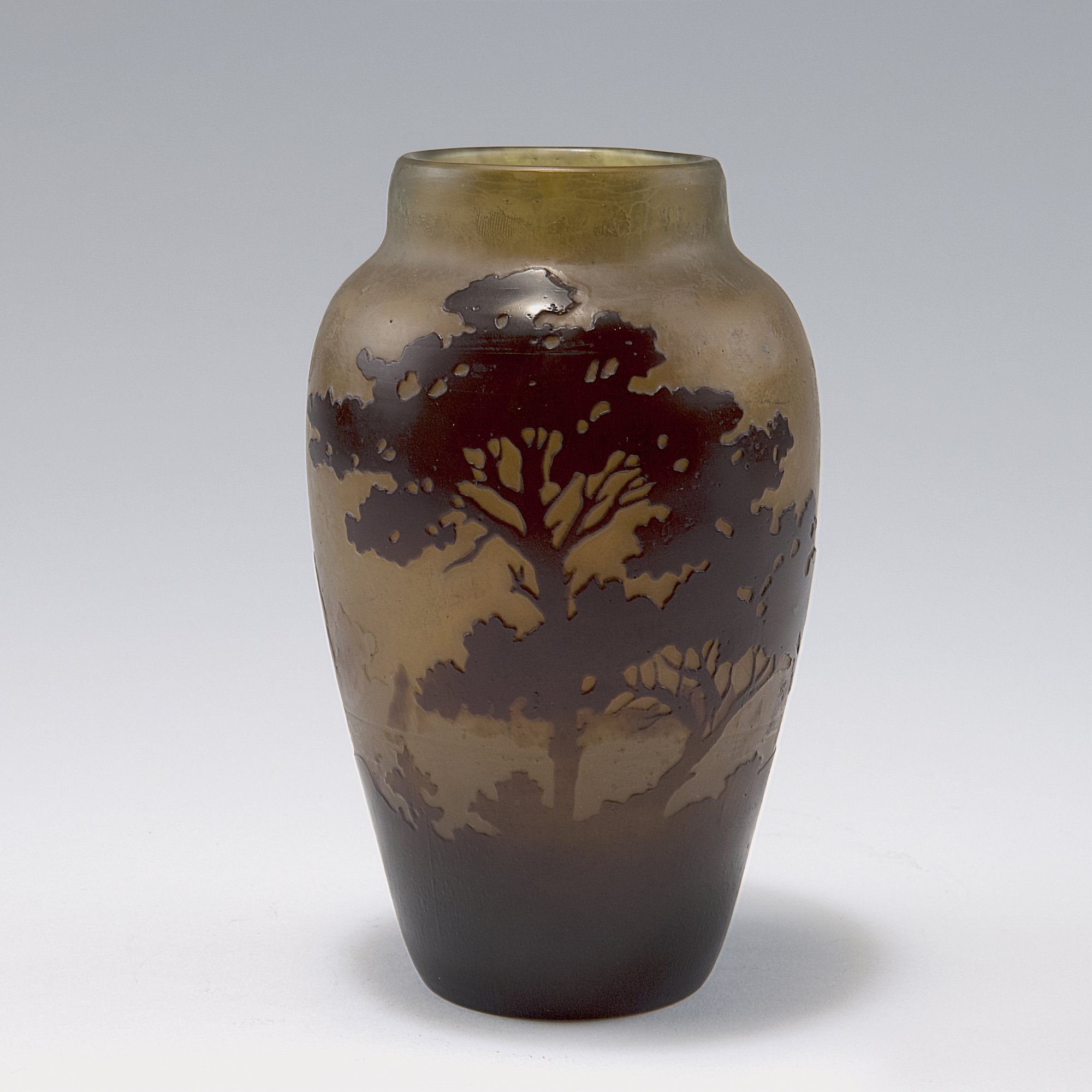 Emile Gallé, Nancy. 'Paysage lacustre' vase, 1906-14. H. 15.5 cm. Cased glass, green and dark brown. Multiply etched pattern with landscape at night. Signed: Gallé.