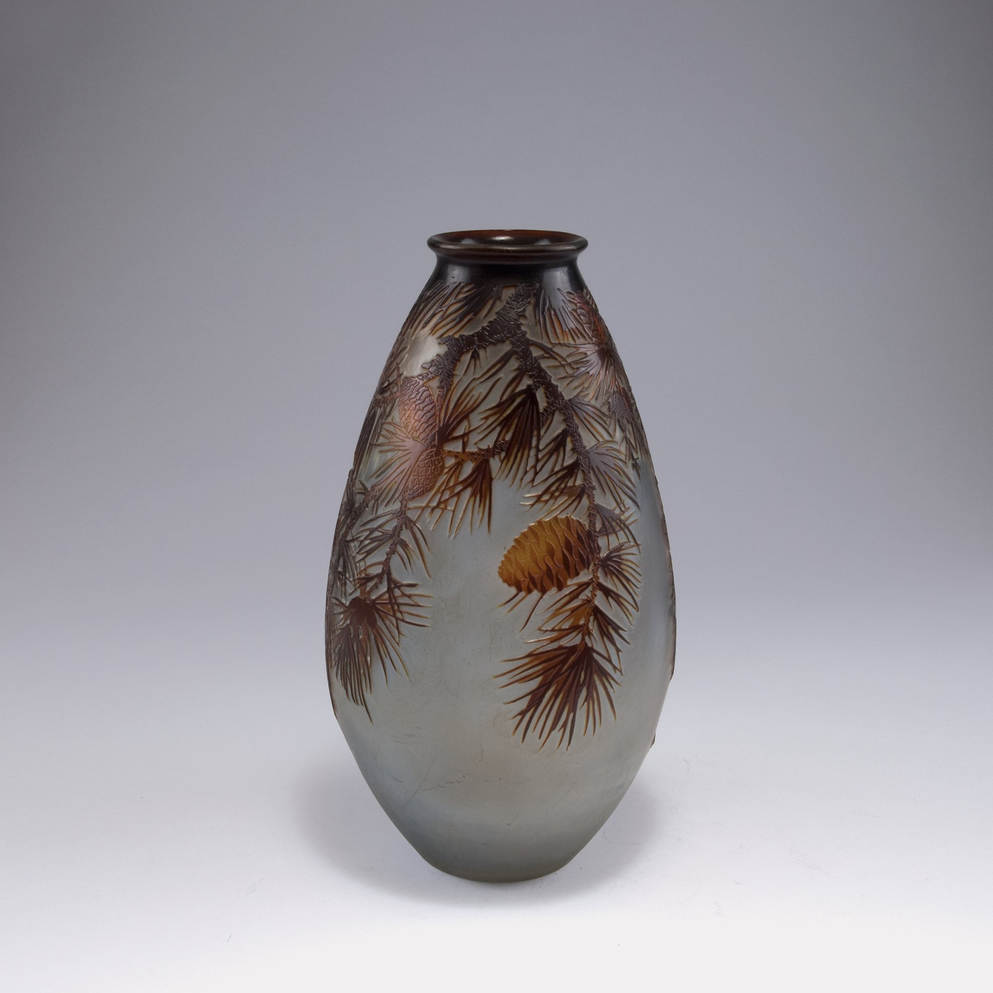 Emile Gallé, Nancy. 'Pomme de pin' vase, 1910-14. H. 30 cm. Cased glass, pale blue, clear and brown. Multiply etched pattern with pine branches and cones. Signed: Gallé.