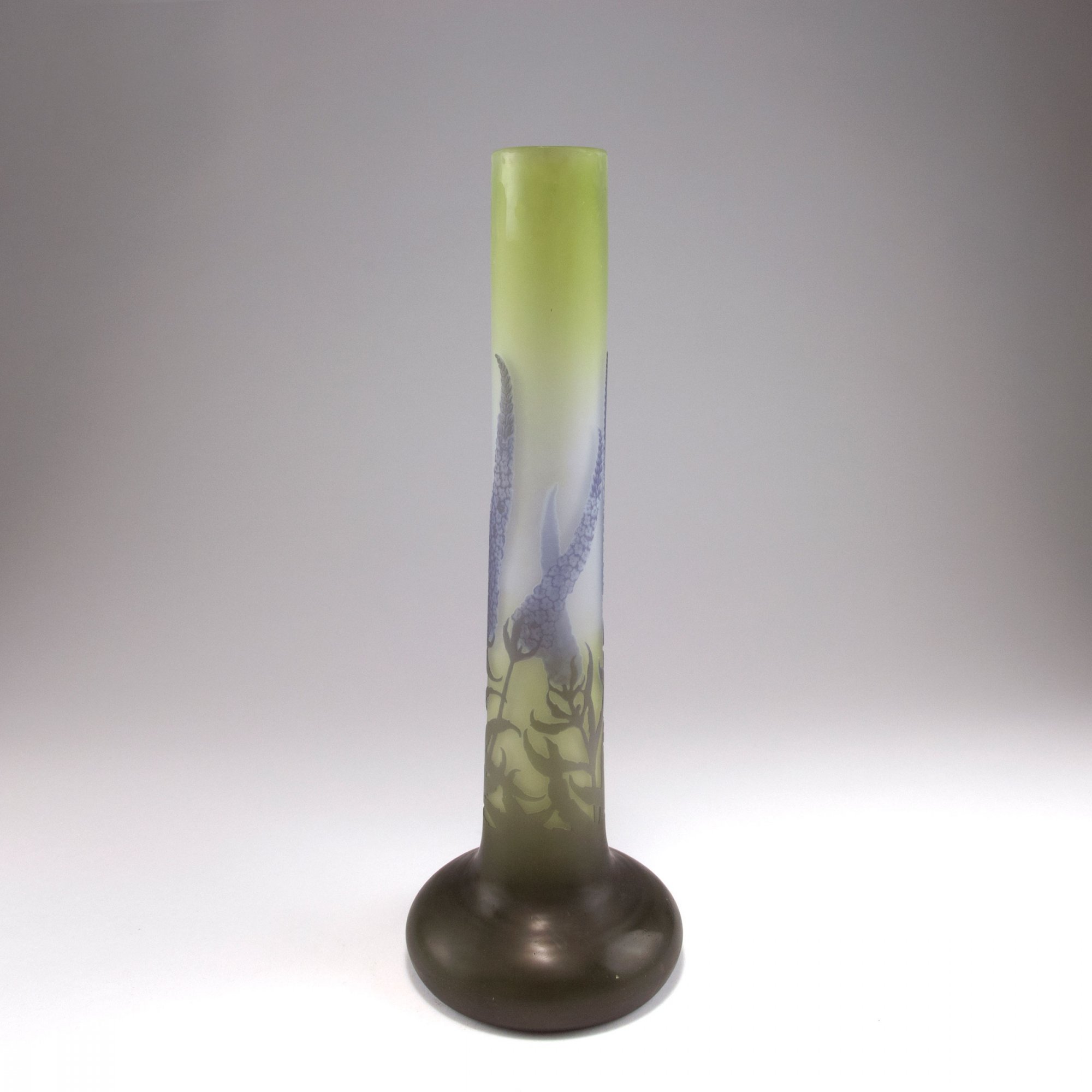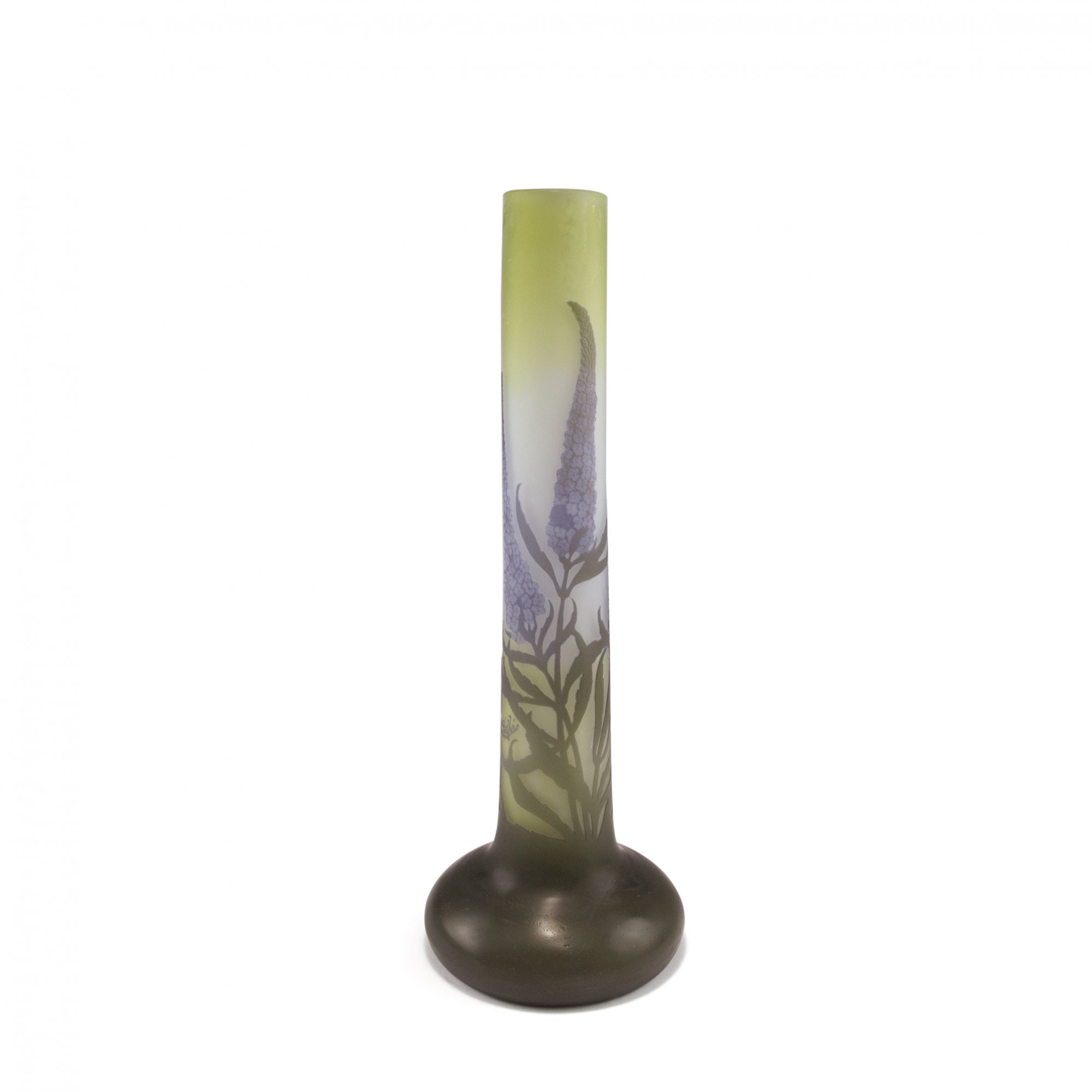 Emile Gallé, Nancy. Tall 'Buddleia' vase, 1906-14. H. 44.7 cm. Cased glass, clear, green and purple. Multiply etched pattern with summer lilac. Signed: Gallé.