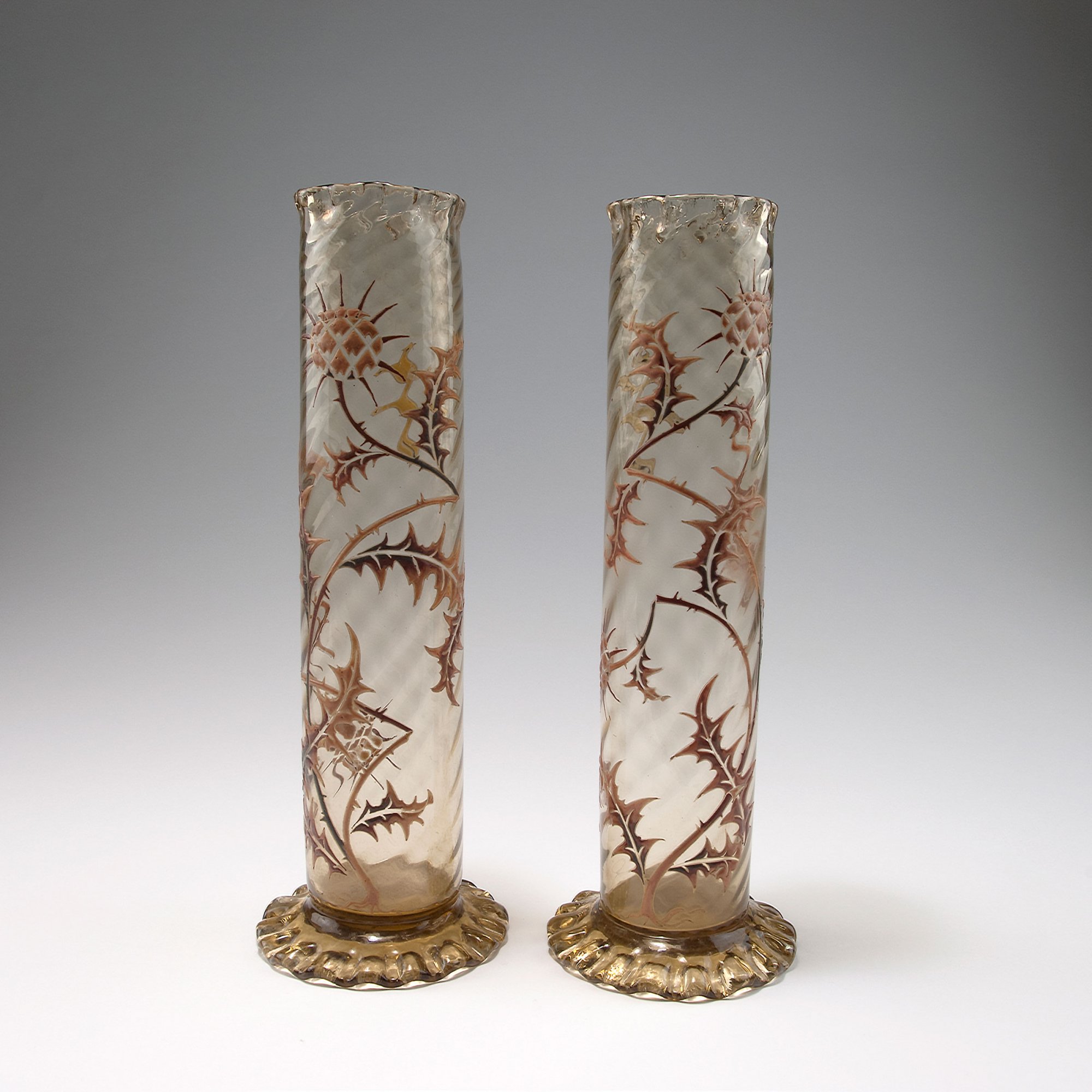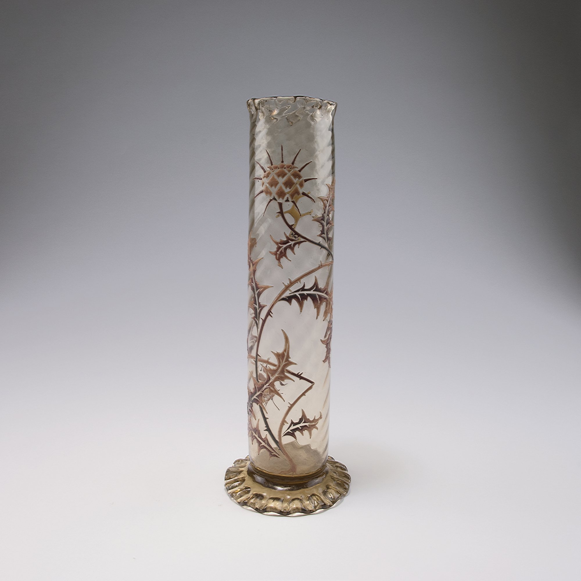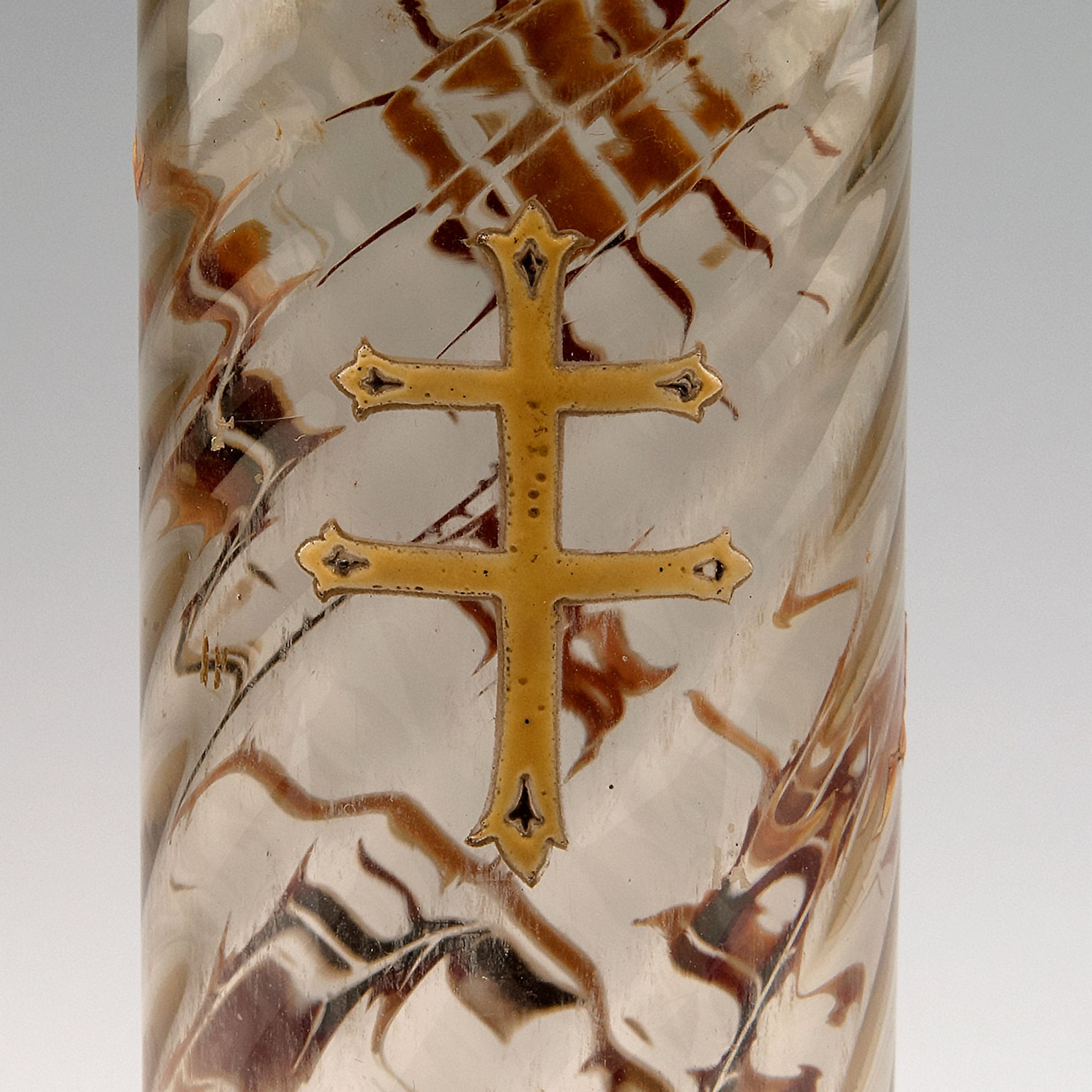 Emile Gallé, Nancy. Tall 'Chardon lorrain' vase, c1884. H. 33 cm. Amber glass, optically blown, brown enamel, thistles and cross of Lorraine crème-white. Signed: E. Gallé déposé.