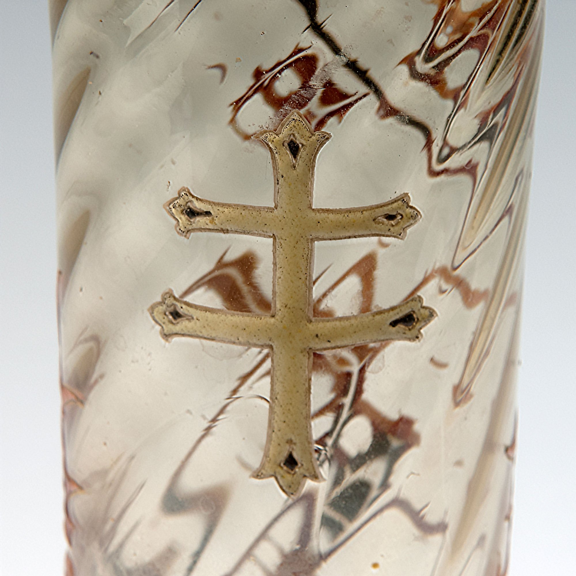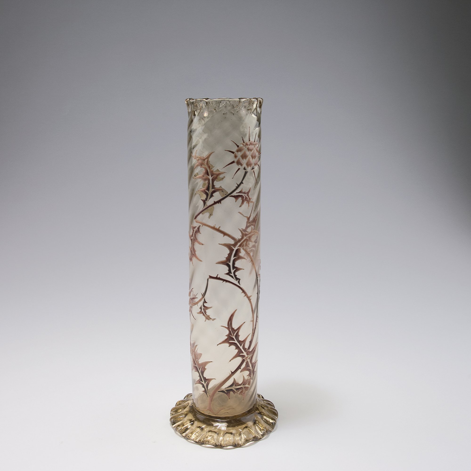 Emile Gallé, Nancy. Tall 'Chardon lorrain' vase, c1884. H. 32,6 cm. Amber glass, optically blown, brown enamel, thistles and cross of Lorraine crème-white. Signed: E. Gallé déposé.