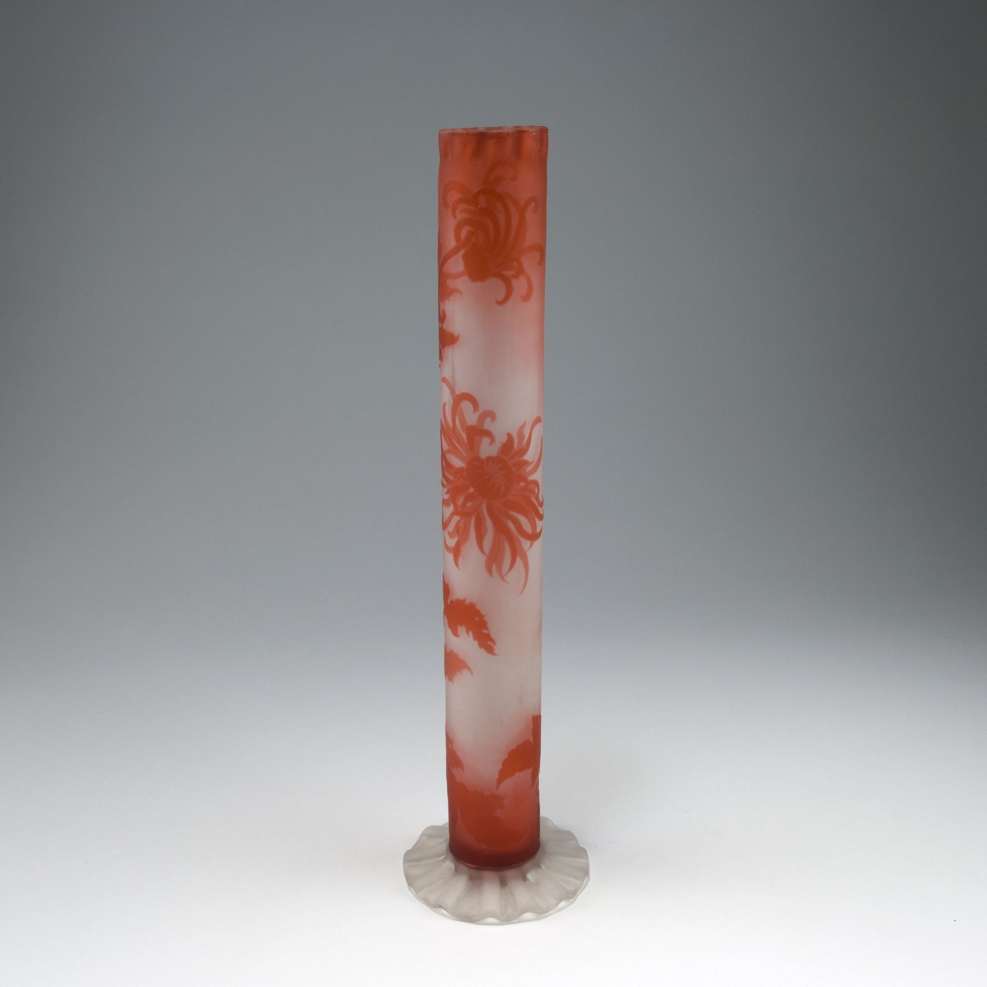 Emile Gallé, Nancy. Tall 'Chrysanthèmes' vase, c1900. H. 39 cm. Cased glass, clear and red. Etched pattern with chrysanthemum. Signed: Gallé.