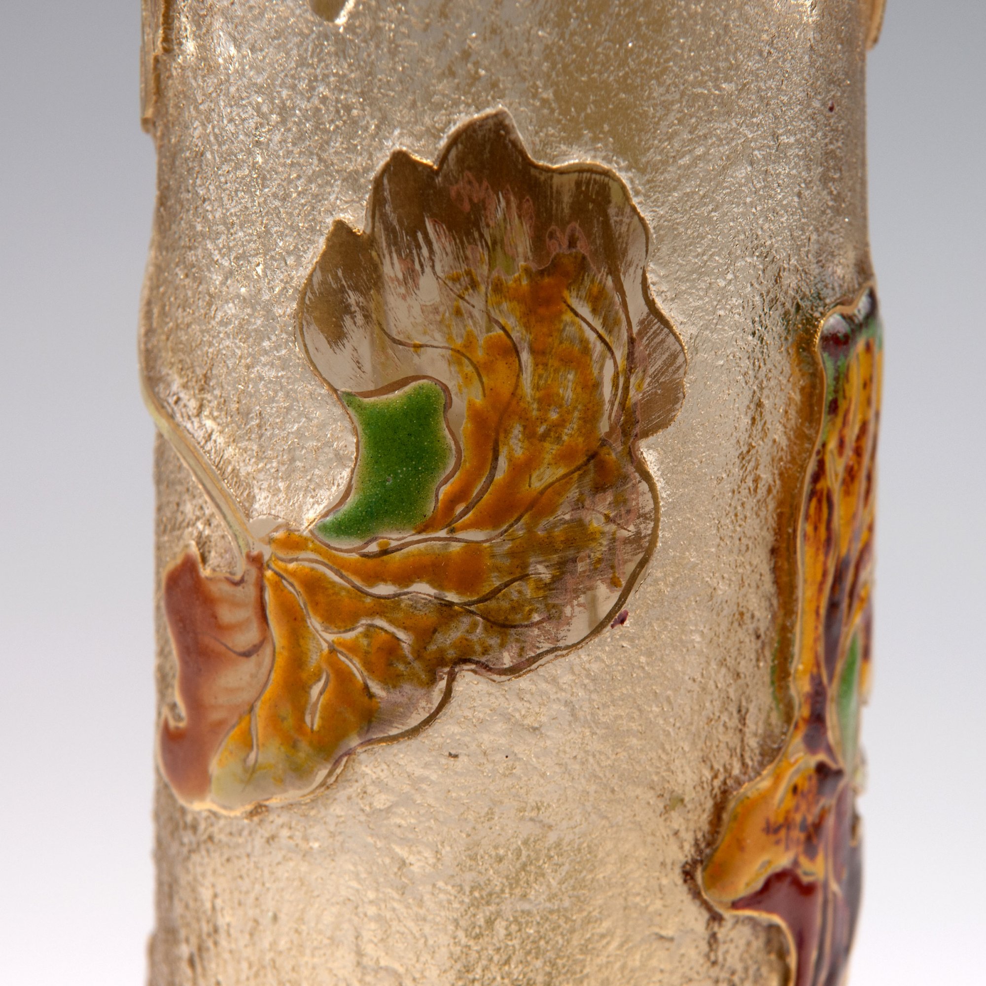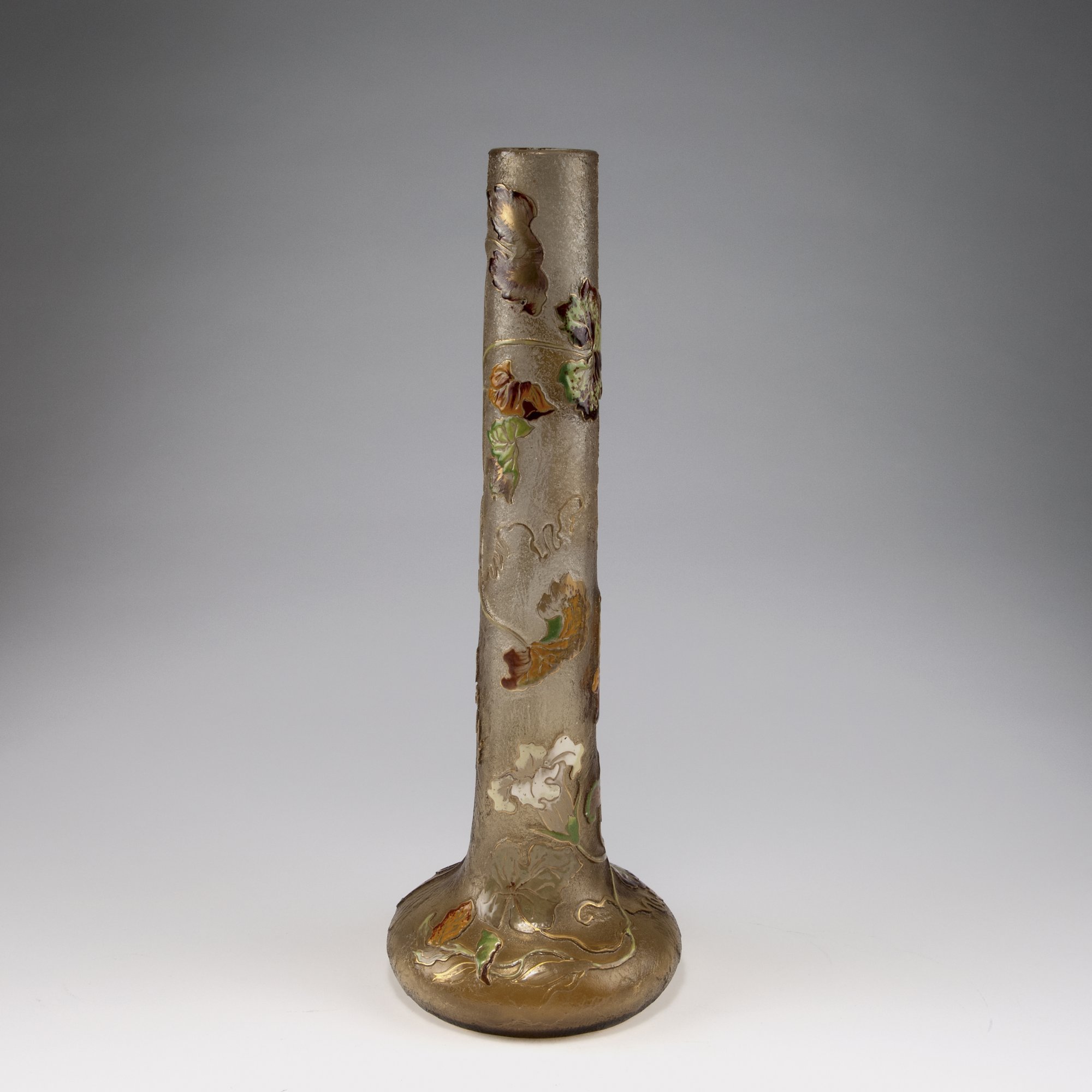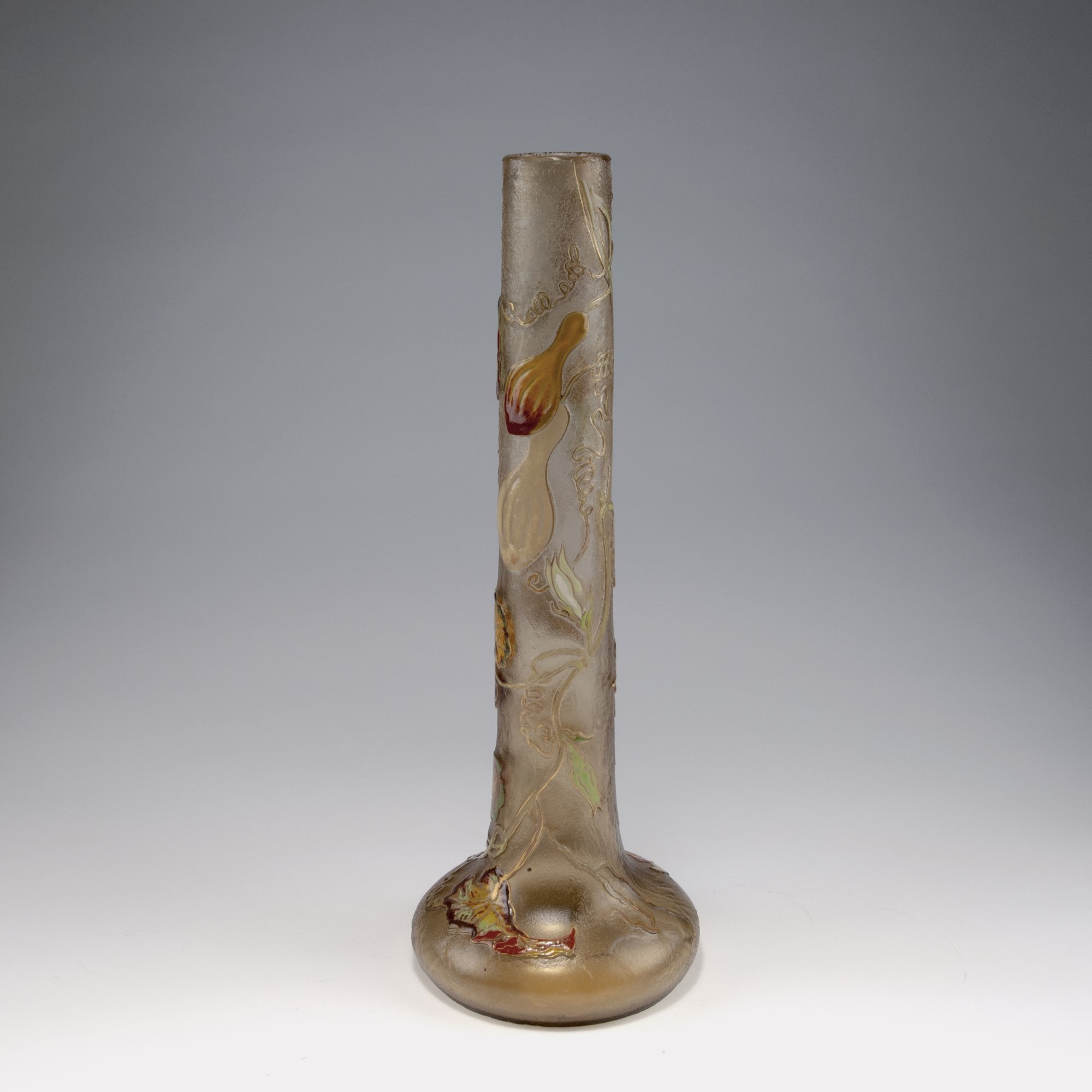 Emile Gallé, Nancy. Tall 'Coloquintes' vase, c1900. H. 44.4 cm Pale amber glass, rough ground, enamelled and gilded. Bottle gourd. Signed: GALLÉ.