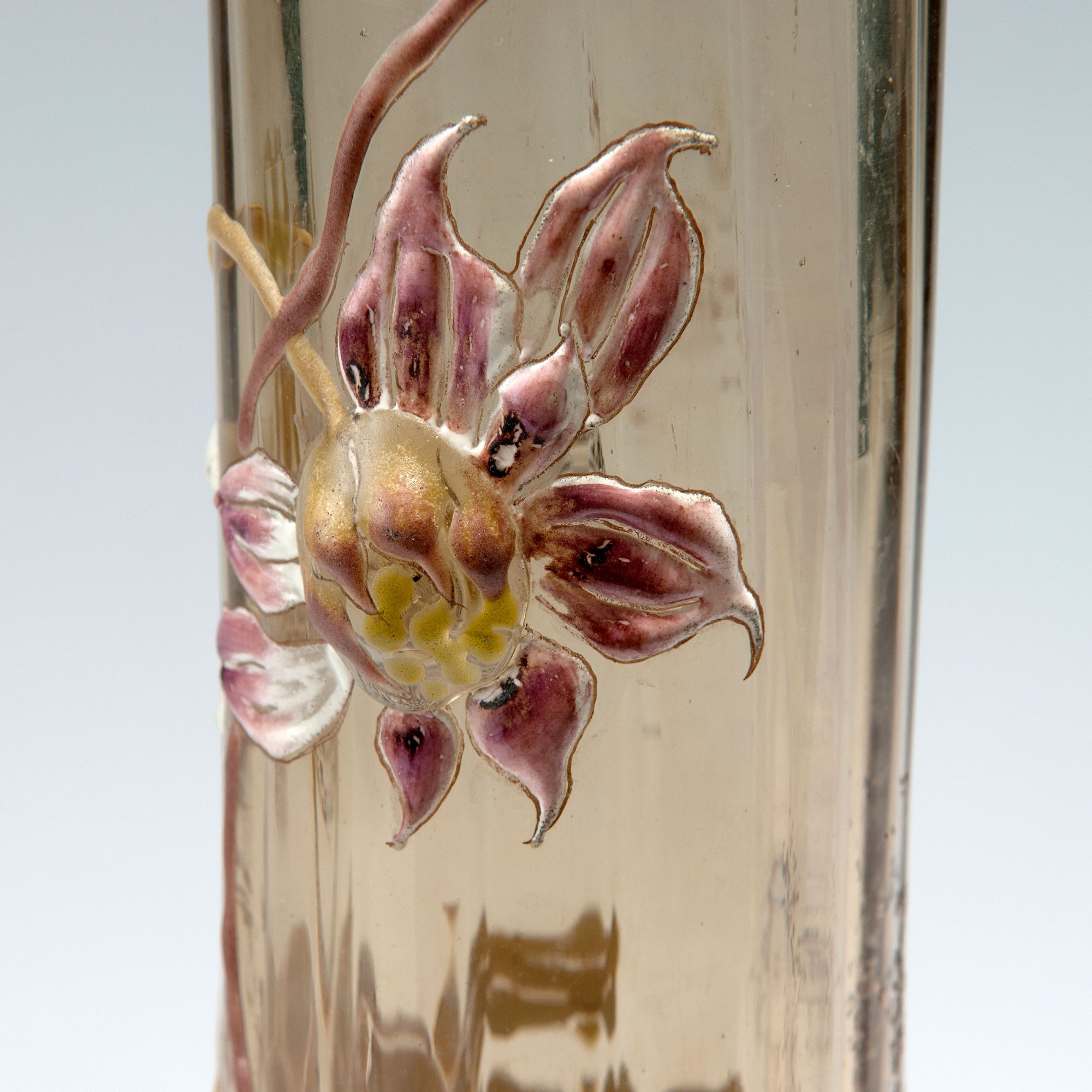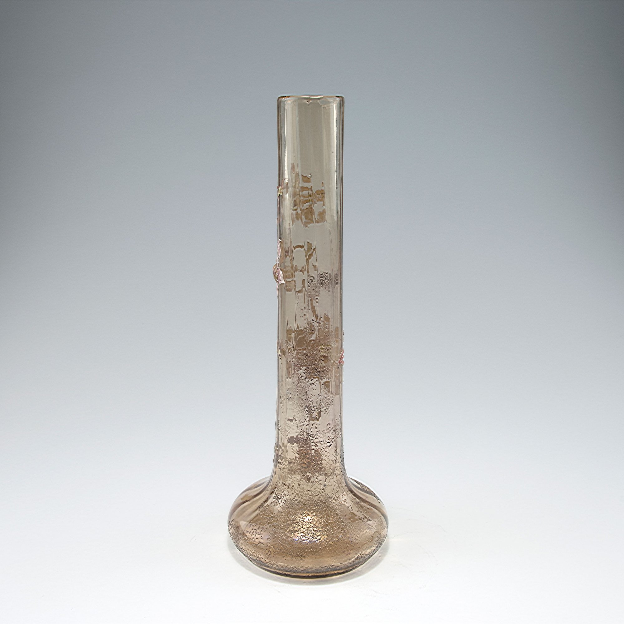 Emile Gallé, Nancy. Tall 'Dahlias' vase, 1890-94. H. 40 cm. Smoke coloured glass, optically blown. Etched and enamelled pattern with dahlias, three applied cabochons as flowers, part gilded. Signed: Cristallerie d'Emile Gallé modèle et décor déposés with flower.