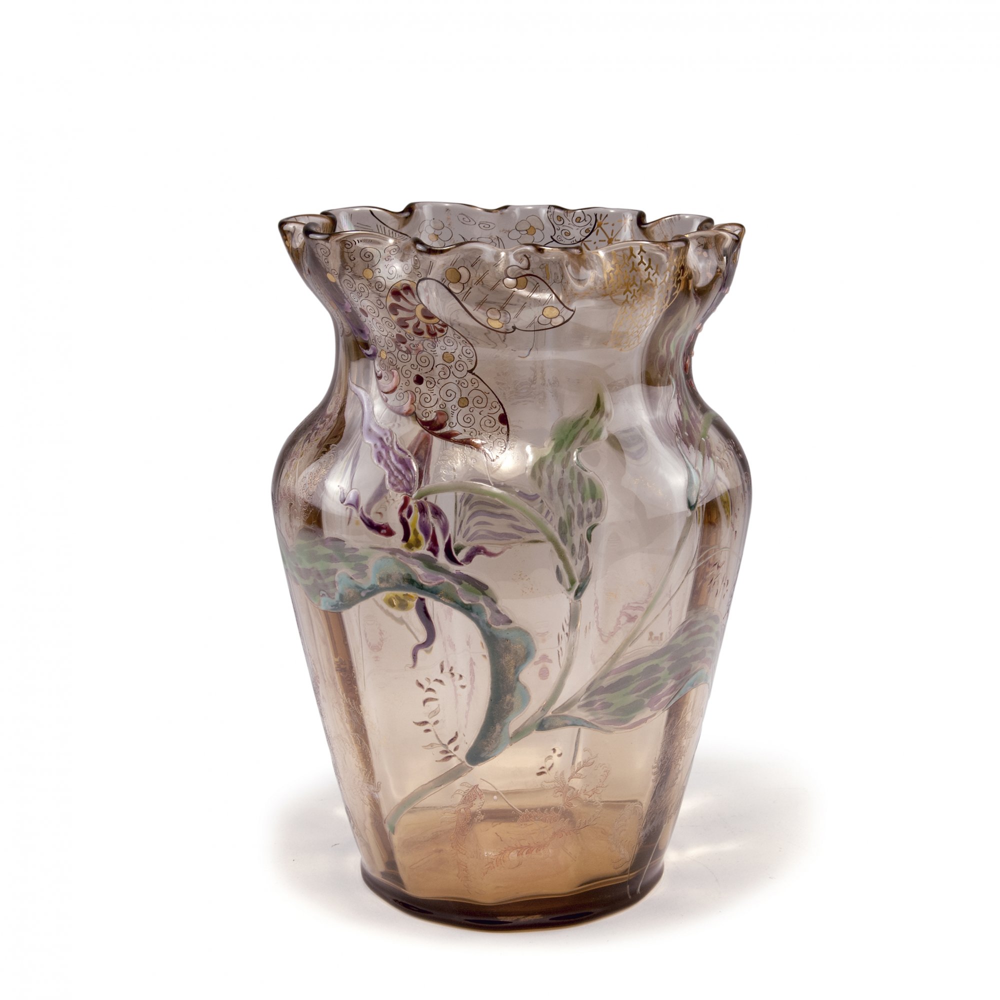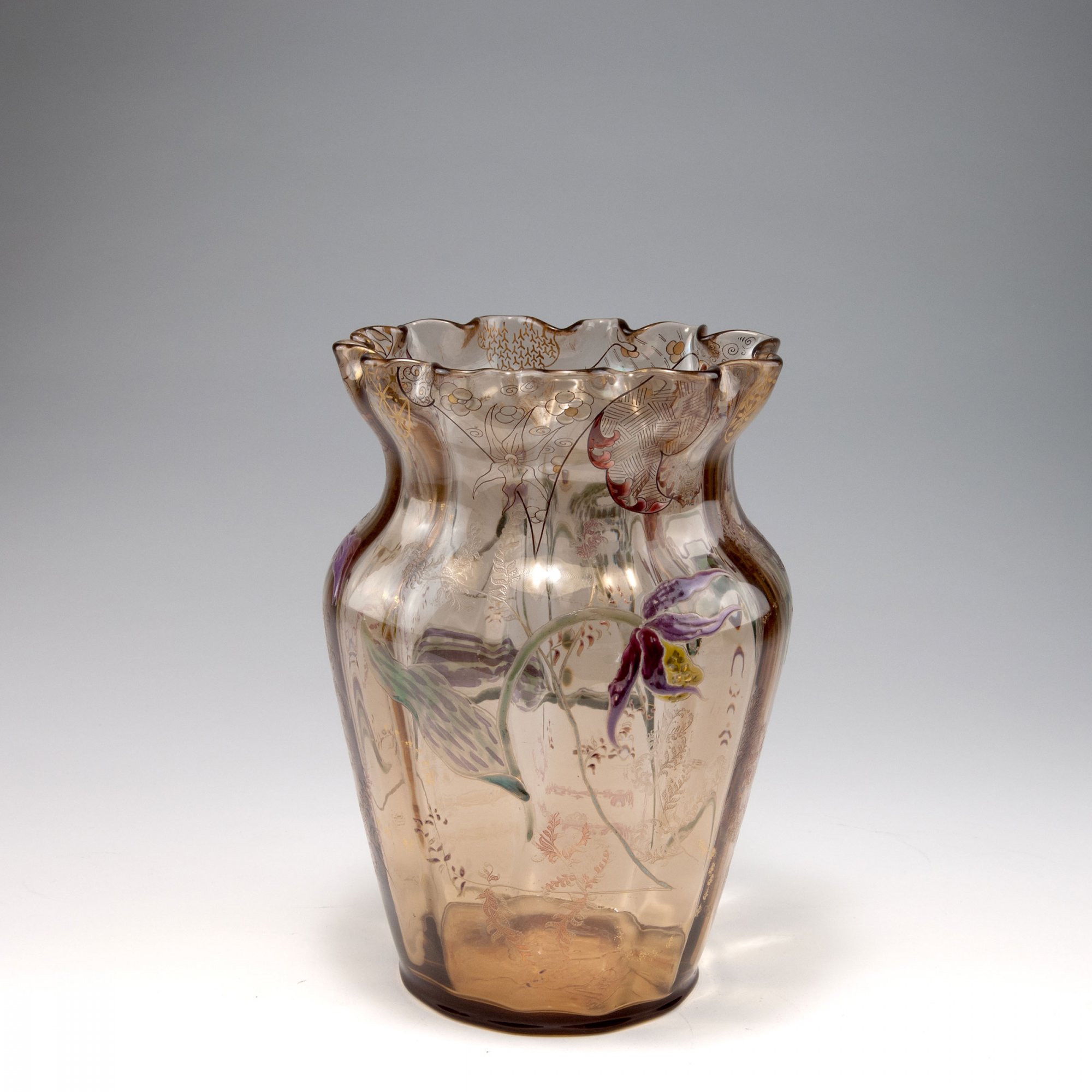 Emile Gallé, Nancy. Tall 'Sabot de Vénus' vase, 1890-94. H. 26.2 cm. Made in Meisenthal. Pale brown glass, optically blown. Etched and enamelled pattern with lady's slippers and fern. Japanesque pattern, translucid enamel and gold below the rim. Signed: Emile Gallé déposé (in an orchid).