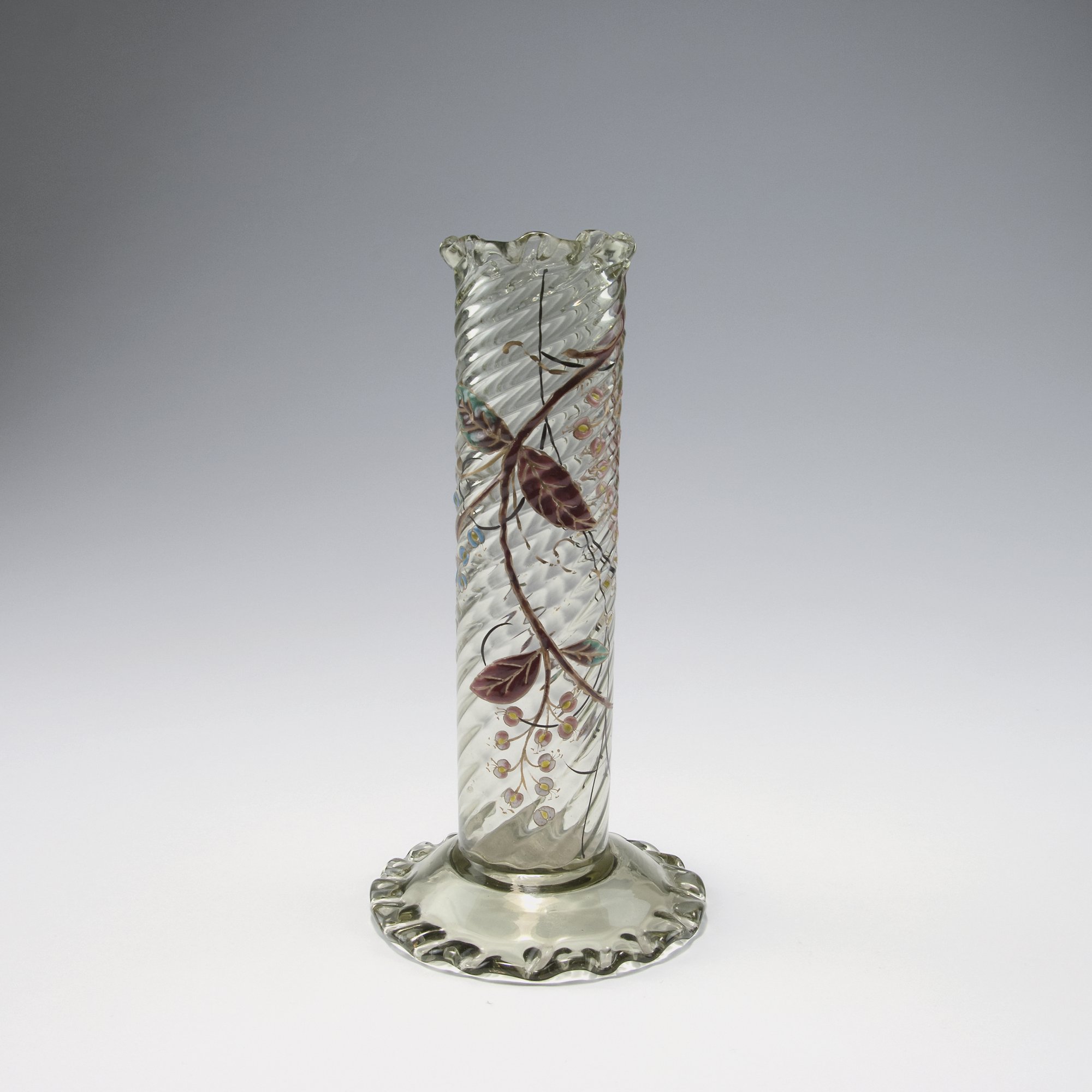 Emile Gallé, Nancy. Tall vase, 1890-94. H. 21 cm. Smoke coloured glass, optically blown. Relief enamel, gold-hue, branches and panicles. Signed: E Gallé Nancy.
