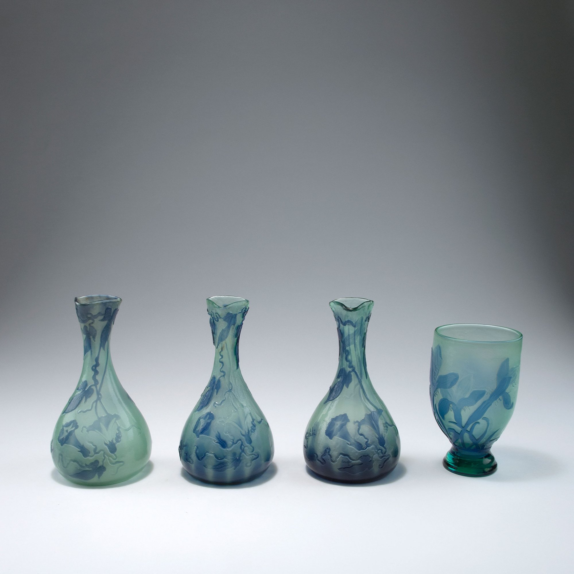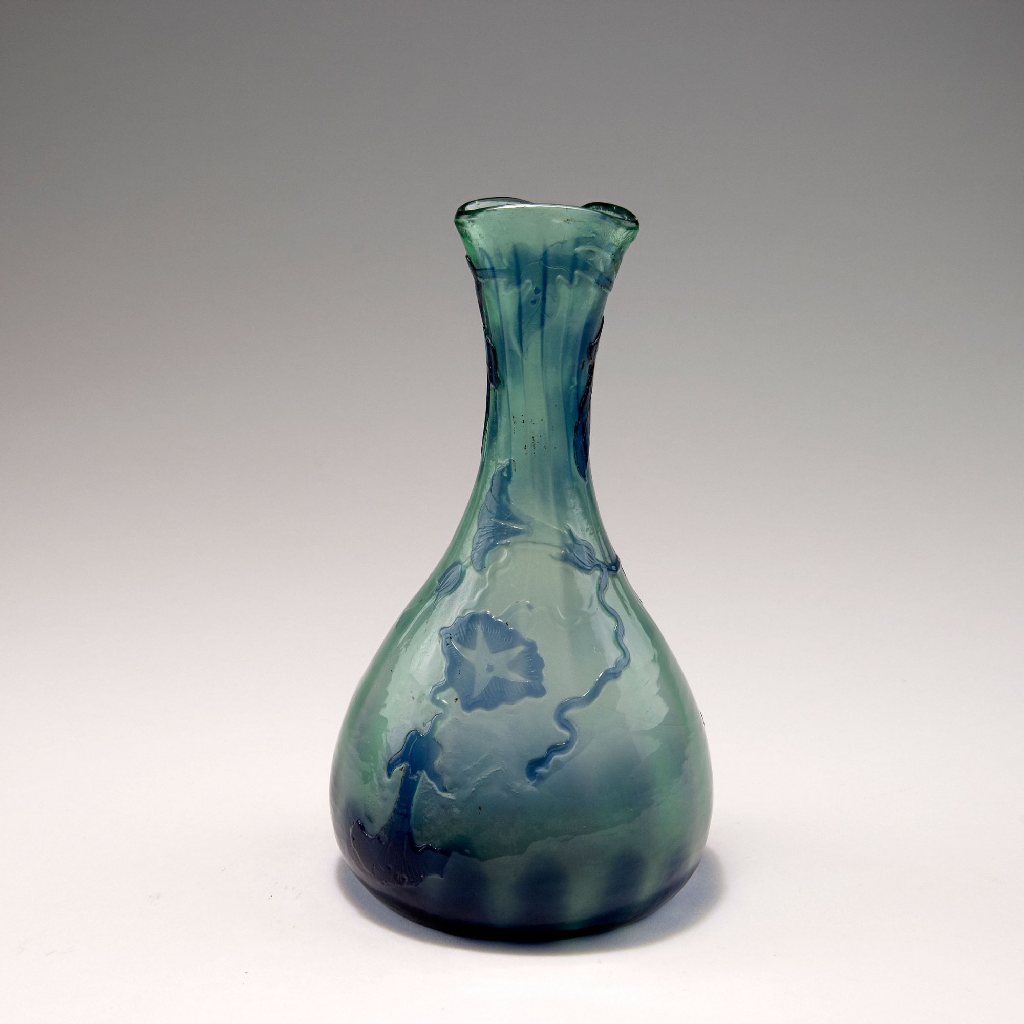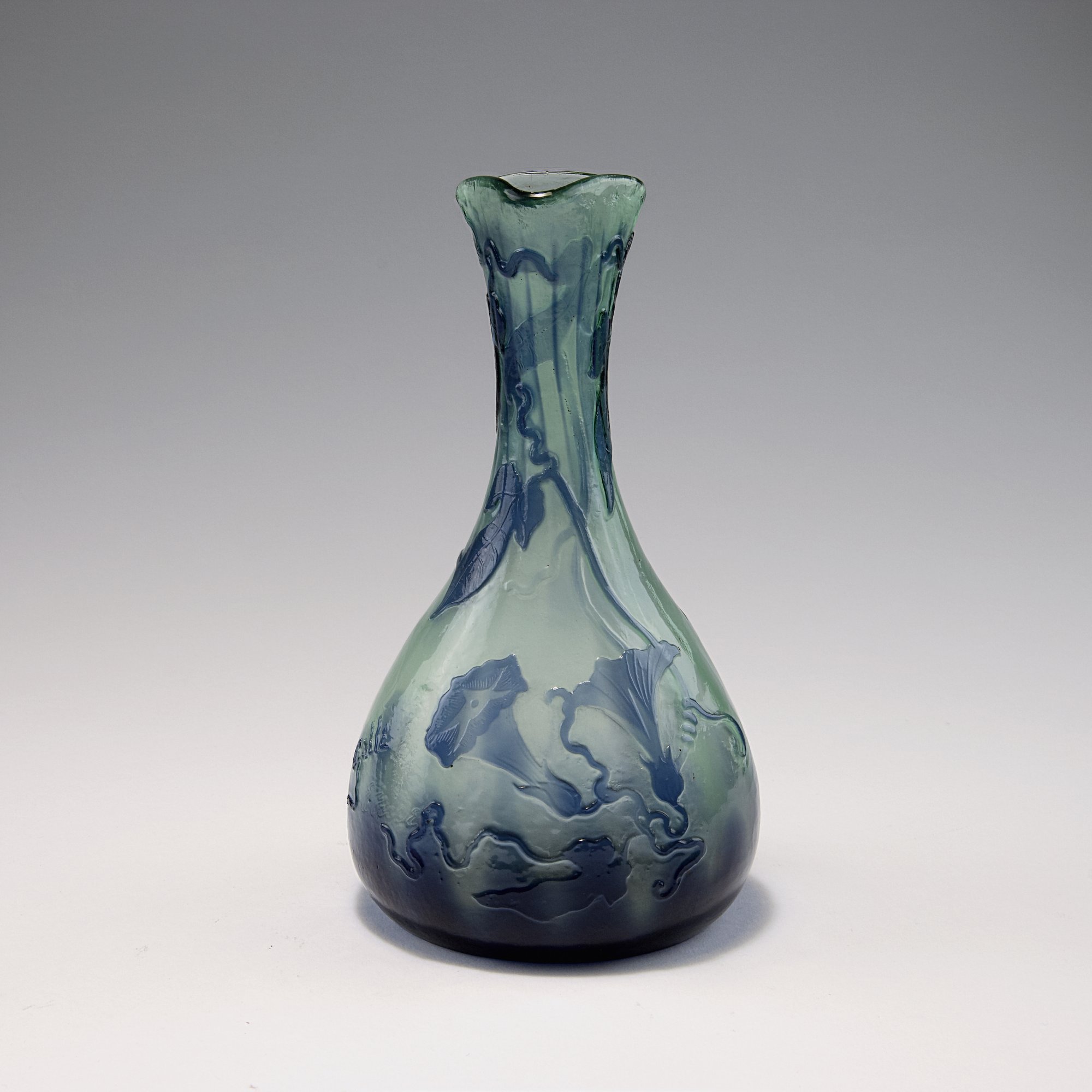 Emile Gallé, Nancy. 'Volubilis' vase, c1900. H. 19.6 cm. Glass, optically blown, pale blueish-greenish, clear and purple, etched pattern. Signed: Gallé.