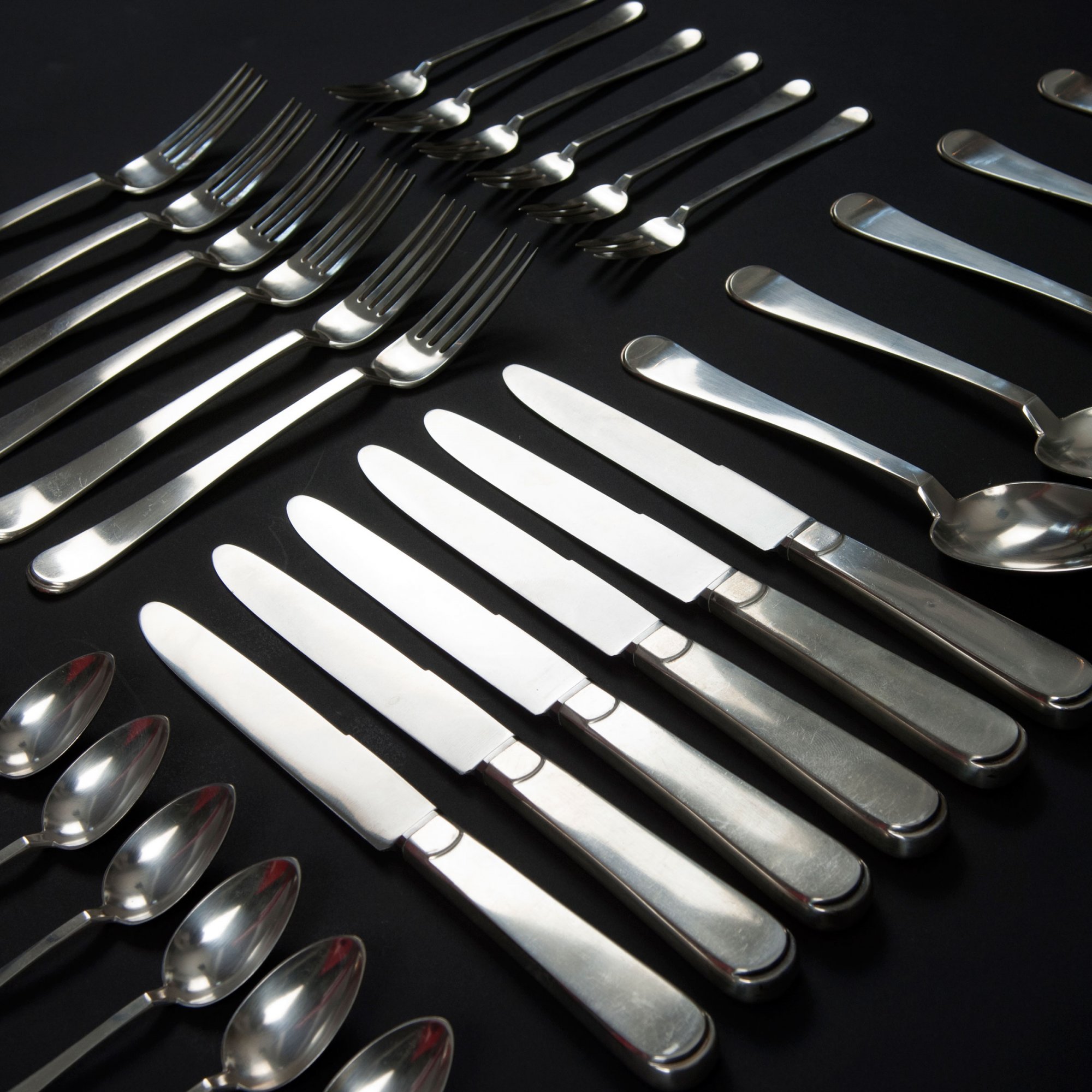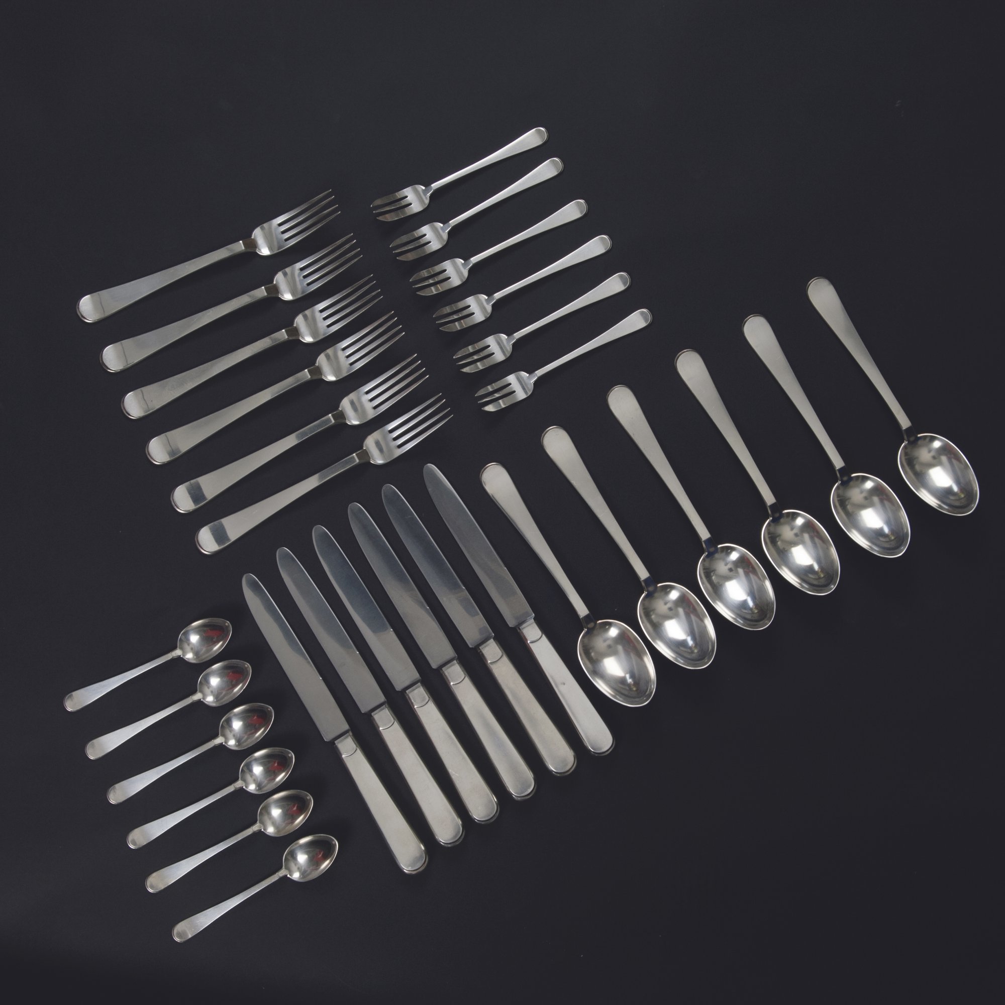 Franz Bahner AG, Düsseldorf. Flatware, c1930. 30 pieces. Soup spoons, L. 21 cm; forks, L. 21 cm; knives, L. 25 cm; coffee spoons, L. 13.5 cm; cake forks, L. 14.8 cm. Designed by Gebhard Duve. Silver, steel blades. Marked: 800, German hallmarks, maker's mark.