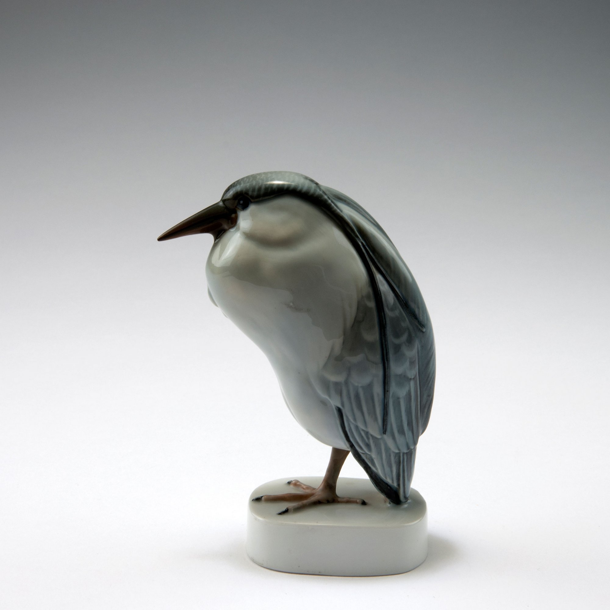Gerhard Schliepstein. Great White Egret, 1923. H. 13.8 cm. Made by Rosenthal, Selb, c1923. Porcelain, white, glazed, underglaze, grey and brown. Base marked: Schliepstein. Bottom: Maker's mark, K-686.