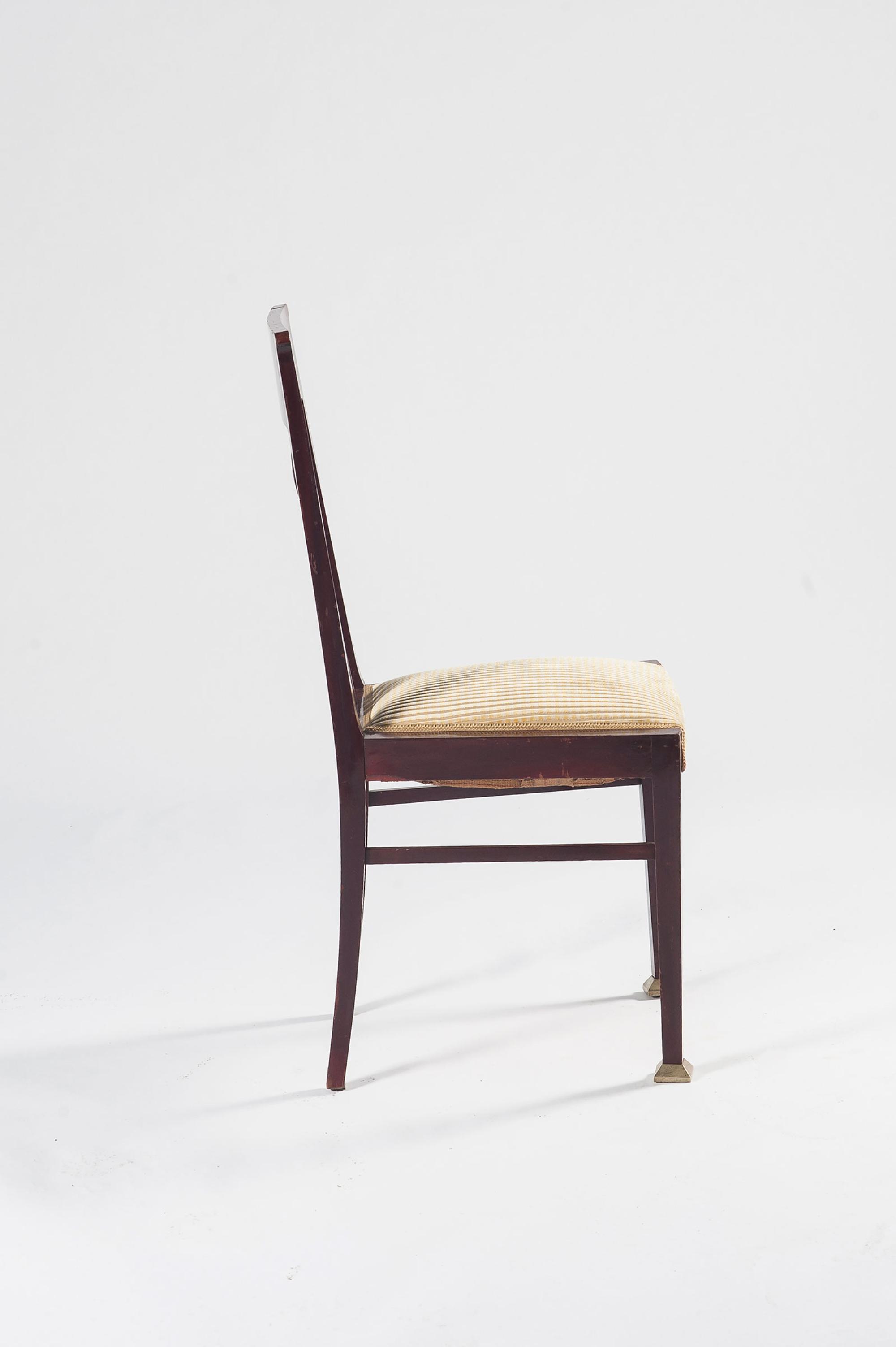 Hans Christiansen. Salon chair, 1908-10. H. 90 cm, 42.5 x 47 cm. Made by Ludwig Schäfer, Mainz (attributed). Mahogany, mahogany veneer, aluminium inlay, yellow corduroy.