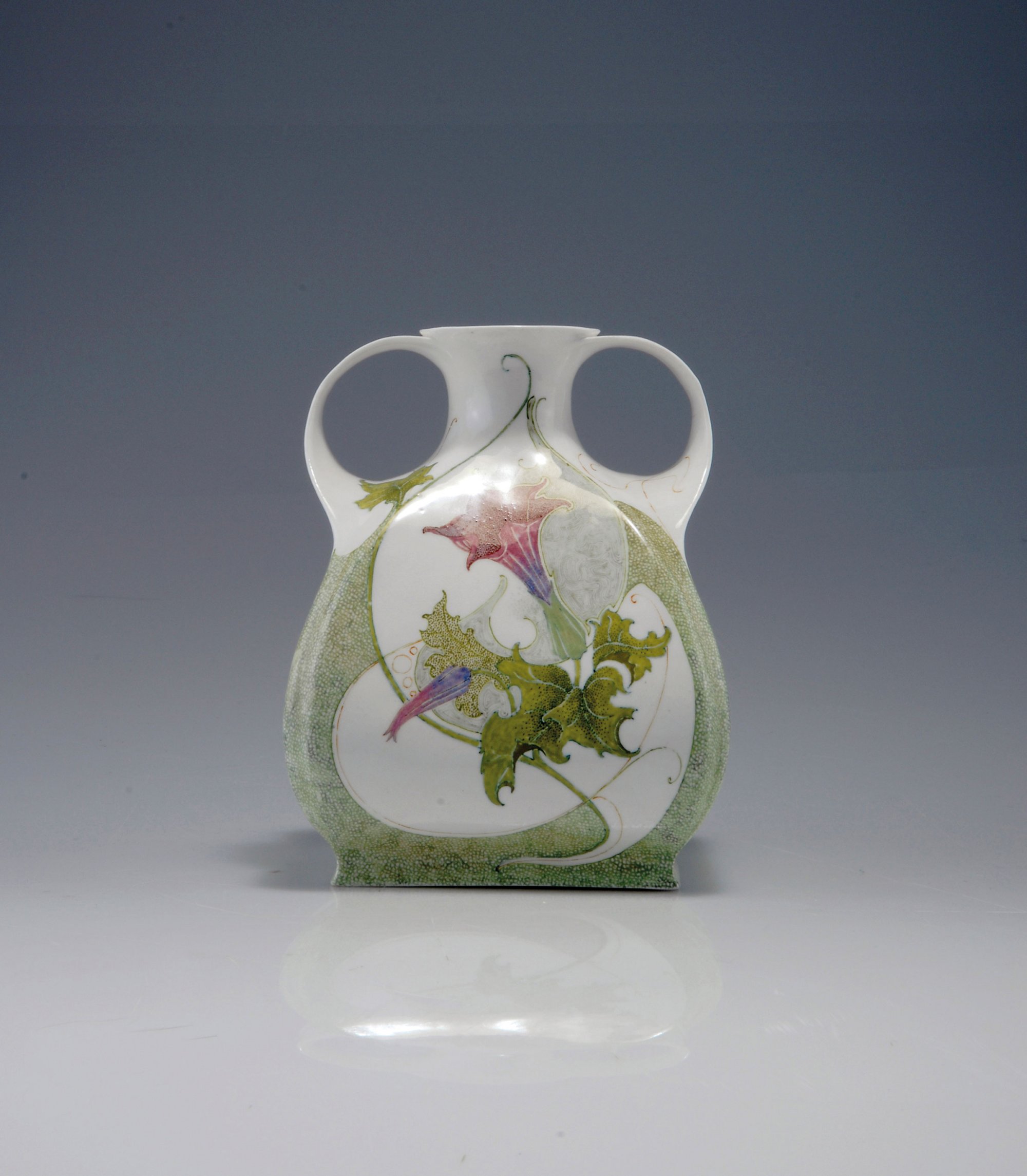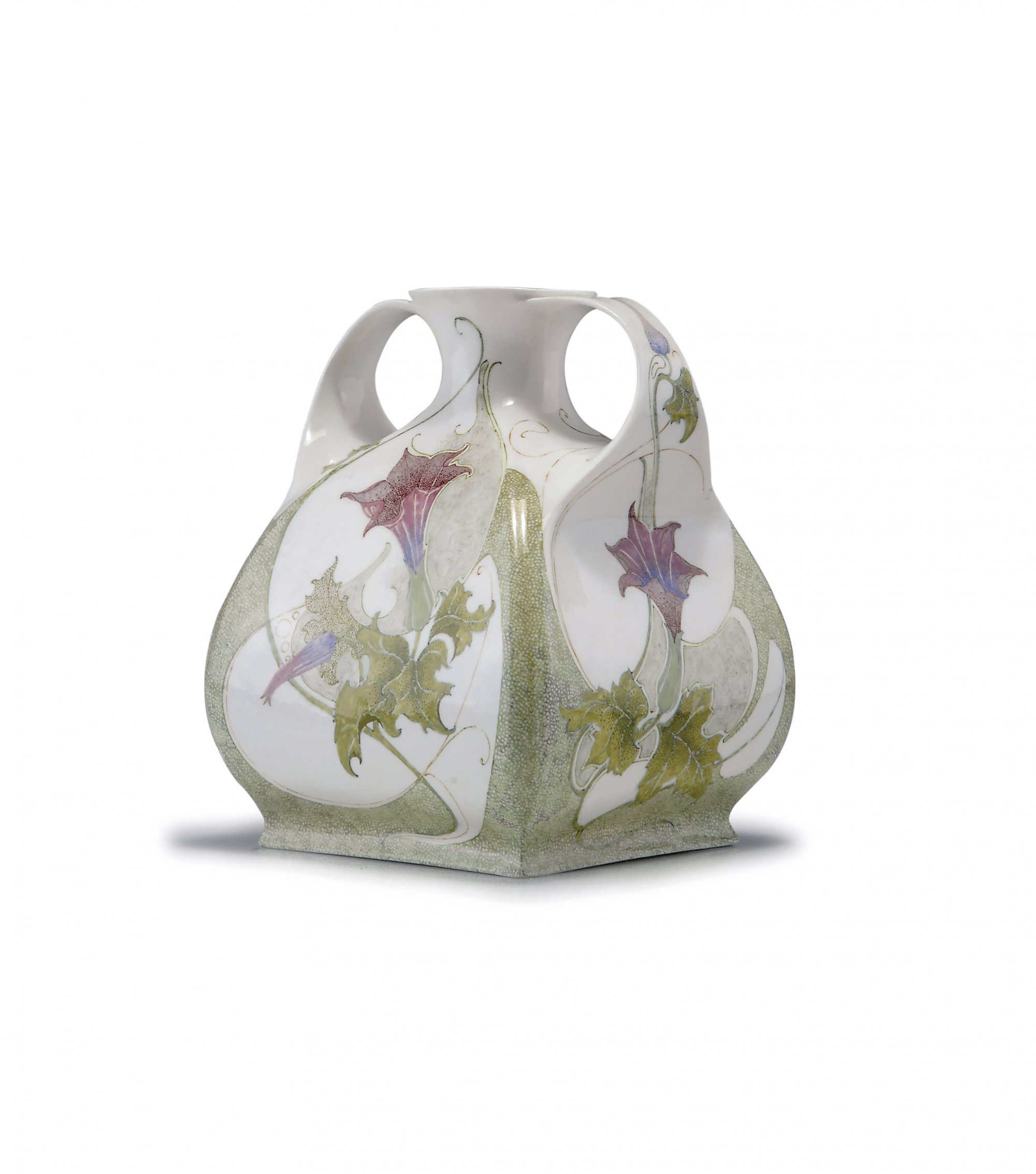 Hendrikus Gerardus Antonius Huyvenaar. Haagsche Plateelbakkerij Rozenburg. Vase with handles 1903. H. 14.2 cm. Eggshell porcelain, polychromatic paint with bird and ilex, lines. Marked: Stork, Rozenburg den Haag, date mark, window, 1048, artist's signet.