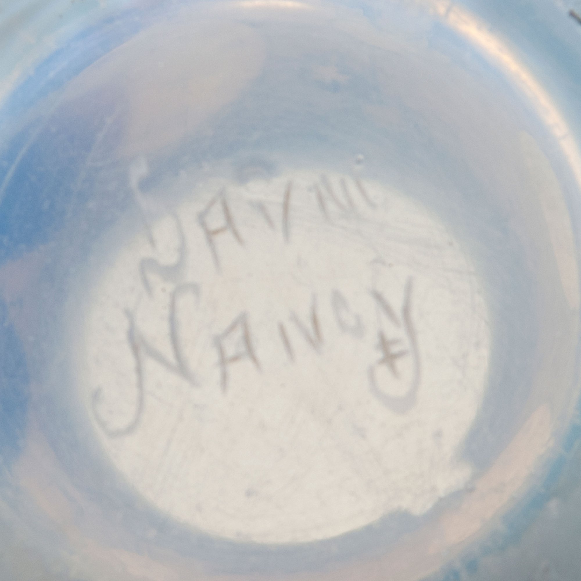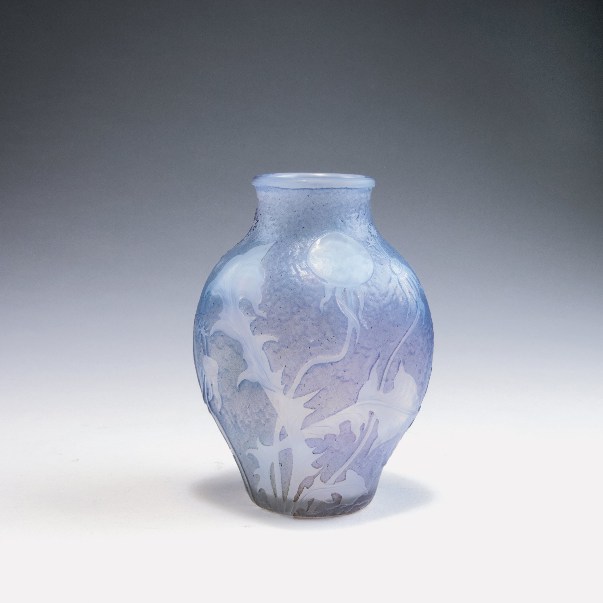 Daum Frères, Nancy. 'Chandelles' ('Pissenlits') vase, 1900. H. 11.5 cm. Designed by Henri Bergé. Cased glass, milky opalescent and clear, etched pattern, worked with the wheel. Blowballs on rough ground with patina. Signed: Daum Nancy, cross of Lorraine