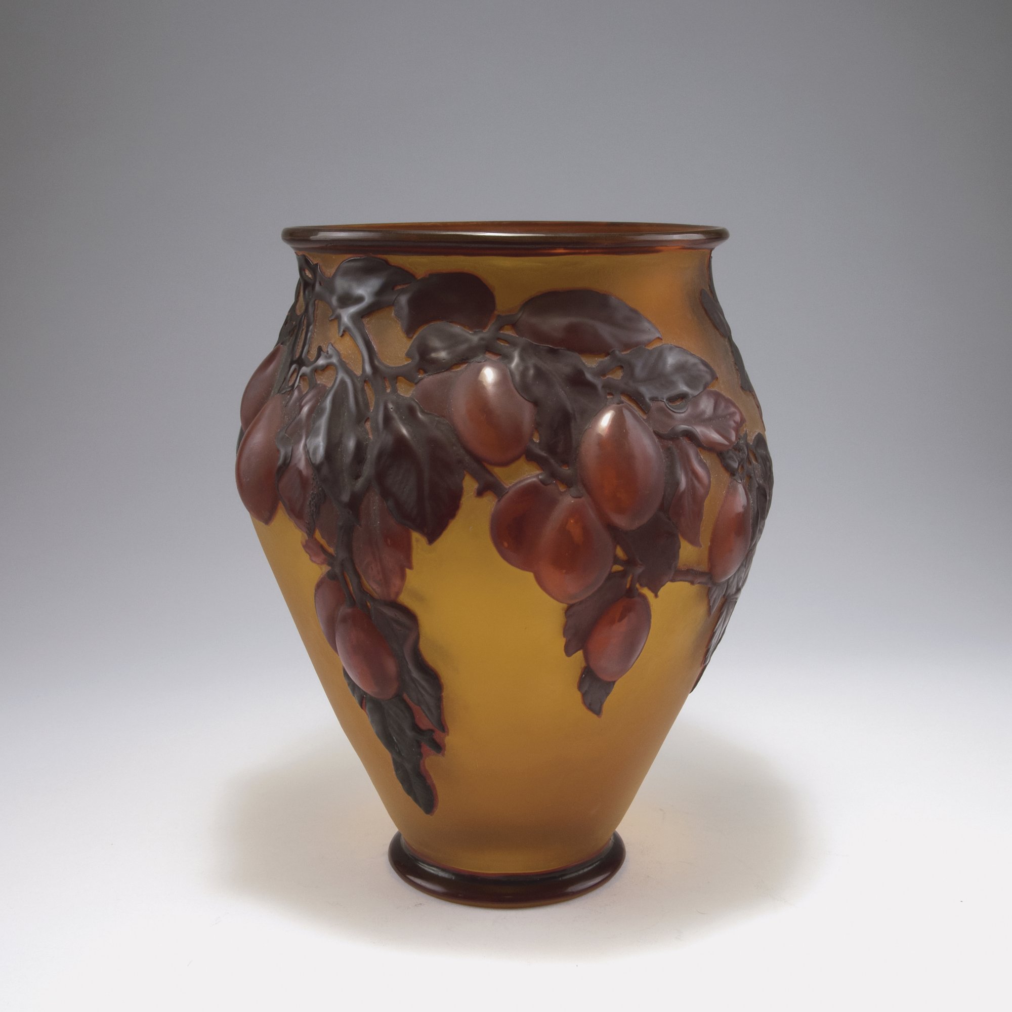 Emile Gallé, Nancy. 'Prunes' soufflé vase, 1920-25. H. 32 cm. Cased glass, amber, clear and brown, mould-blown (Soufflé technique) and multiply etched. Plum branches at sunset. Signed: Gallé.
