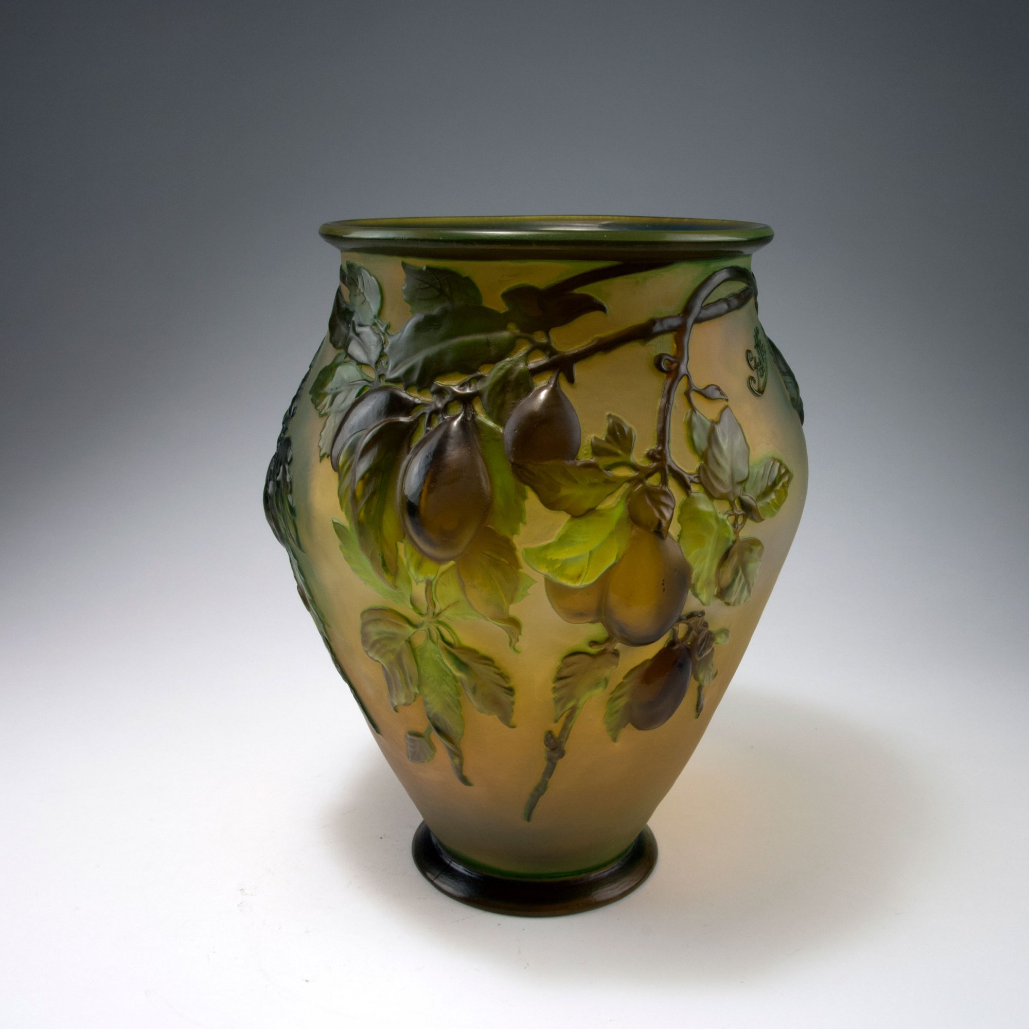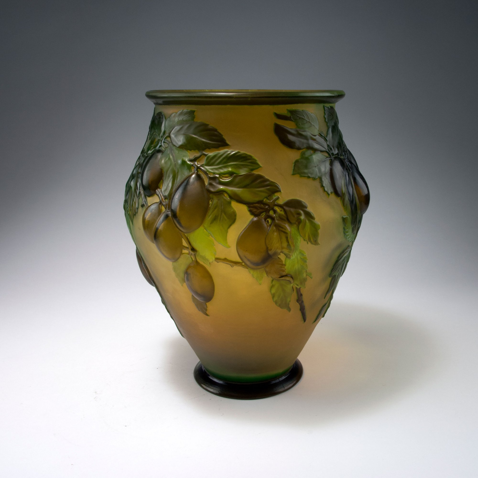 Emile Gallé, Nancy. 'Prunes' soufflé vase, 1920-25. H. 32.9 cm. Cased glass, amber, clear and green. Soufflé technique. Multiply etched pattern with plum branches at sunset. Signed: Gallé.