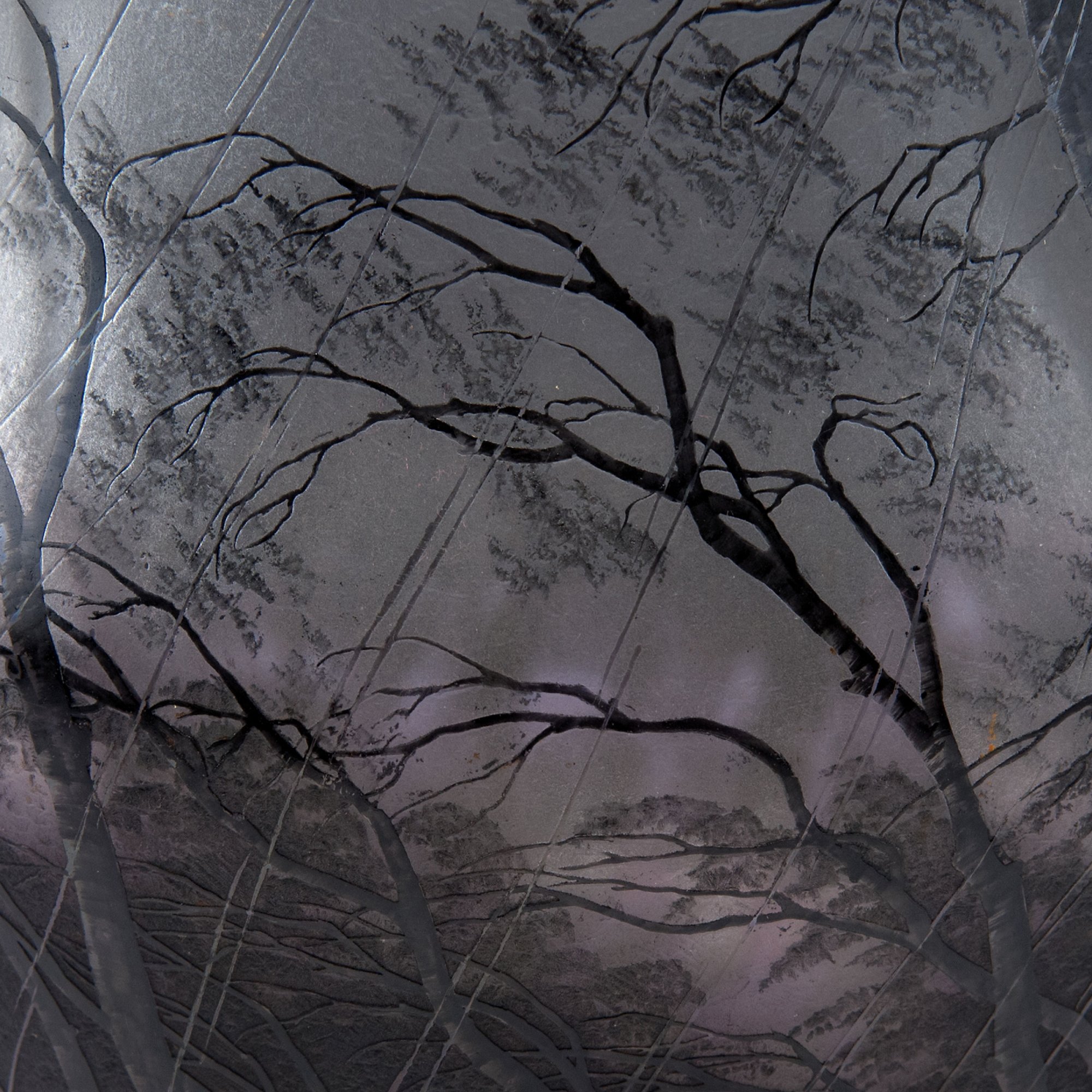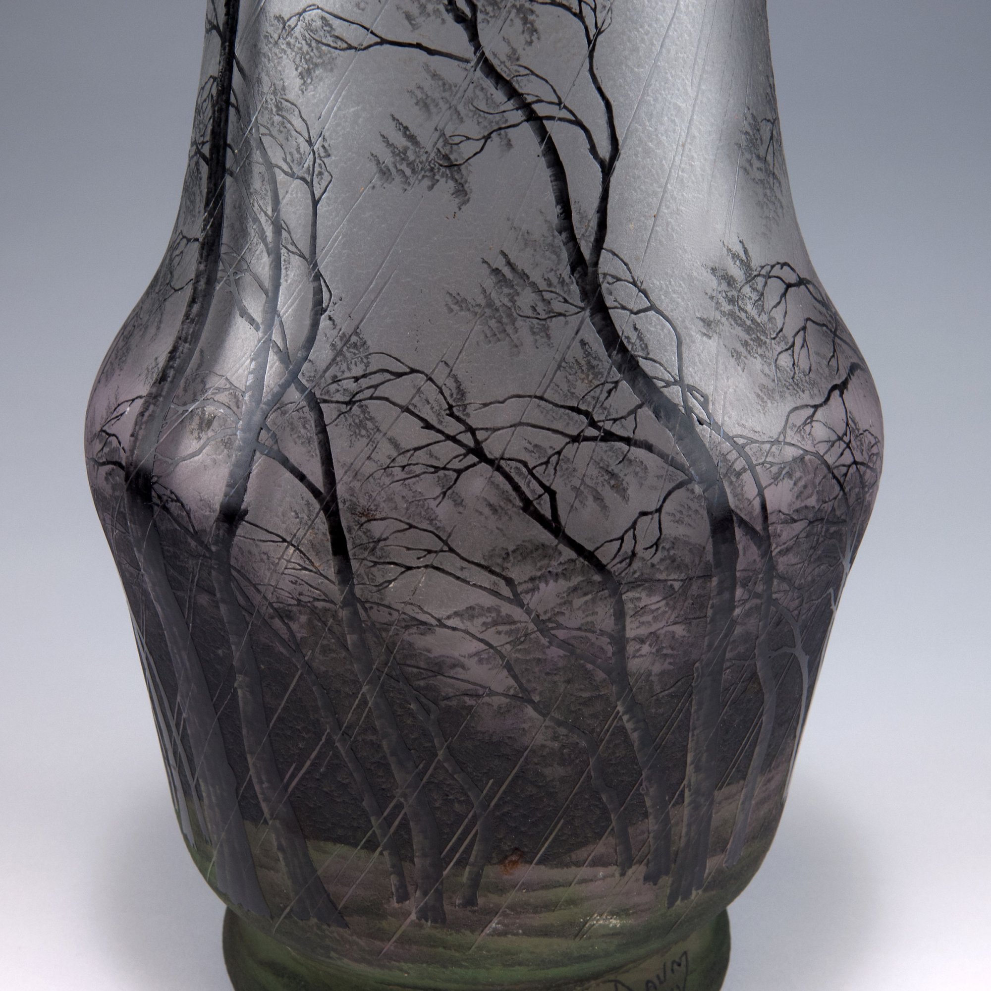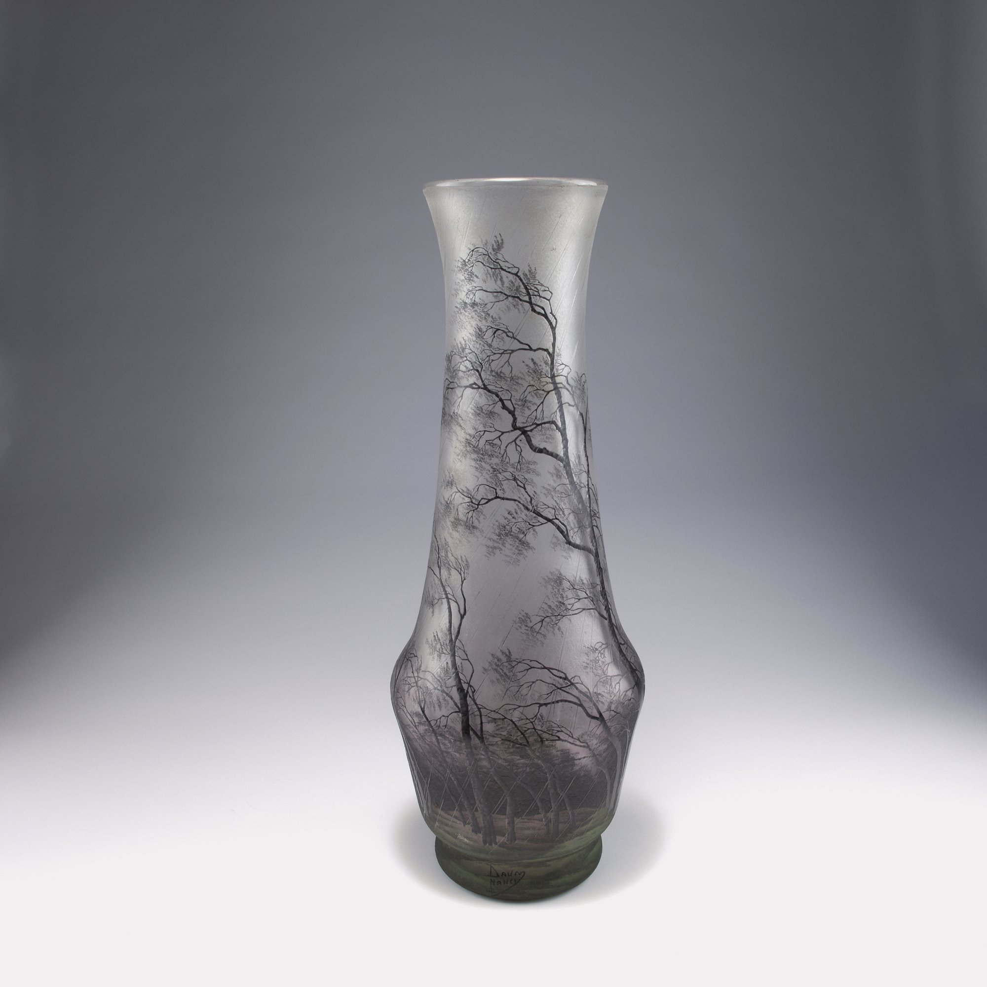 Daum Frères, Nancy. Tall 'Pluviose' vase, c1900. H. 53.3 cm. Designed by Henri Bergé. Cased glass, milk white, pink and pale green powder inclusions. Etched pattern, Grisaille paint. Bald birch trees in heavy rain. Signed: DAUM NANCY, cross of Lorraine.