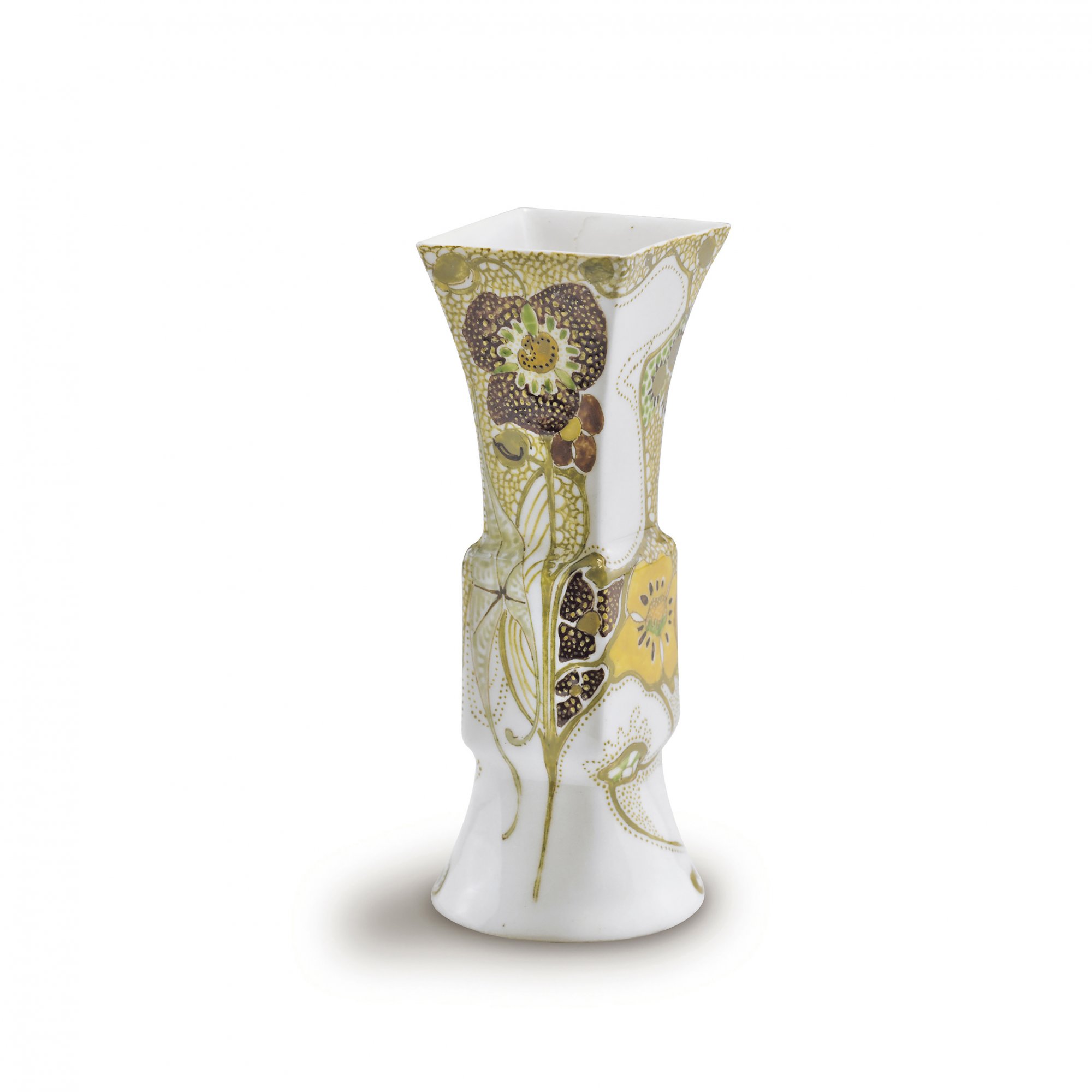 Jacobus Willem van Rossum. Haagsche Plateelbakkerij Rozenburg. Small vase, 1906. H. 9.2 cm. Eggshell porcelain, white. Glazed green, yellow and brown. Flowers and tendrils. Marked: Stork, crown, Rozenburg den Haag, 21y, date mark, window, 456, artist's signet.