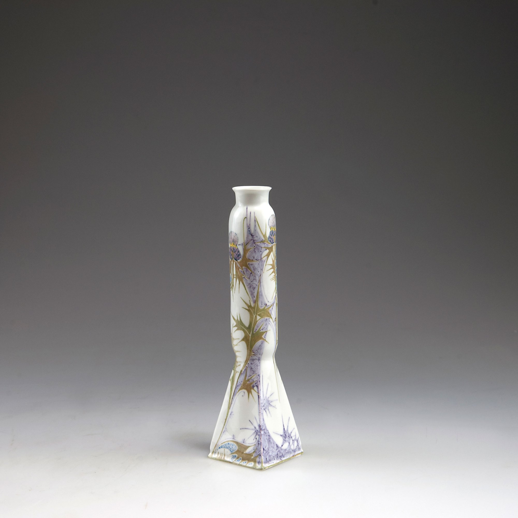 Jacobus Willem van Rossum. Haagsche Plateelbakkerij Rozenburg. 'Thistles' vase, 1909/10. H. 16.9 cm. Eggshell porcelain, white, polychromatic glaze. Thistles. Marked: Maker's mark, crown, date mark 1909/10, window, 21, JWR, 206.