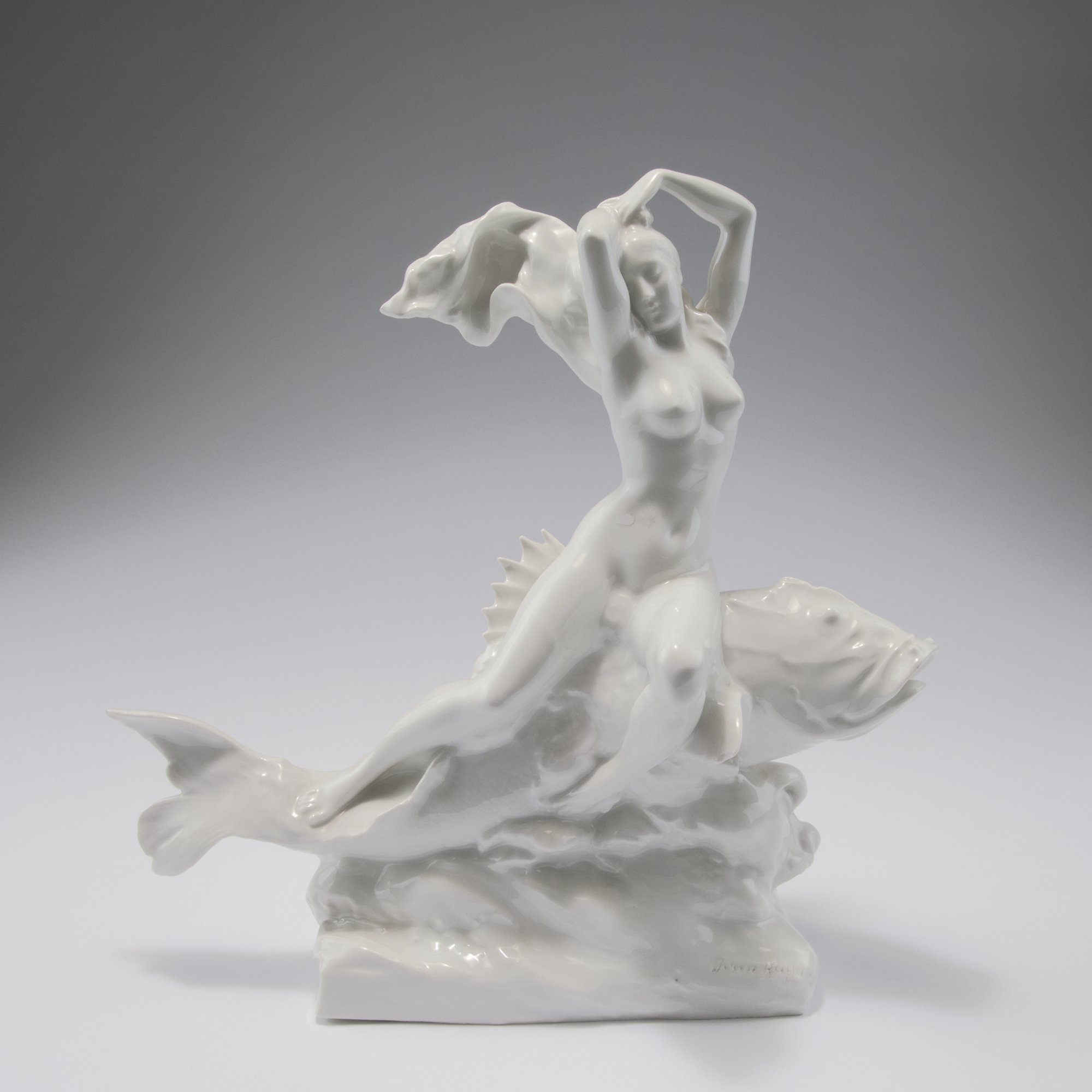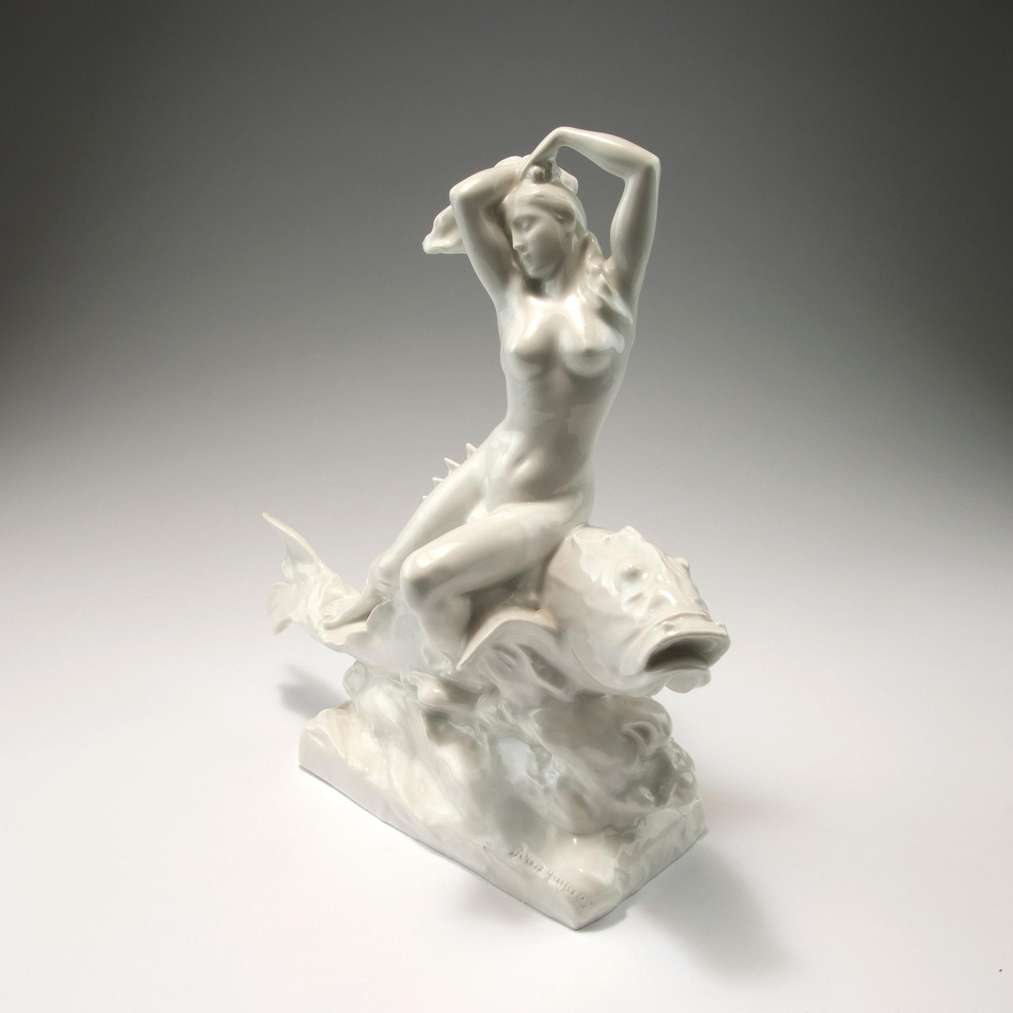 Jean Huynes. Najad riding on a fish, 1920. H. 31.5 cm. Made by Ackermann & Fritze, Volkstedt-Rudolstadt (probably). Porcelain, white, glazed. Base marked: Jean Huynes. Bottom: Maker's mark.