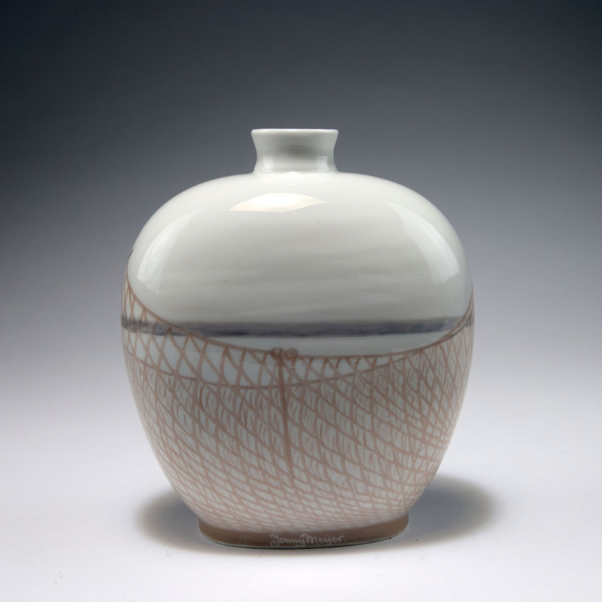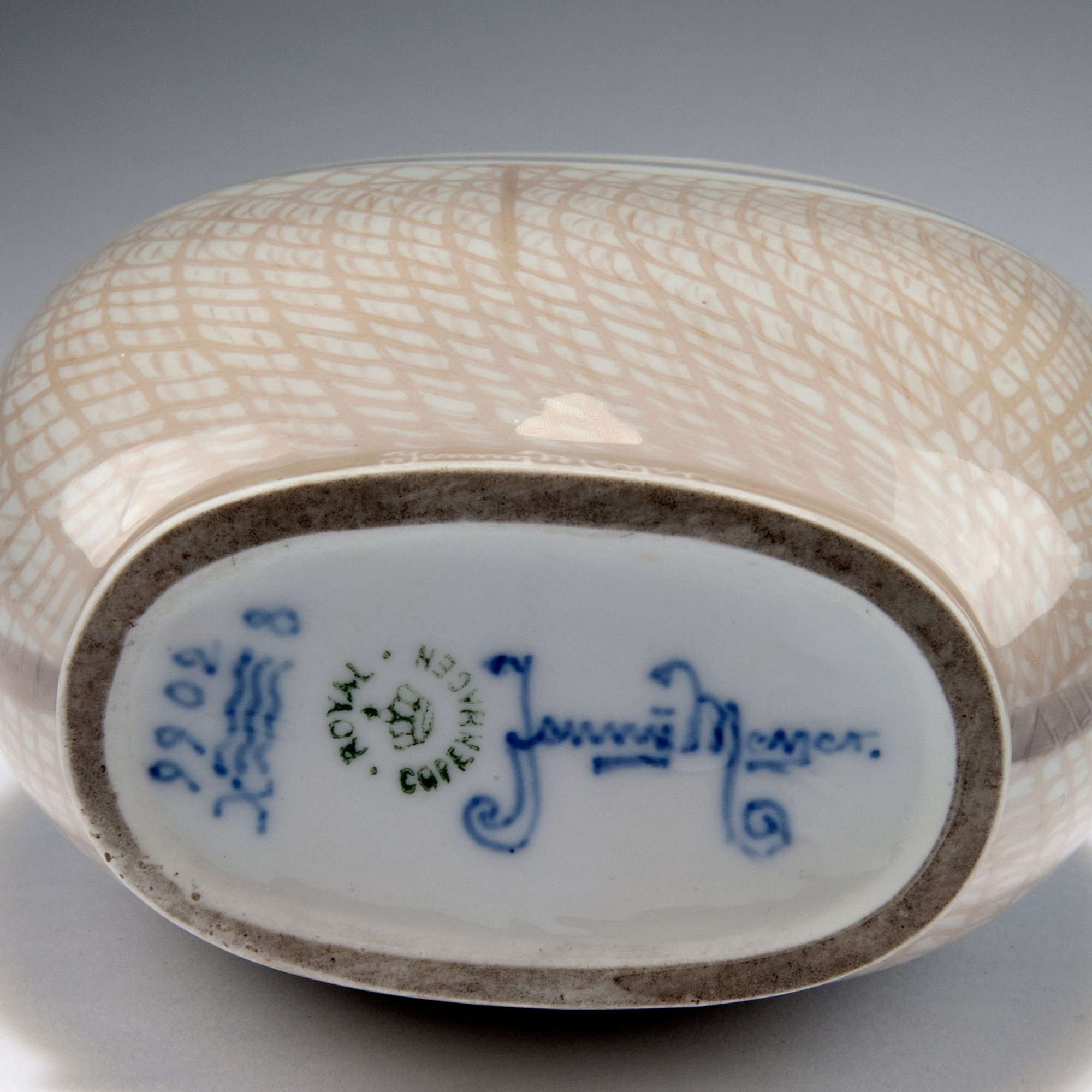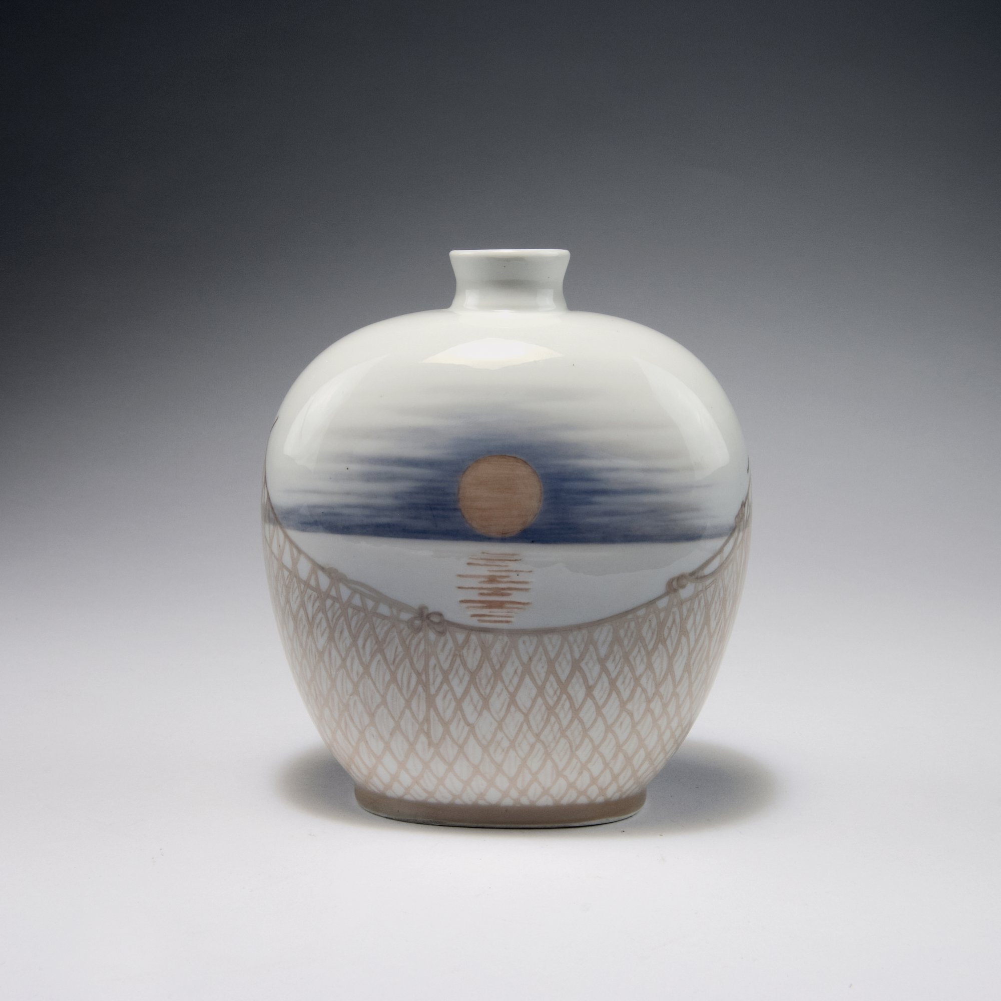 Royal Copenhagen. Unicum vase 'Sunset at sea', 1908. H. 17 cm. Décor by Jenny Sophie Meyer. Porcelain, white, glazed, polychromatic underglaze. Marked: 9902, X, waves, 8, Jenny Meyer, ROYAL COPENHAGEN.