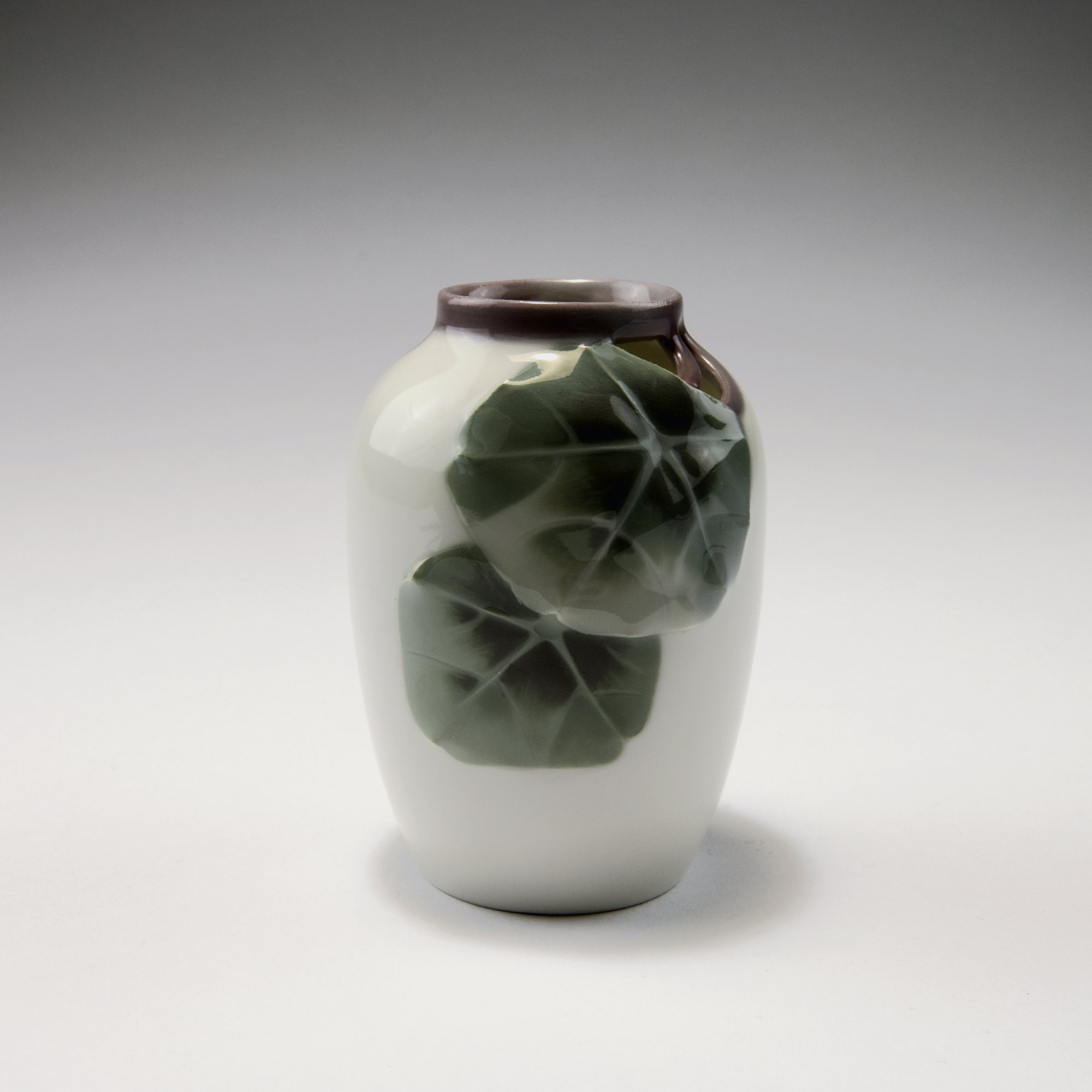 Rörstrands Porslinsfabriker AB, Lidköping. 'Cyclamen' vase, c1900. H. 10.2 cm. Designed by Johan Georg Asplund. Porcelain, white, glazed, underglaze, green and purple. Reliefed leaf pattern. Marked: Maker's mark, artist's signet G, 30514 G.