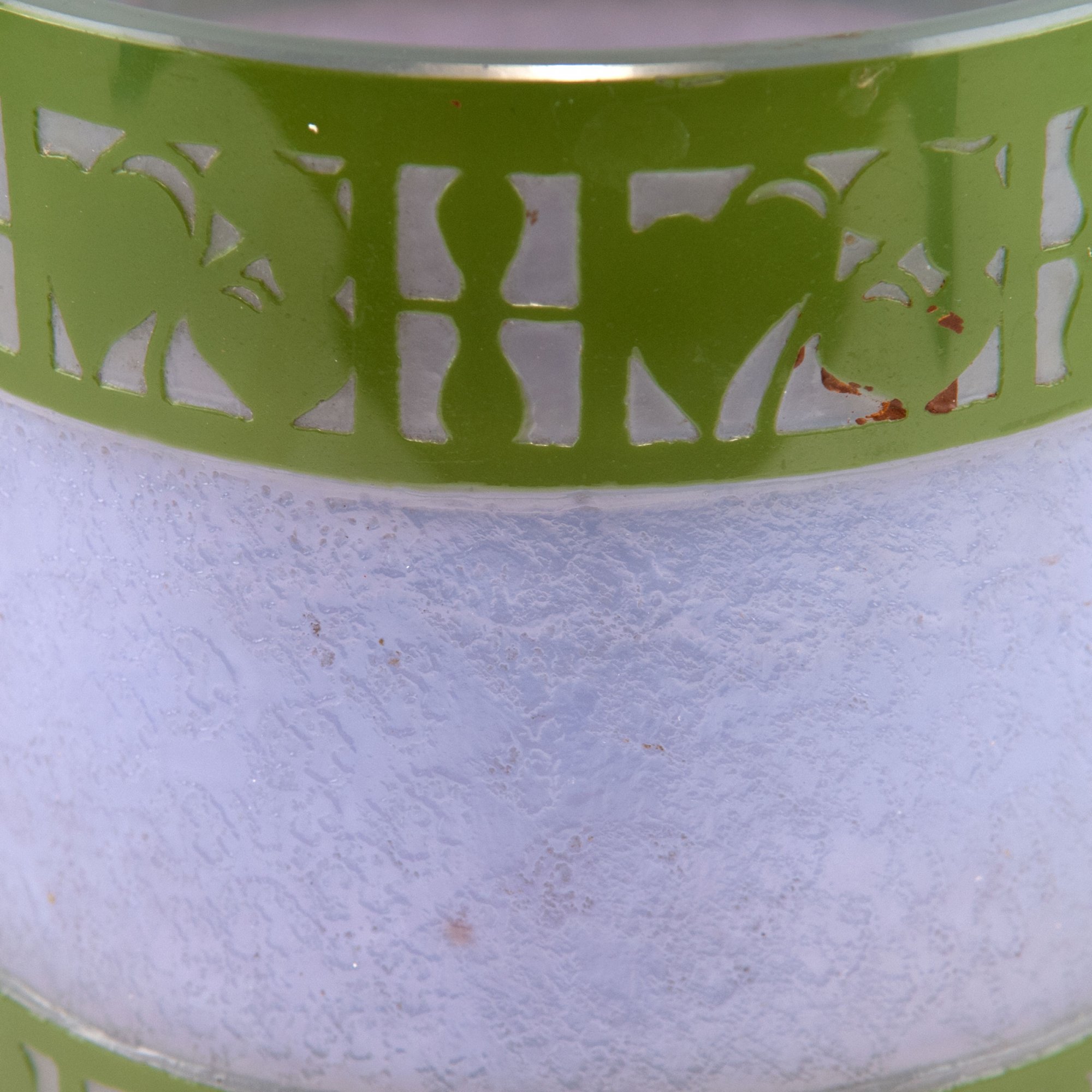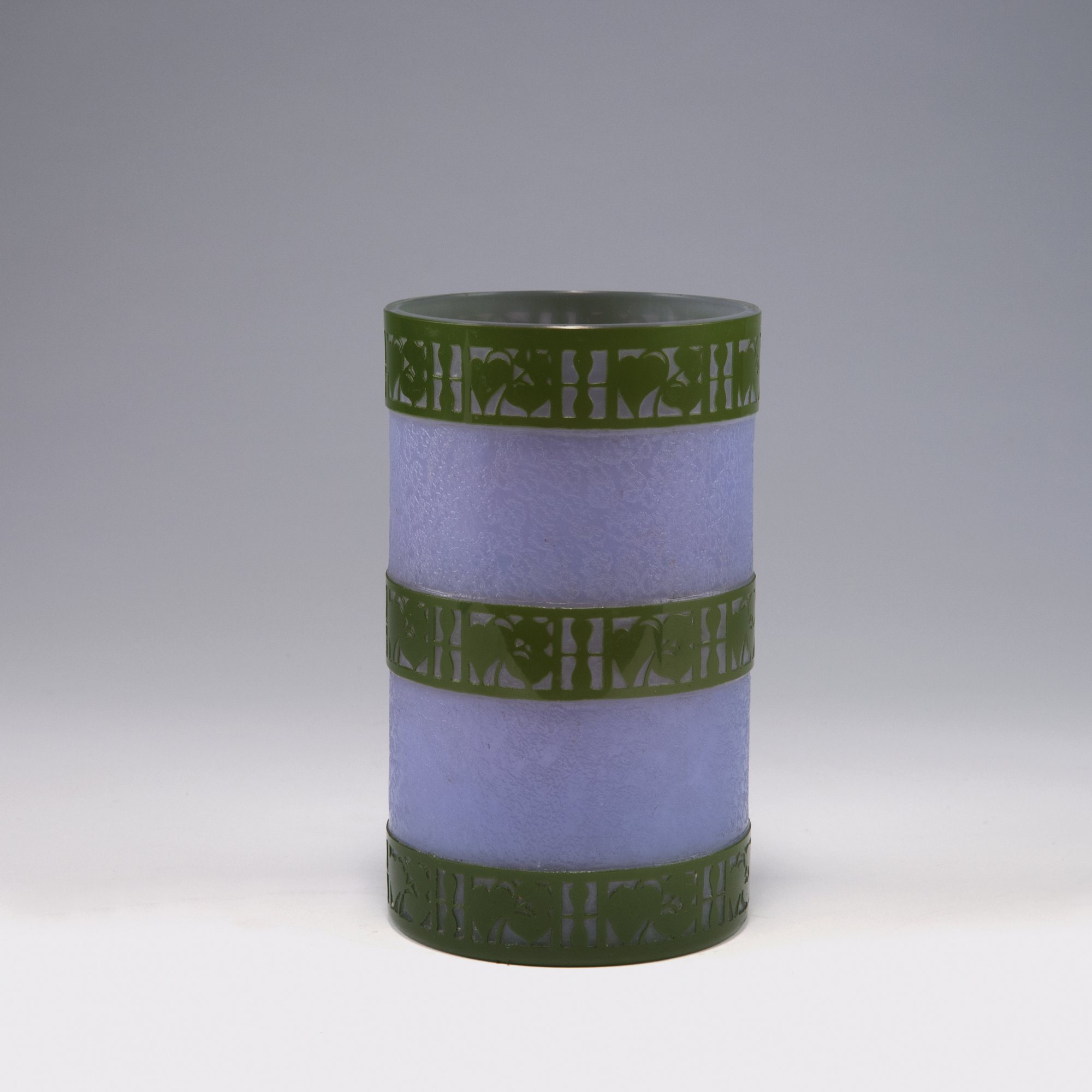 Josef Hoffmann. Very rare vase, 1911. H. 16.8 cm. Made by Joh. Loetz Wd., Klostermühle. Cased glass, milk white, purple and green. Multiply etched pattern with flower ribbons.