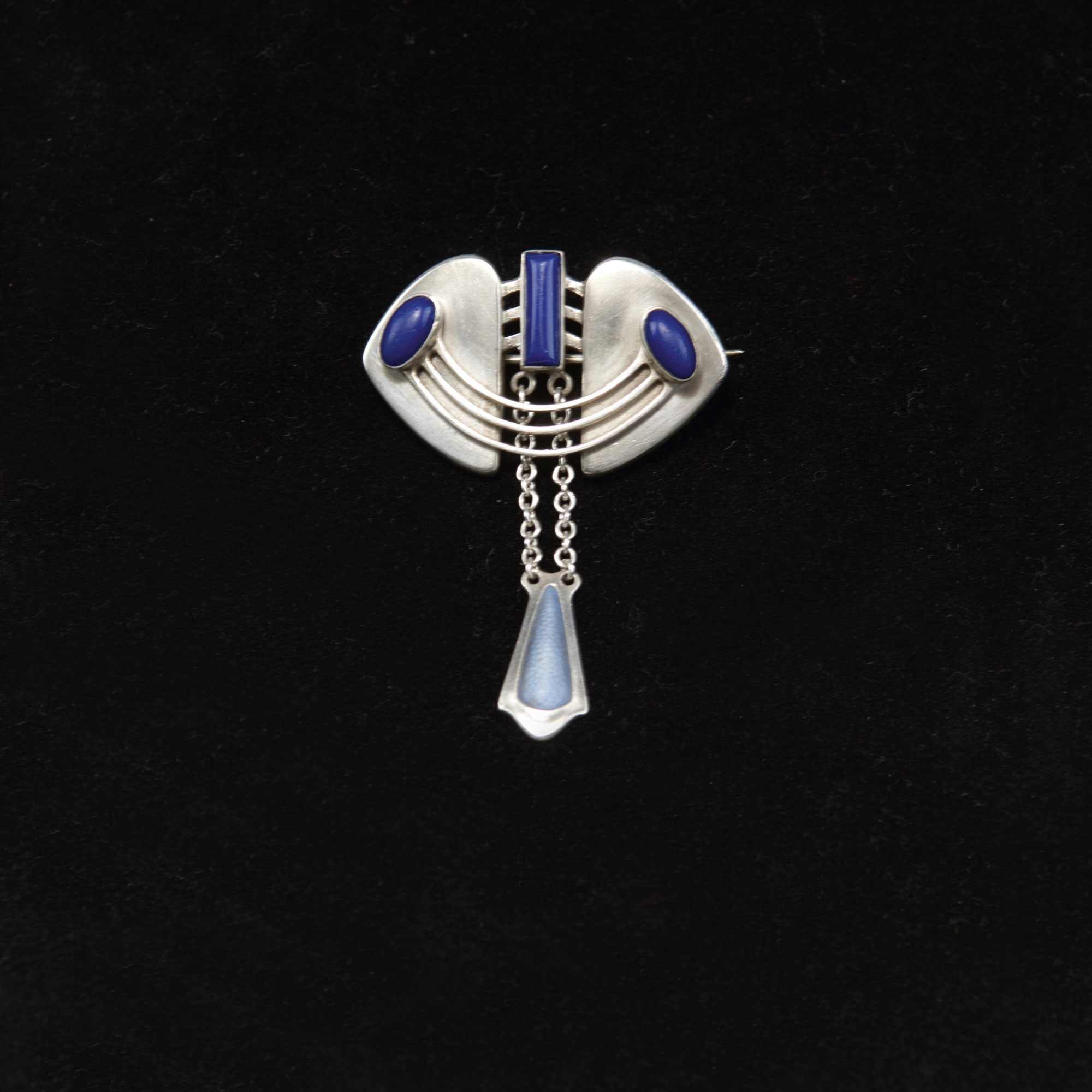 Hermann & Speck, Pforzheim. Brooch, c1905. 5 x 3.8 cm. Designed by Karl Hermann. Silver, three lapis lazuli, dark blue matt enamel. Marked: HS, DEPOSE, 900.