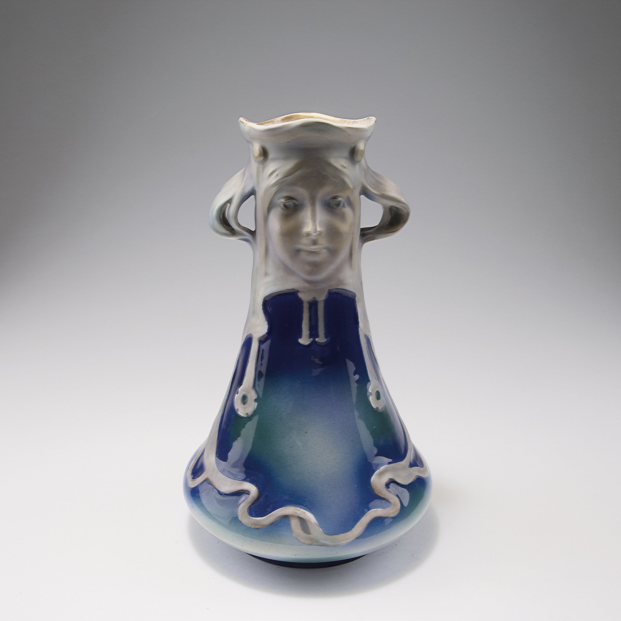 Carl Knoll, Karlo Vyvary. Vase with handles, c1905. H. 31 cm. Porcelain, white, glazed, blue green and white with gold. Marked: Maker's mark.