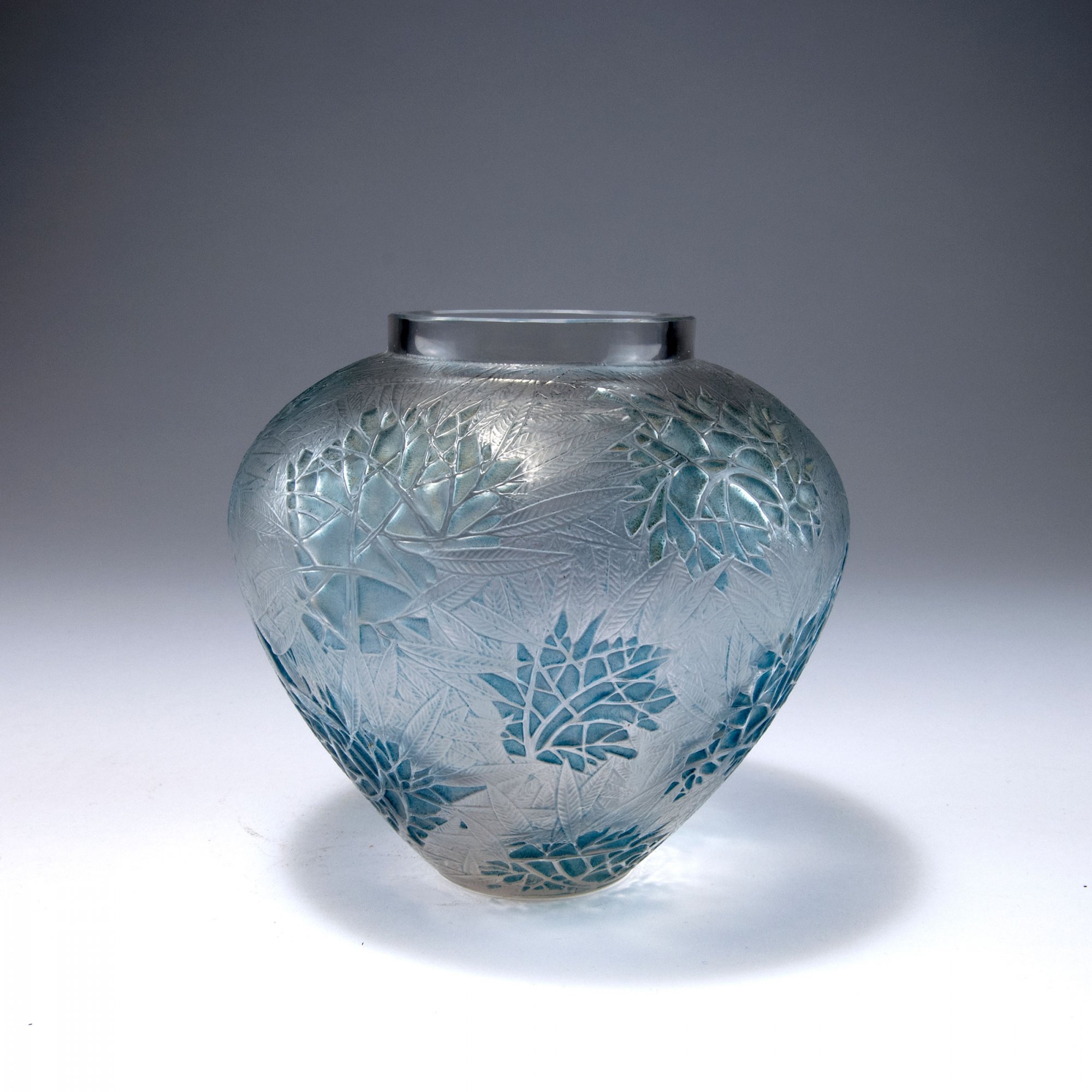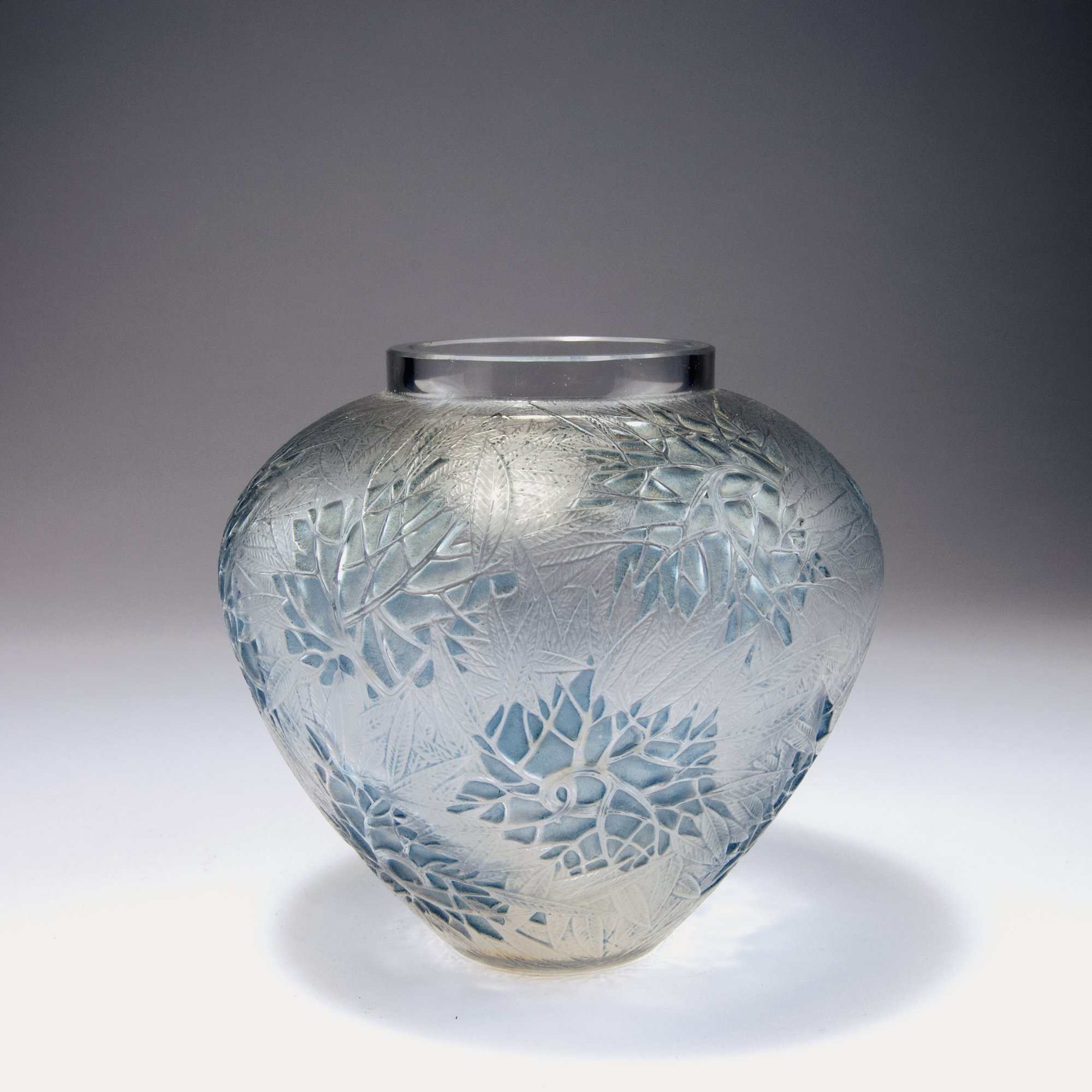 René Lalique, Wingen-sur-Moder. 'Esterel' vase, 1923. H. 15.5 cm. Clear moulded glass, matted, oleander pattern, blue patina. Marked: R. LALIQUE.