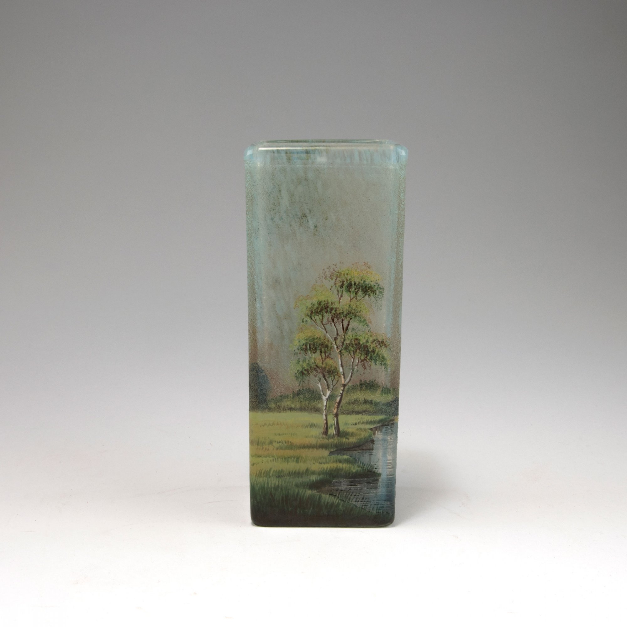 Lamartine, Paris. Vase with landscape, 1920s. H. 19.5 cm. Cased glass, clear, whitish powder inclusions. Etched and enamelled pattern with coastal landscape and birches. Signed: Lamartine.