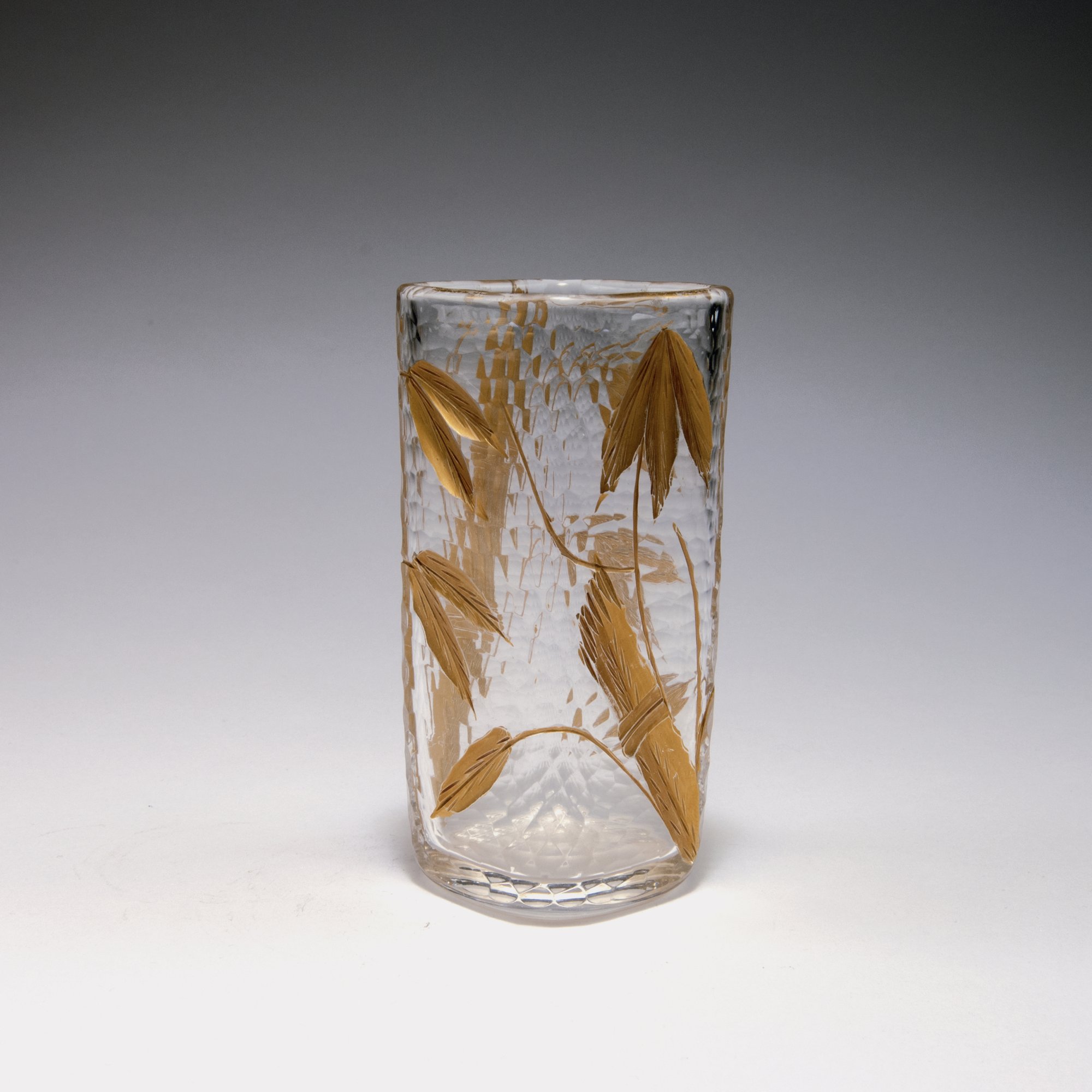 Eugène Leveillé, Paris (attributed). 'Bambous' vase, c1880. H. 13.2 cm. Clear glass, engraved and gilded motif with bamboo. Ground martelé cut.