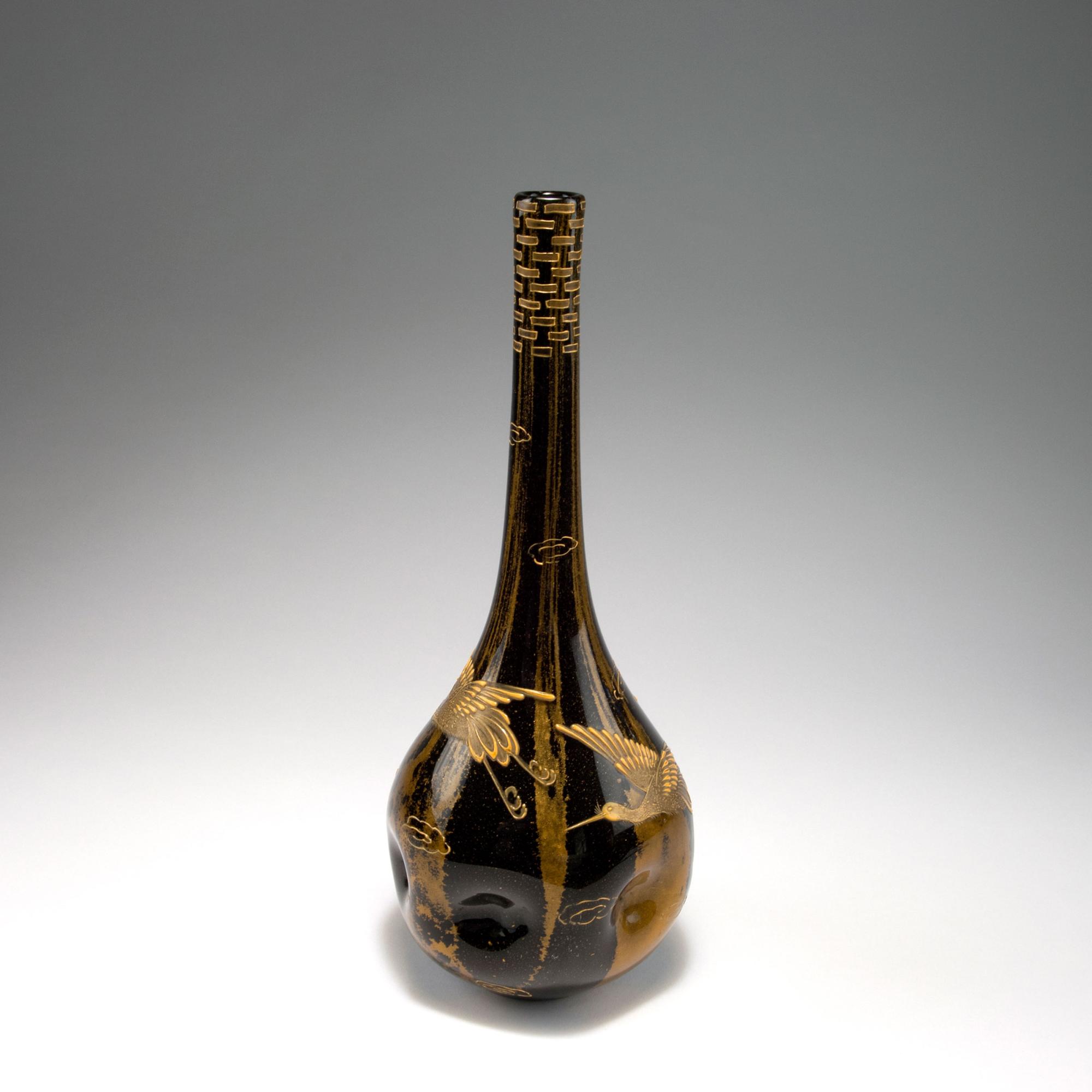 Loetz, Klostermühle. 'Ophir' vase with Japanesque pattern, 1904. H. 33.7 cm. Cased glass, auburn and amber. 'Ophir' pattern with included metal foil. Reliefed gold pattern, cranes and clouds.