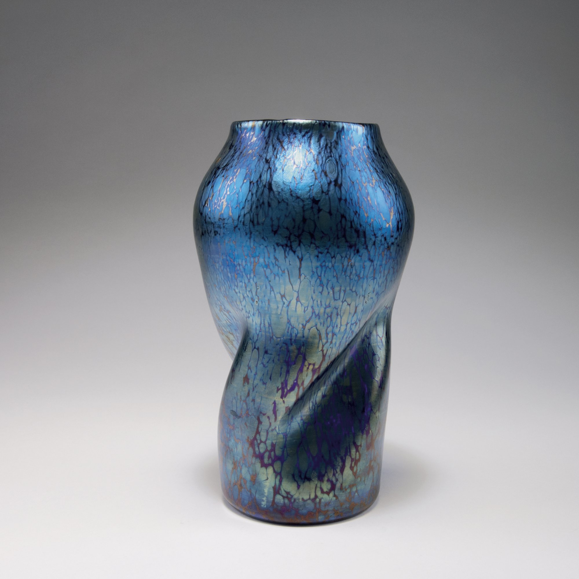 Loetz, Klostermühle. Vase, 1900. H. 23.3 cm. Cobalt glass, Papillon pattern, silvery blue and mother of pearl lustre.