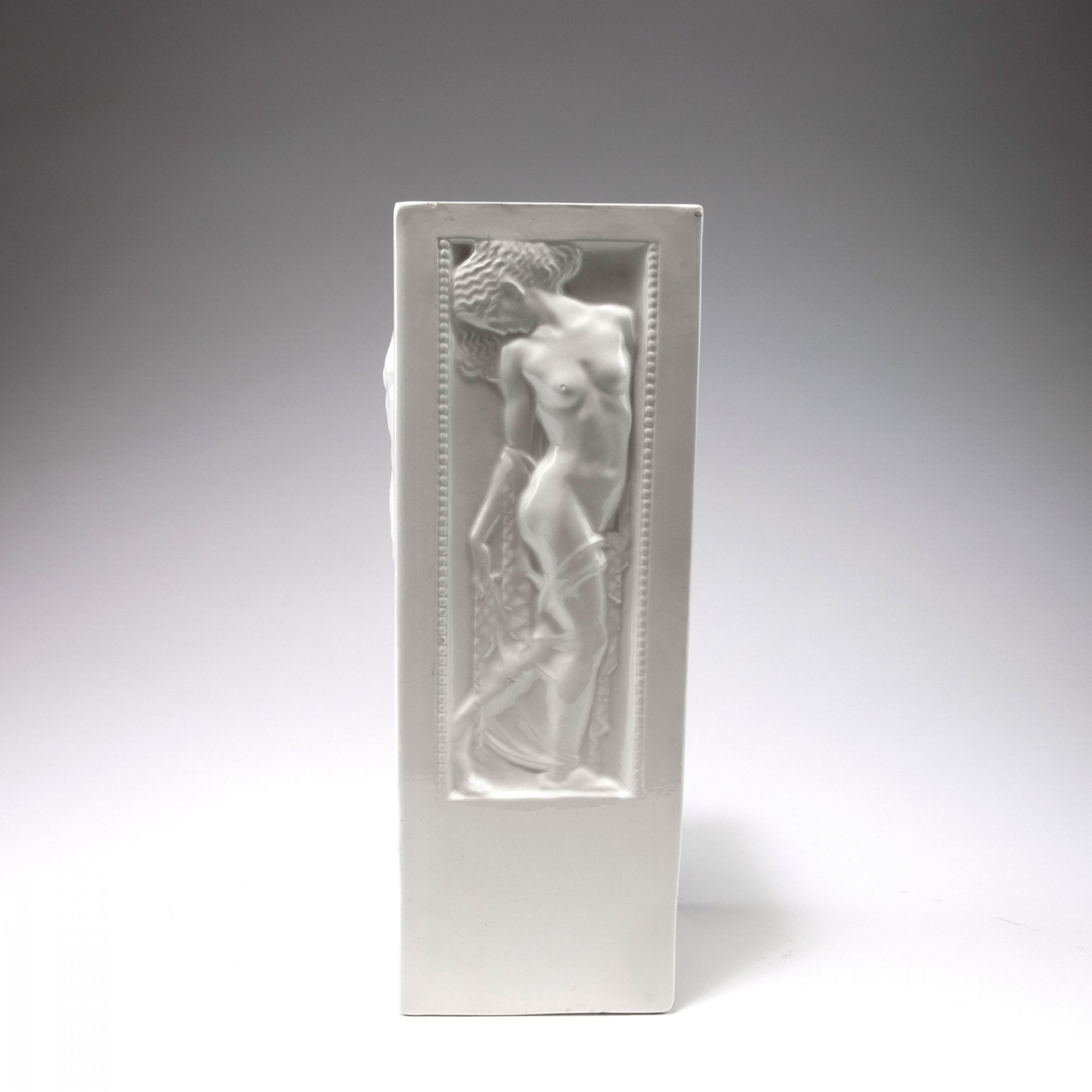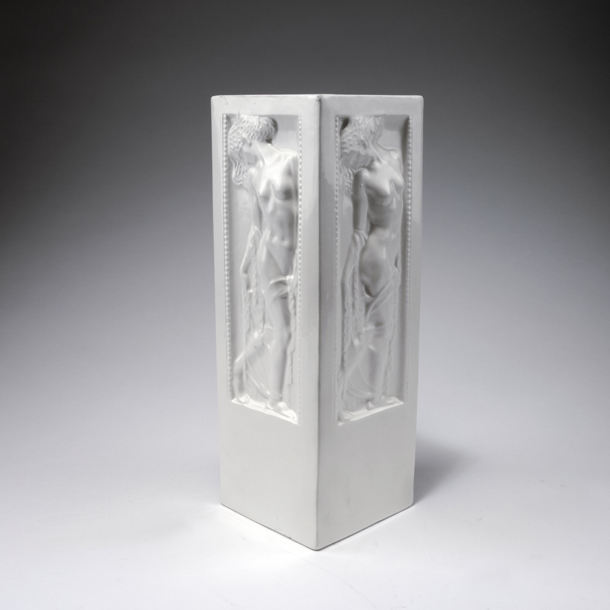Michael Powolny. 'Female Nude' vase, c1907. H. 34.5 cm. Made by Wiener Keramik. Earthenware, glazed white. Marked: MP, maker's mark.