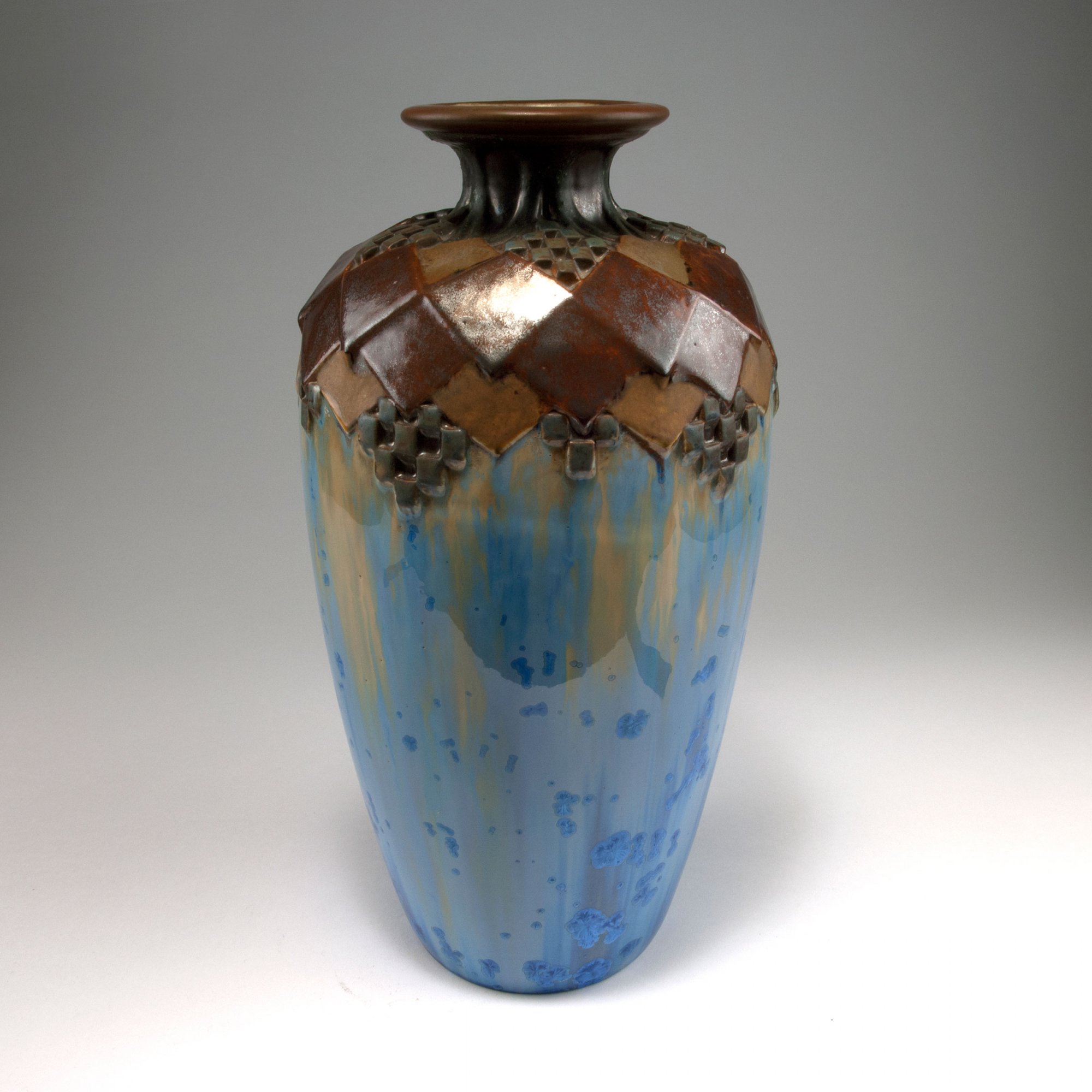 Joseph Victor Xavier Mougin, Nancy. Tall vase, 1920s. H. 41.5 cm. Stoneware, glazed blue and yellow, slightly metallic. Reliefed stylized pattern, brown and anthracite grey. Marked: MOUGIN NANCY, 315 JX, 85.