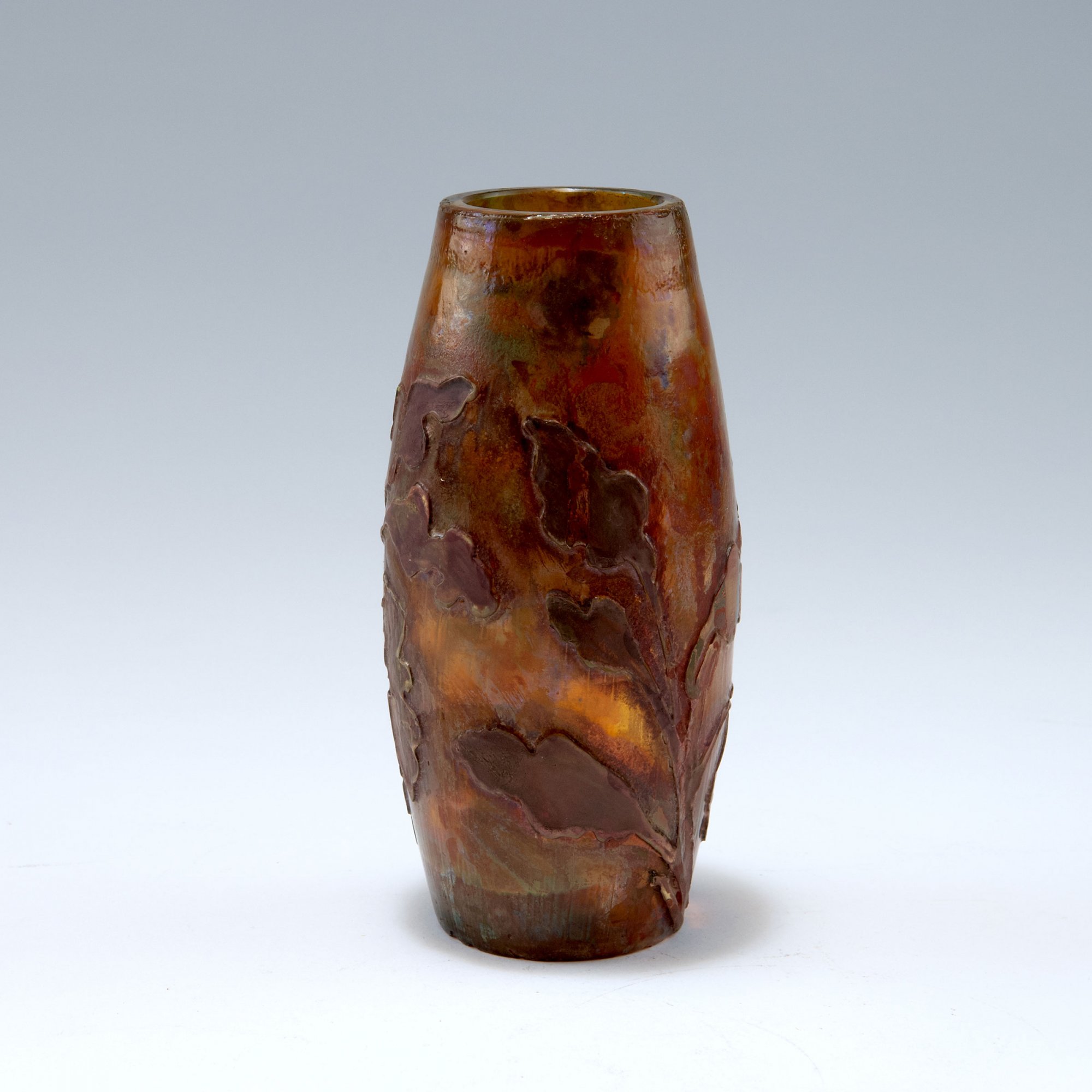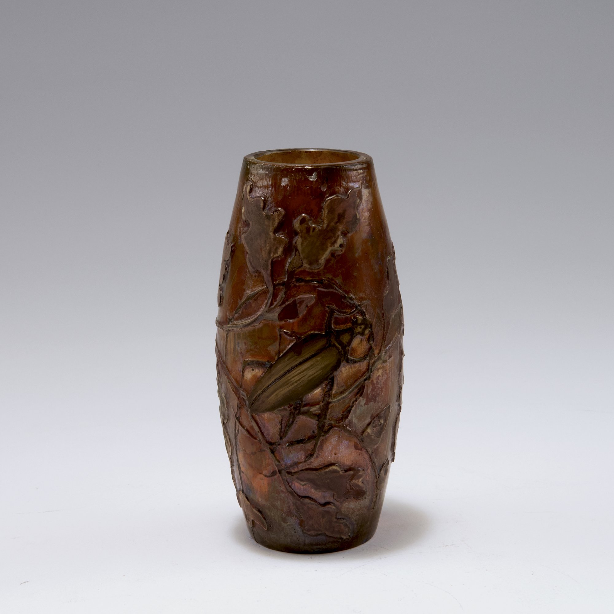 Muller Frères, Croismare. 'Chêne et capricorne du chêne' vase, 1900-10. H. 15 cm. Clear glass, oxide colours, etched and gilded. Oak leaves and capricorn beetle. Signed: Muller Croismare, flower.