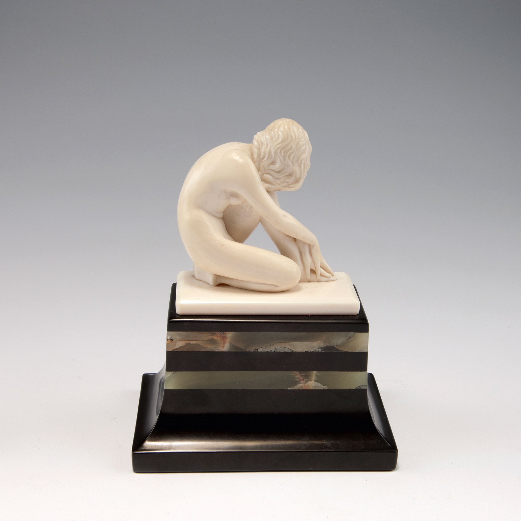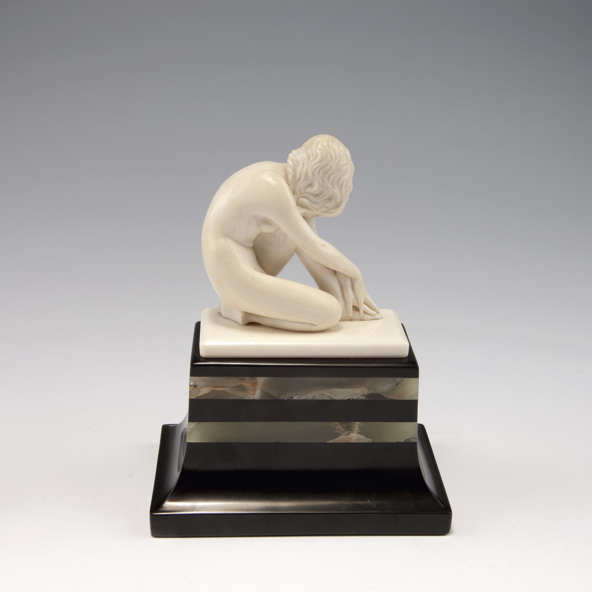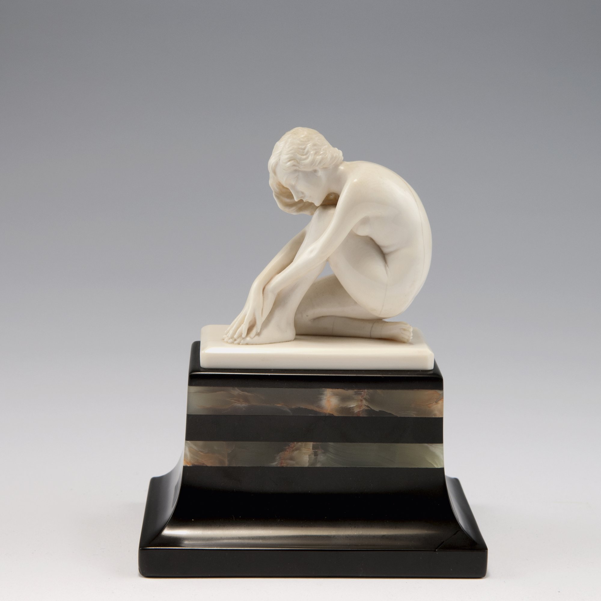 L. Walther. Musing girl, c1920. H. 15.8 cm (incl. base). Carved ivory, base of onyx and slate. Plinth marked: L. Walther.