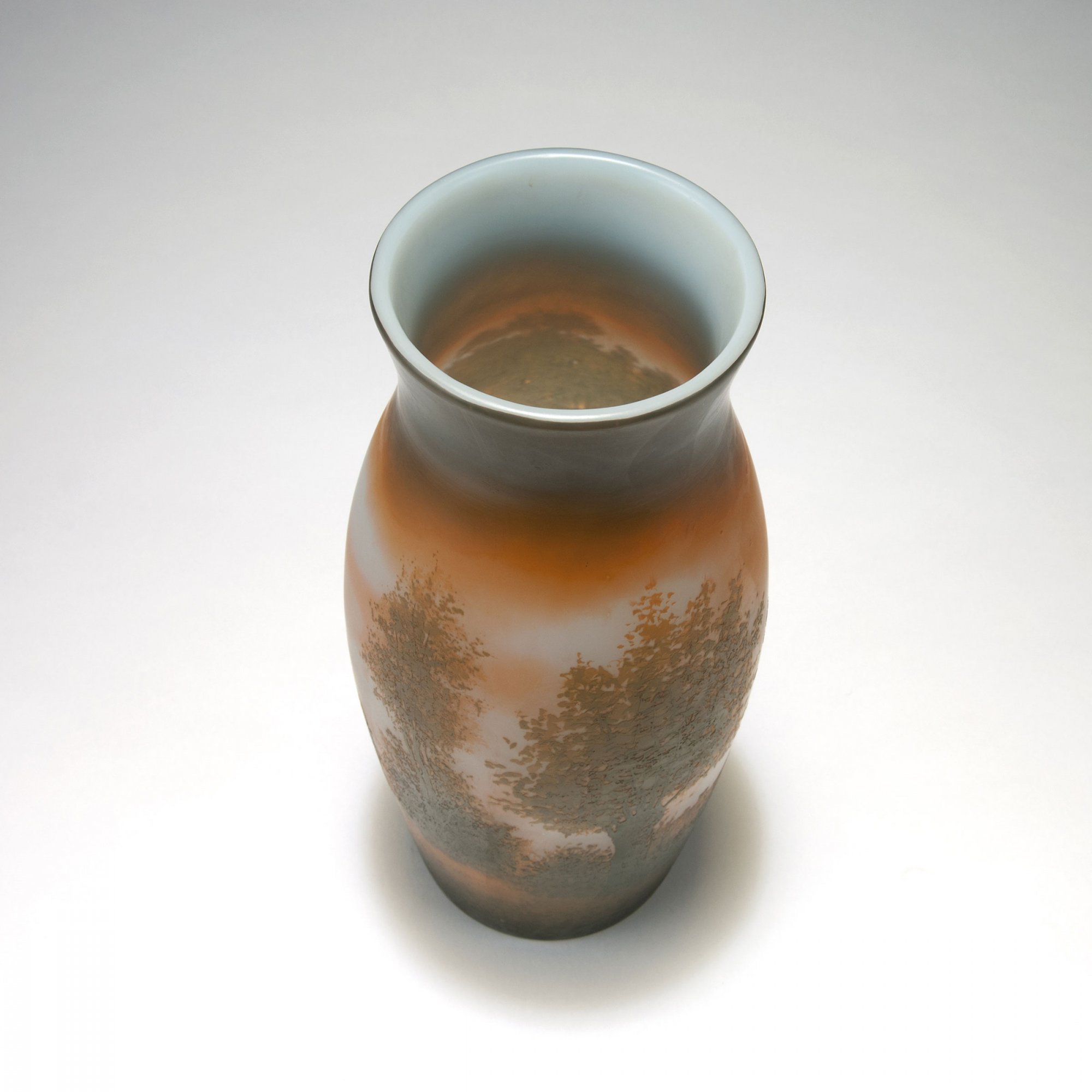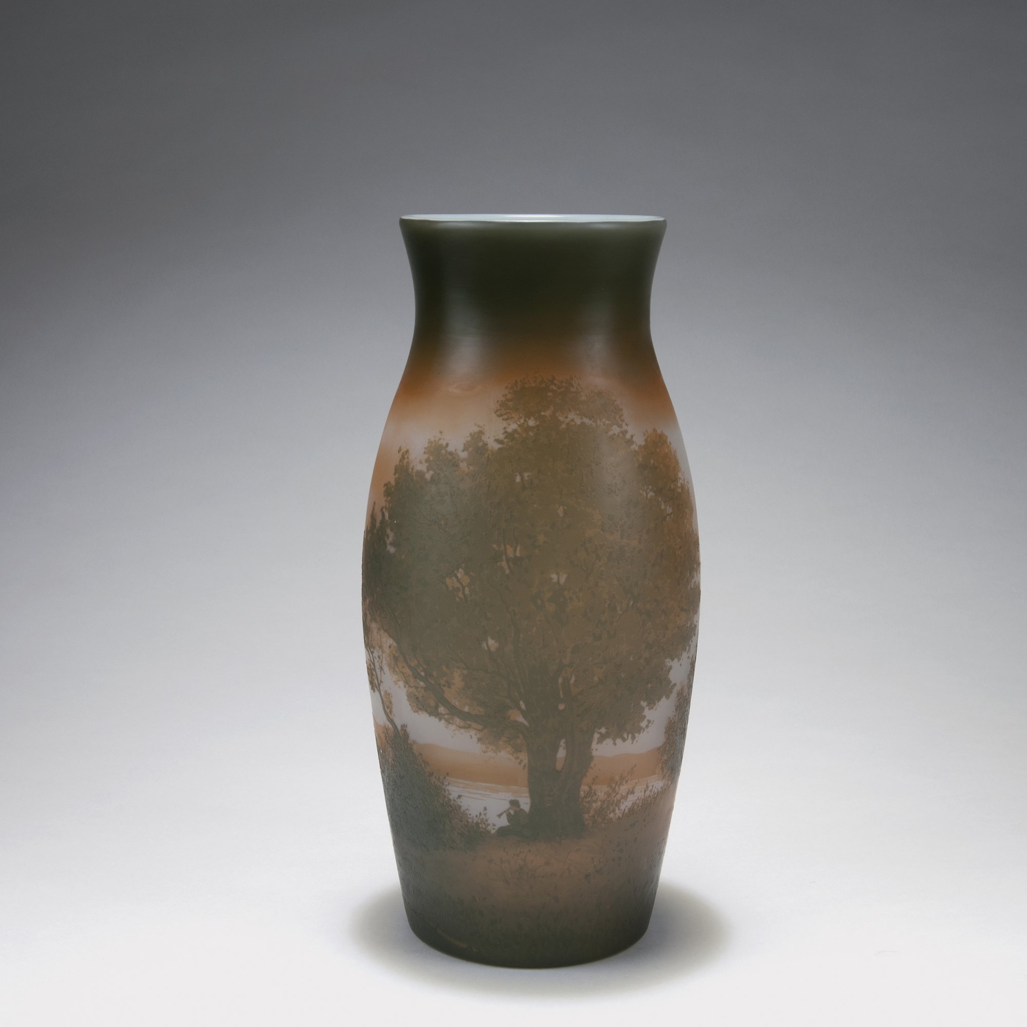 Paul Nicolas, Nancy. 'Paysage, scène pastorale' vase, c1915. H. 29.5 cm. Made in Saint-Louis, Münzthal. Cased glass, opal white, clear and auburn. Multiply etched pattern with shepherd playing the flute, Southern-French village in the background. Signed: d'Argental SL.