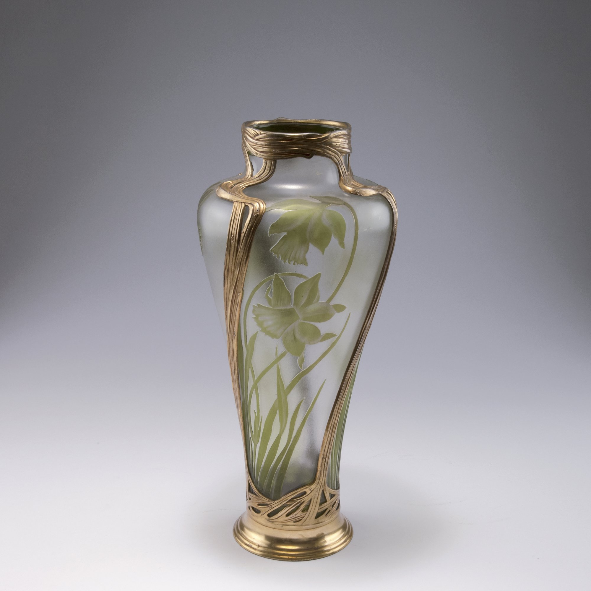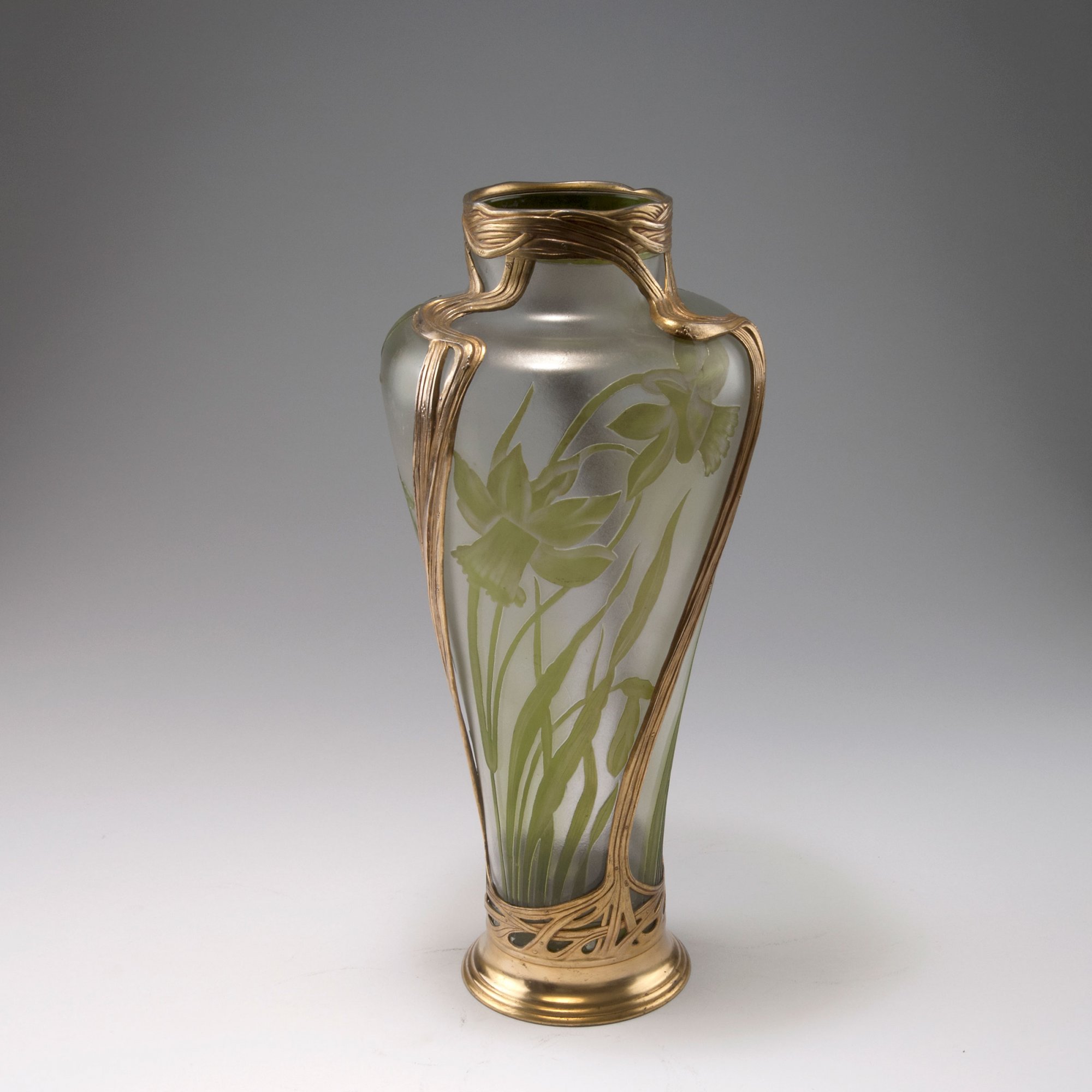 Orivit-Metallwarenfabrik, Cologne and Val Saint-Lambert, Seraing-sur-Meuse. Tall vase, 1904. H. 42 cm. Silver-plated pewter, glass inset, clear and green with etched narcissus pattern, worked with the wheel. Marked: "ORIVIT", 2545.