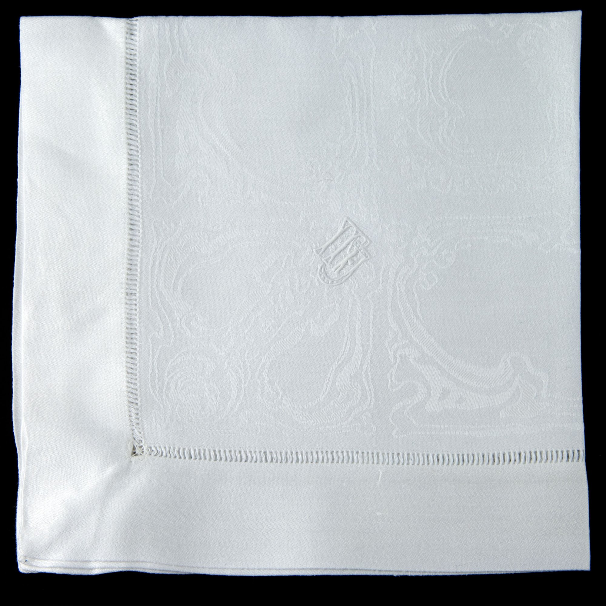Otto Eckmann. Tablecloth and twelve napkins, c1900. Tablecloth, 230 x 170 cm; napkins, 44 x 44 cm. Made by S. Fränkel, Neustadt (attributed). Linen damask. Marked: woven-in artist's signet OE. Embroidered owner's initials MJ.