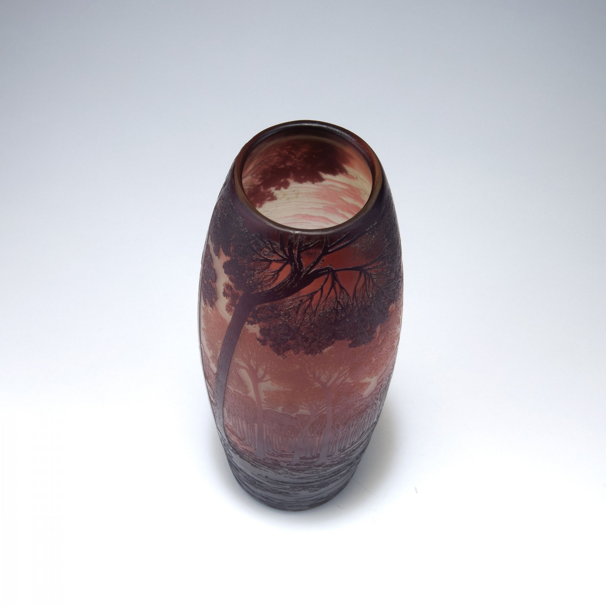 Camille Tutré de Varreux, Cristallerie de Pantin. 'Belem' vase, c1915-20. H. 26 cm. Cased glass, pale amber, wine red and purple. Multiply etched pattern with veduta near Lisbon, castle of Belem. Signed: de Vez.