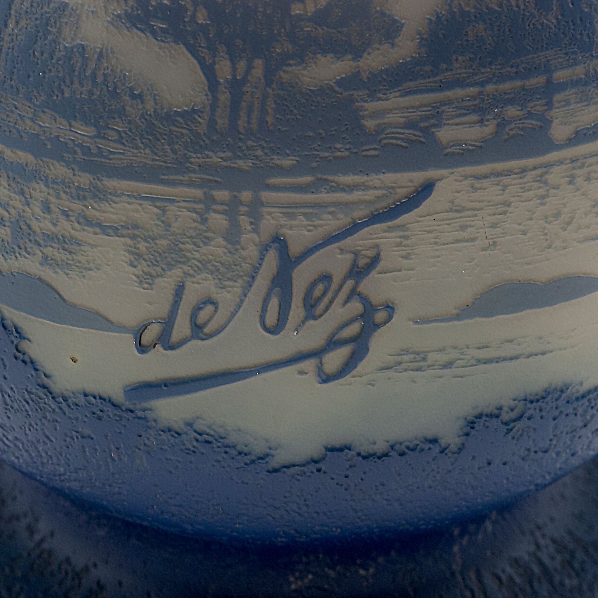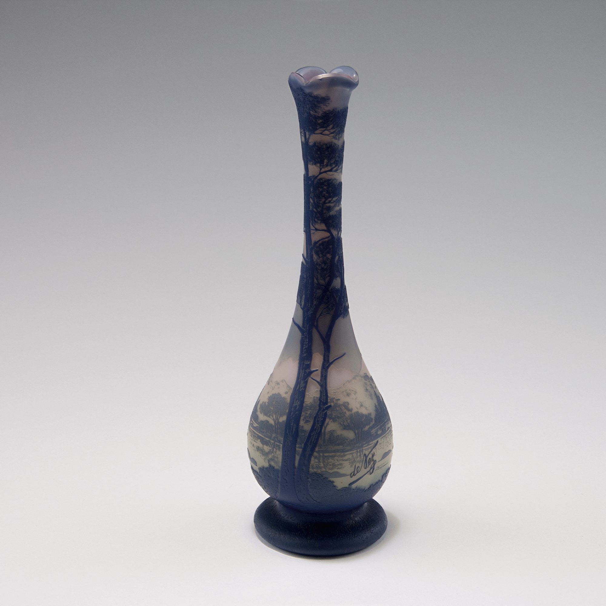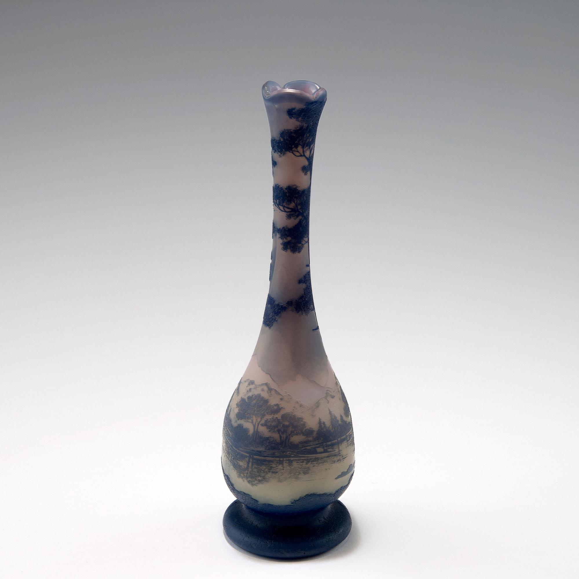 Camille Tutré de Varreux, Cristallerie de Pantin. Soliflor with moutain lake, c1915-20. H. 23 cm. Cased glass, clear, opalescent white, green and blue. Multiply etched pattern with mountain landscape and lake. Signed: de Vez.