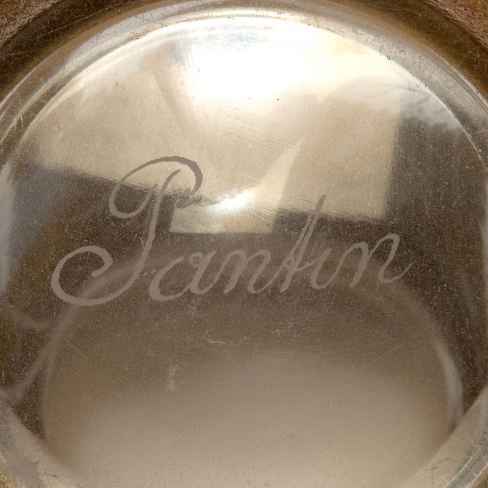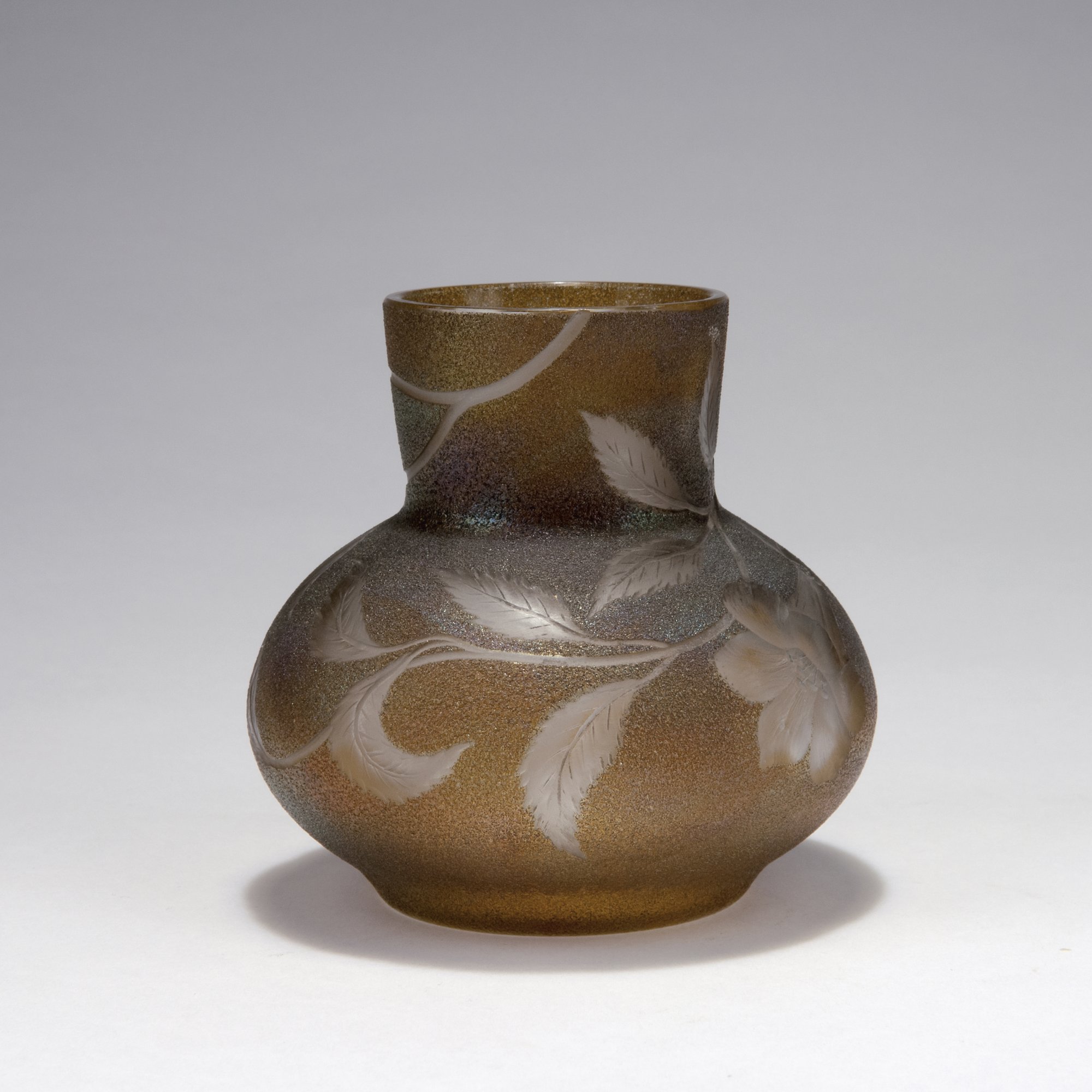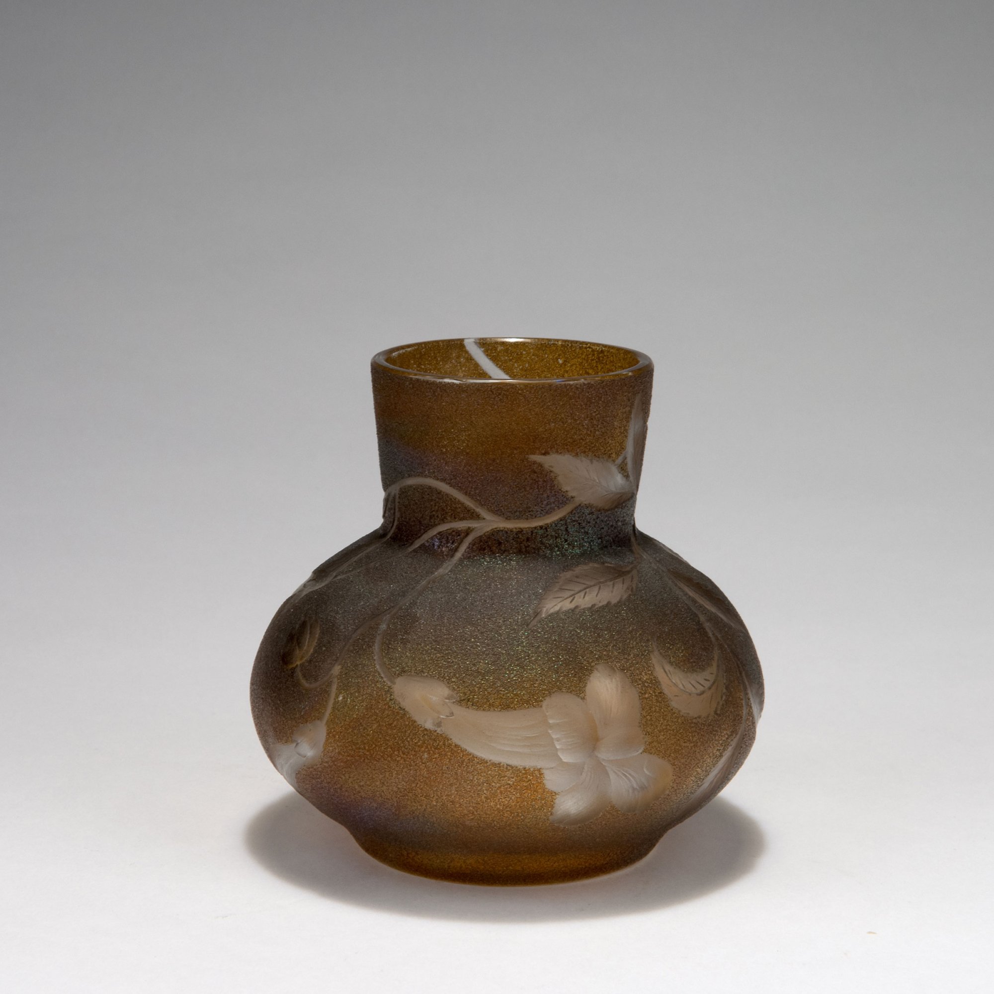 Verreries de Pantin. 'Bignone grimpante' vase, c1900. H. 10.4 cm. Clear glass, silver-yellow fusions, engraved pattern with trumpet flowers, metallic lustre. Signed: Pantin.