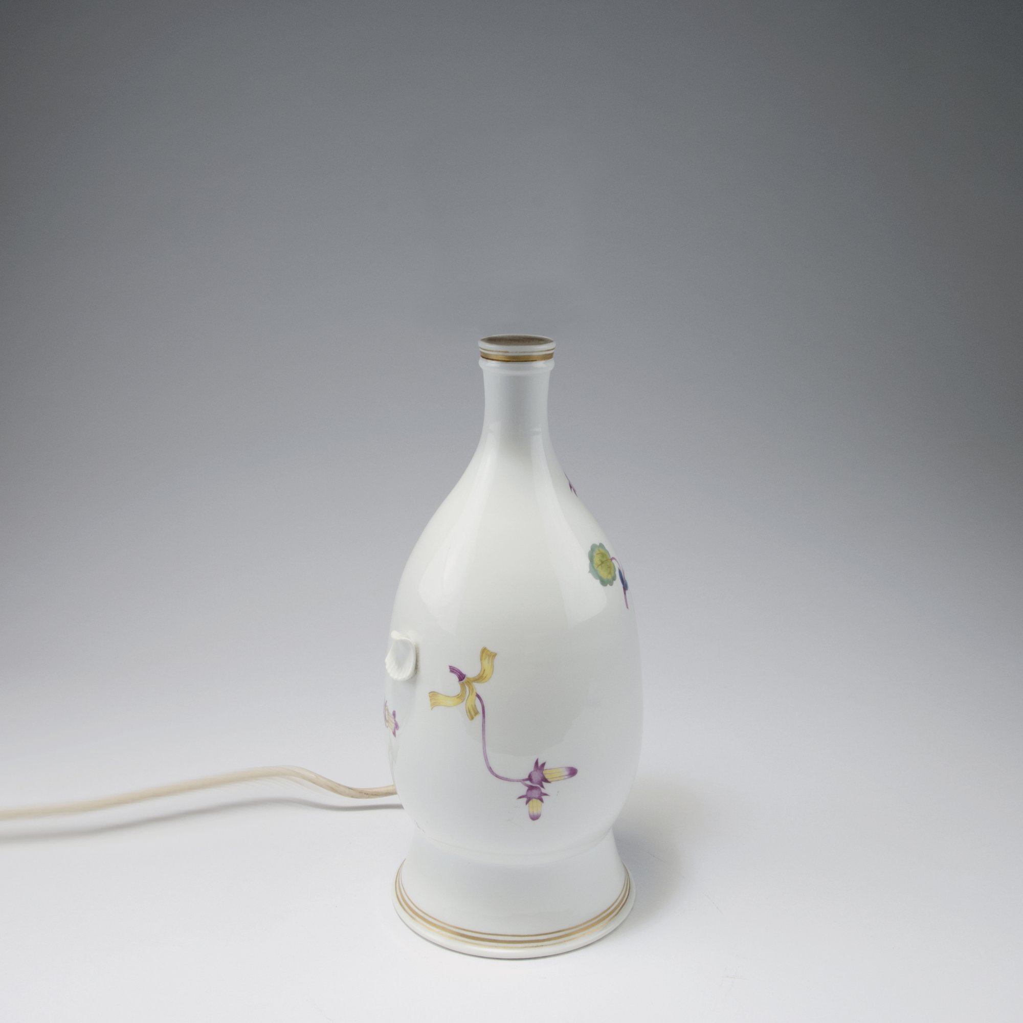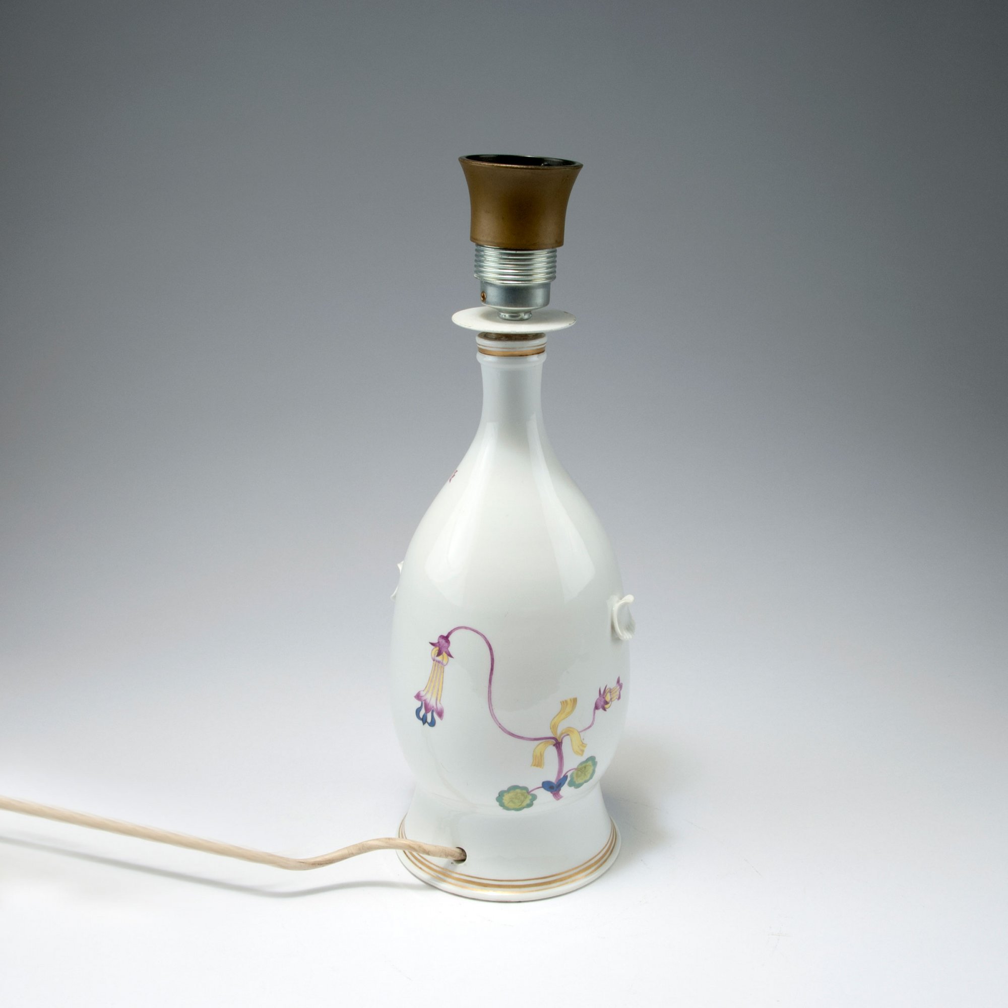 Paul Börner. Lamp base, c1925. H. 36.5 cm. Made by StPM Meissen, between 1924-33. Porcelain, white, glazed, polychromatic overglaze. Flowers. Marked: Maker's mark.