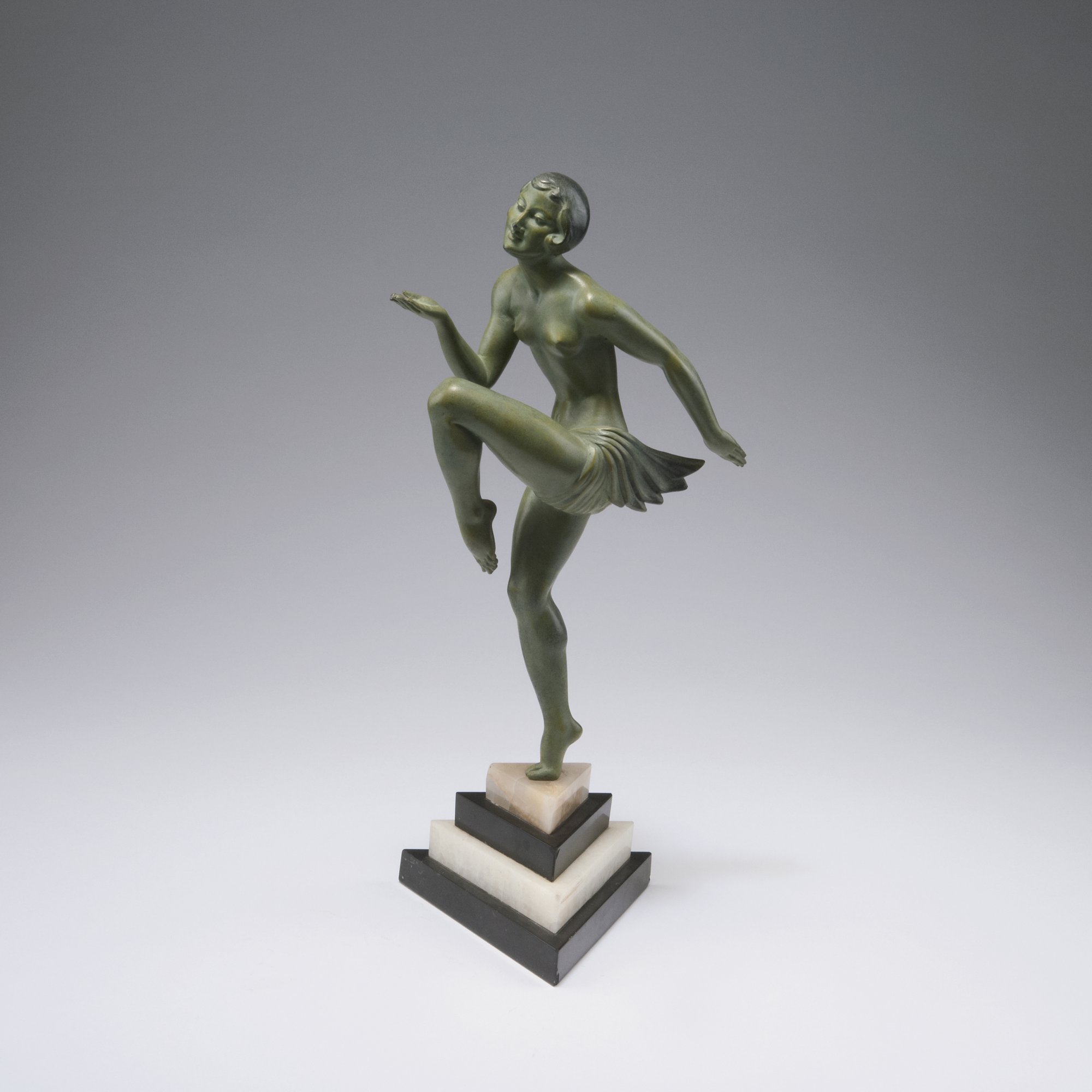 Pierre Le Faguays. Dancer, 1920s. H. 41 cm (incl. base). Spelter, green patina, base of white onyx and slate. Marked: FRANCE (faint).