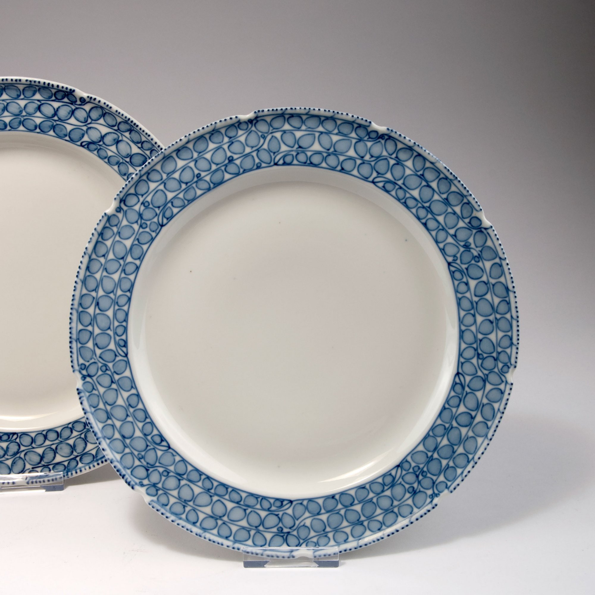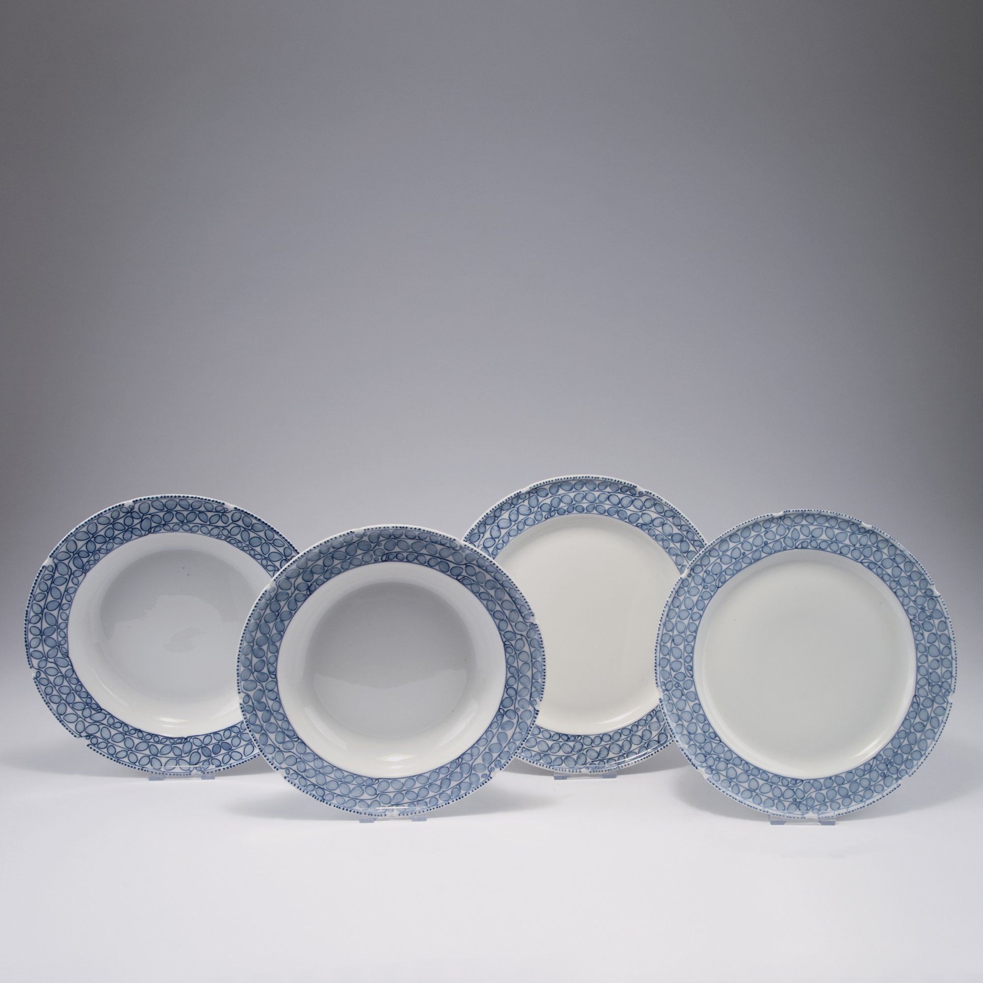 Richard Riemerschmid. Two dining plates and two soup plates, 1903-05. D. 24.5-26 cm. Made by KPM Meissen, prior to 1924. Porcelain, white, glazed, blue underglaze. Marked: Maker's mark, 74, 1601, 82 resp. 1604, 55 resp. 1 22.
