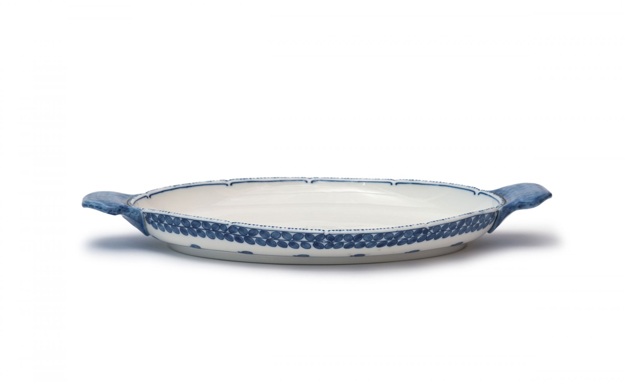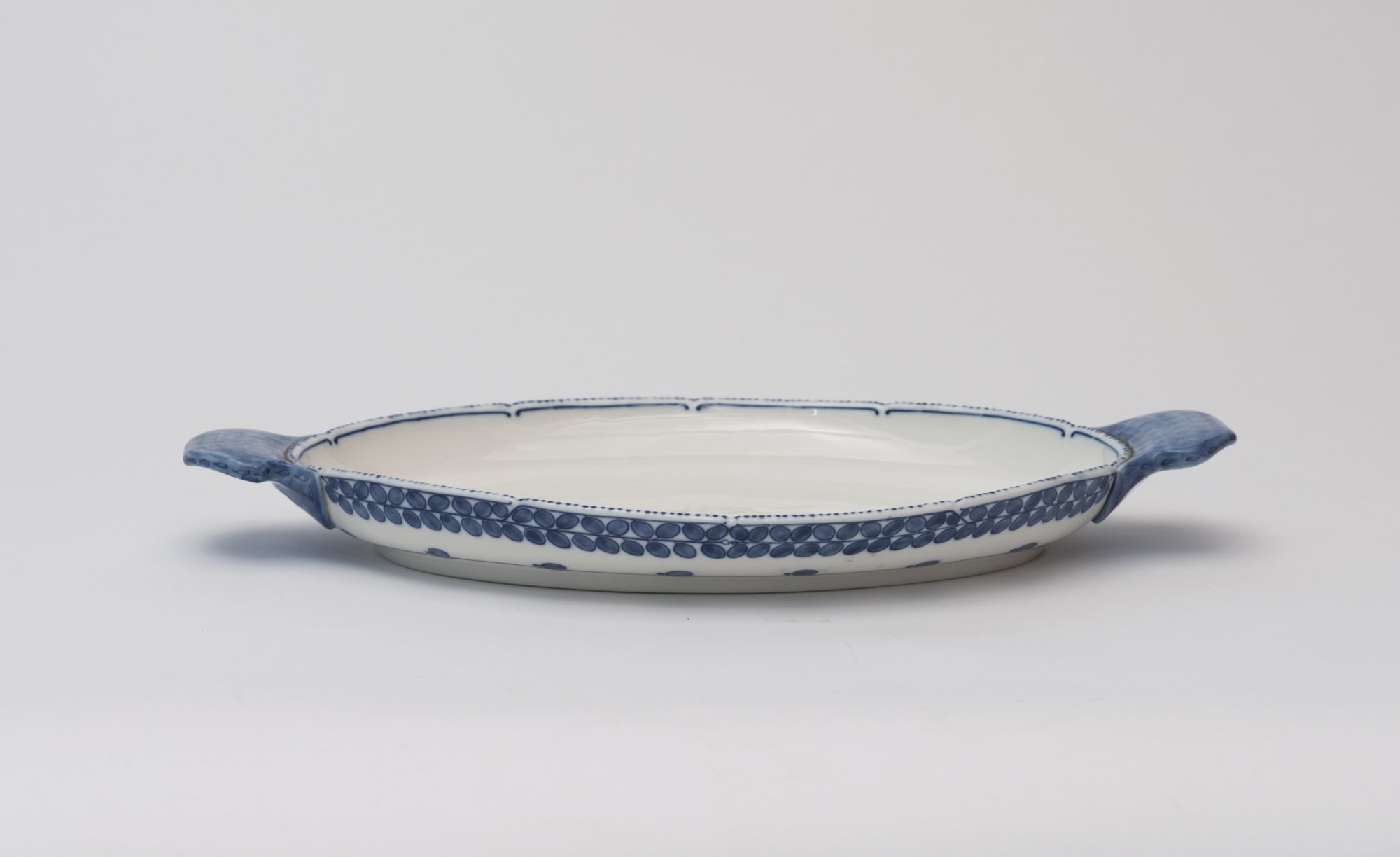 Richard Riemerschmid. Small platter, 1903-05. 38.5 x 21.4 cm. Made by StPM Meissen. Porcelain, white, glazed, blue underglaze. Marked: Maker's mark, 61a 2 (two strokes), 16 18 64.