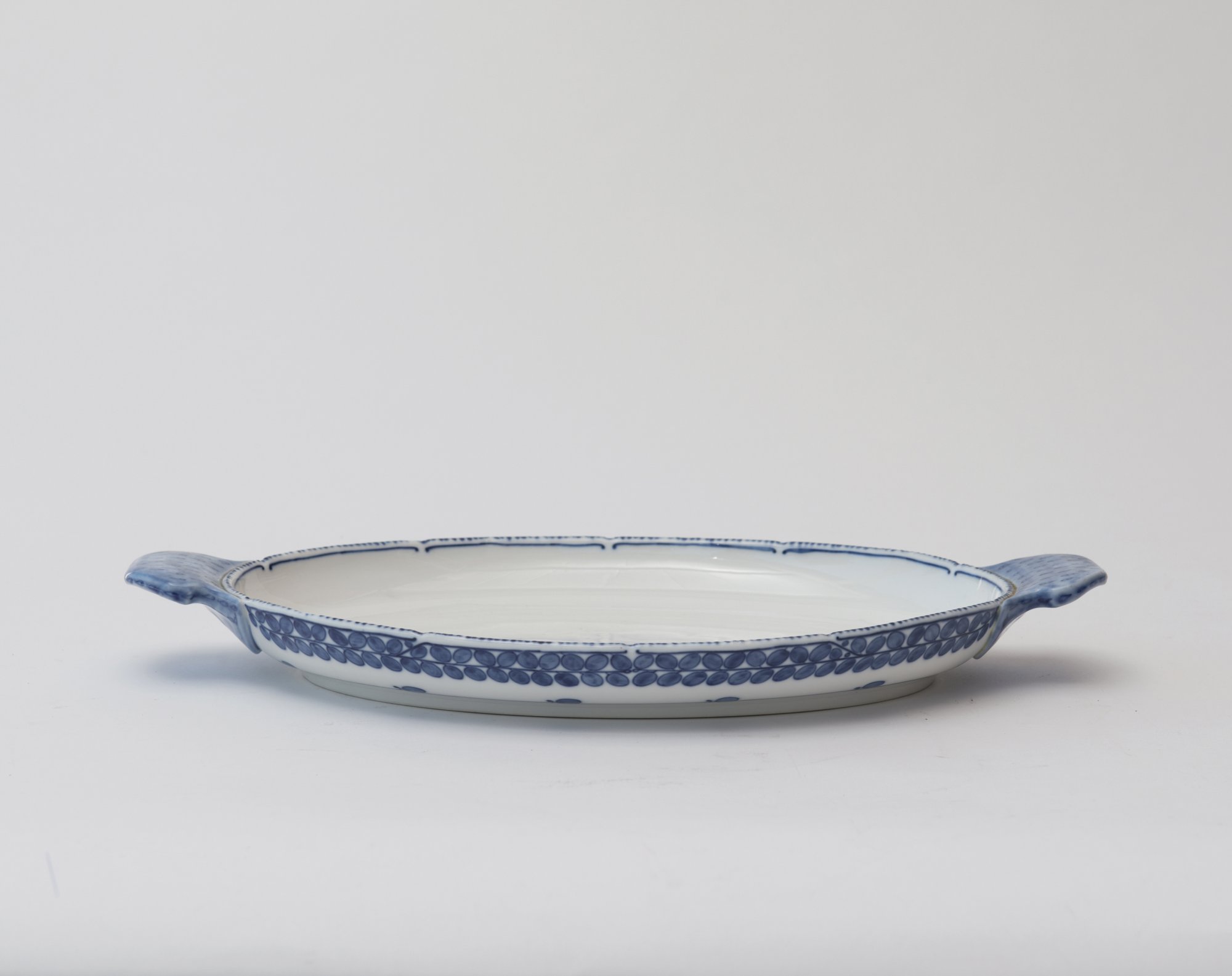 Richard Riemerschmid. Small platter, 1903-05. 38.3 x 21.3 cm. Made by StPM Meissen. Porcelain, white, glazed, blue underglaze. Marked: Maker's mark, 61a2, 16 18 64.