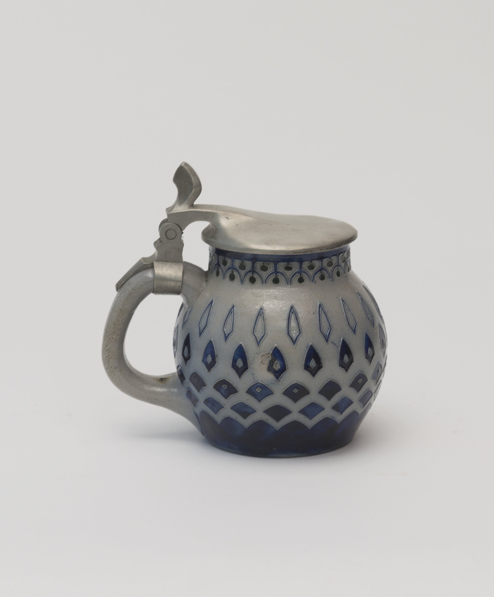 Richard Riemerschmid. Beerstein, 1902. H. 14.9 cm. Made by Reinhold Merkelbach, Grenzhausen. Stoneware, grey salt glaze, cobalt décor. Pewter lid. Marked: D 1728.