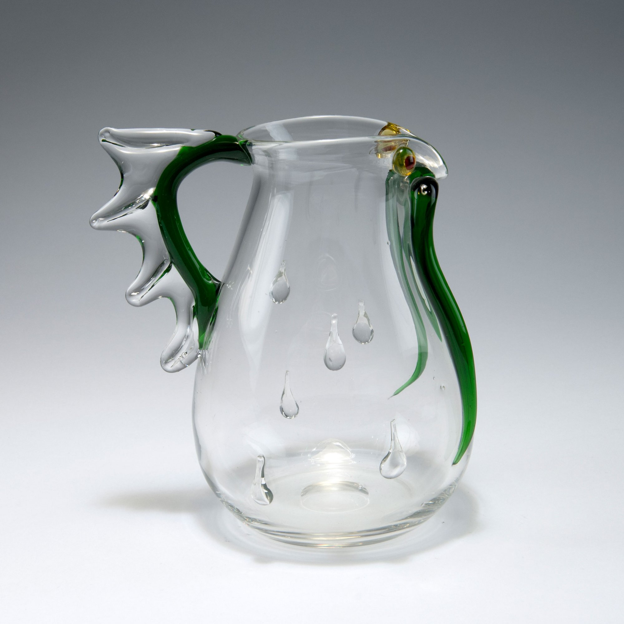 Loetz, Klostermühle. 'Merman' jug, 1906. H. 16.7 cm. Designed by Richard Teschner. Clear crystal glass, clear applications, green moustache and handle.